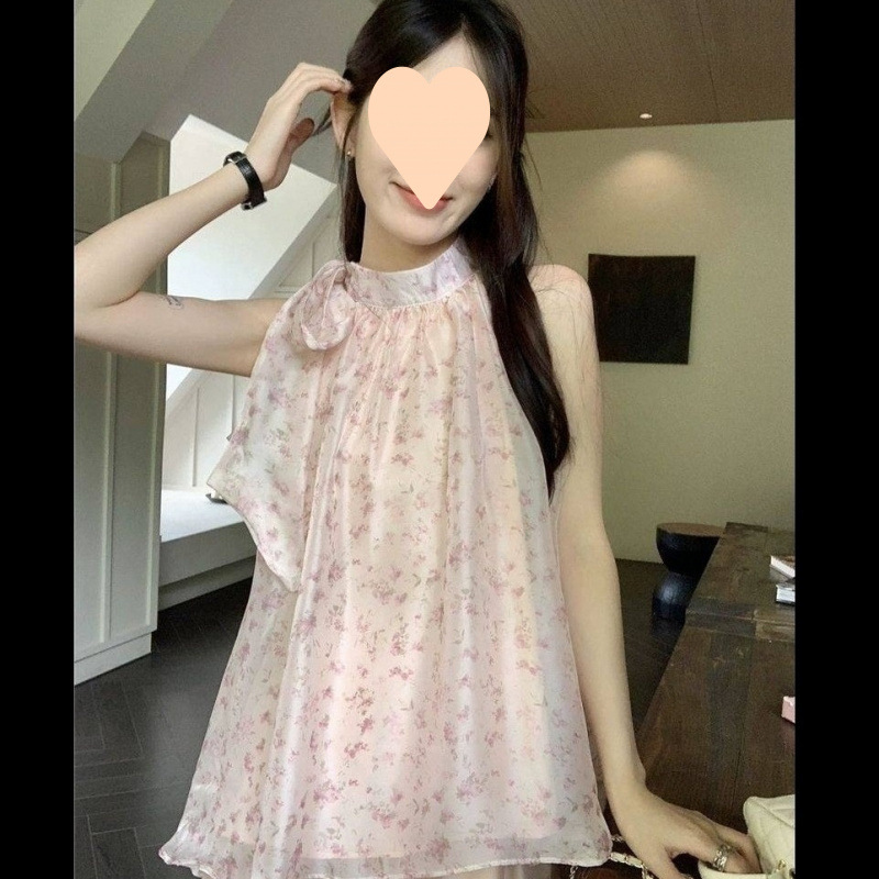 여성을 위한 작고 상큼한 홀터넥 오프숄더 셔츠 탑, 여성을 위한 순수하고 달콤한 쉬폰 꽃무늬 얇은 배를 덮는 패셔너블한 조끼스토어 가기