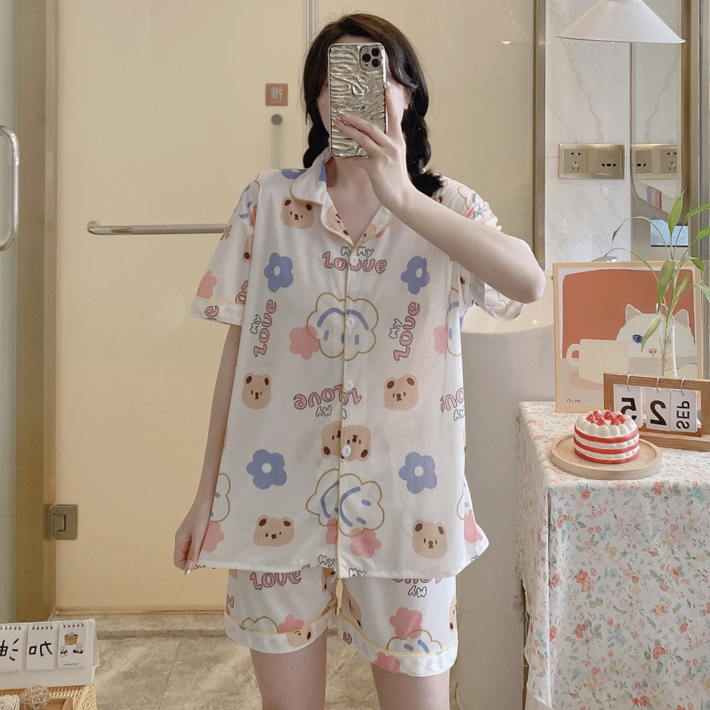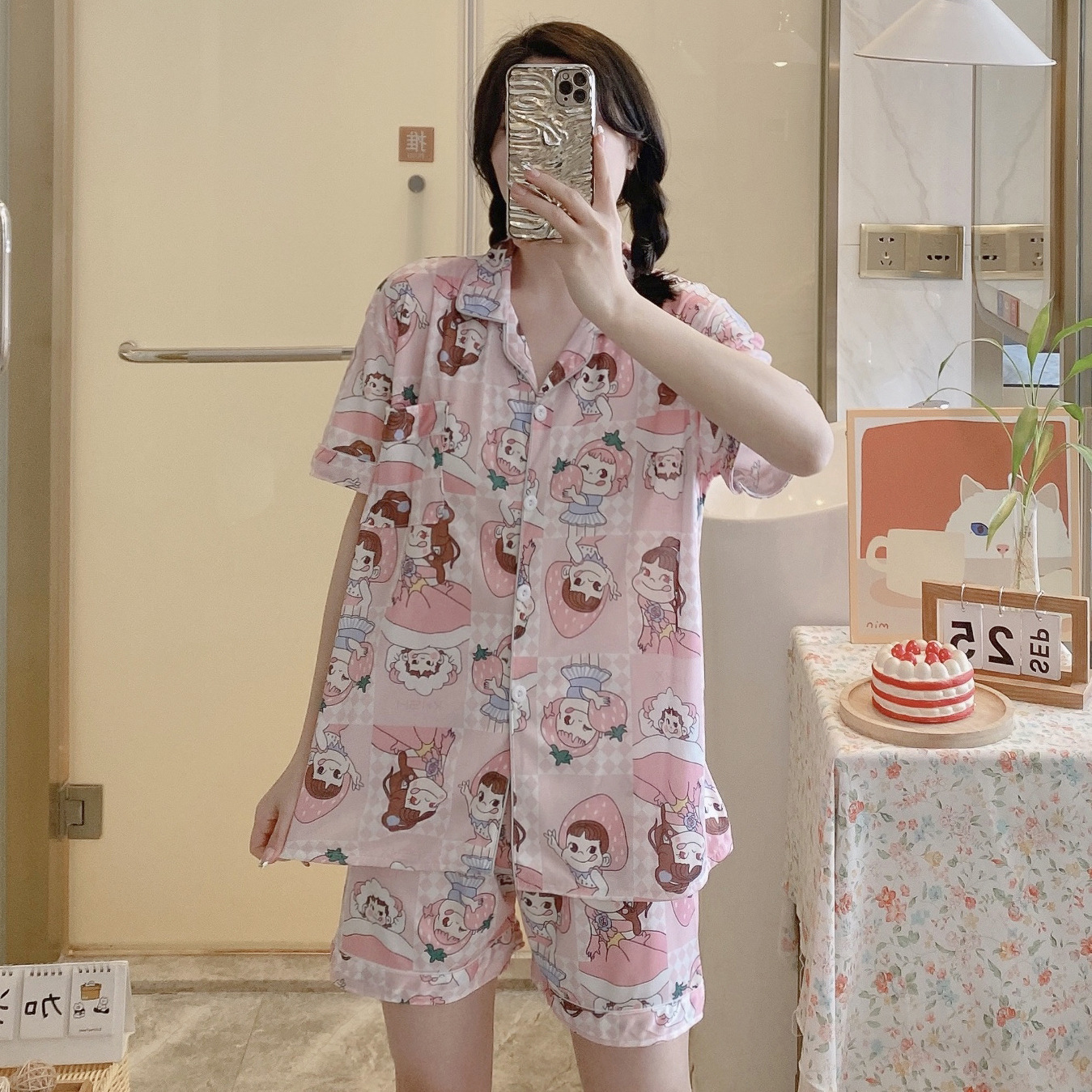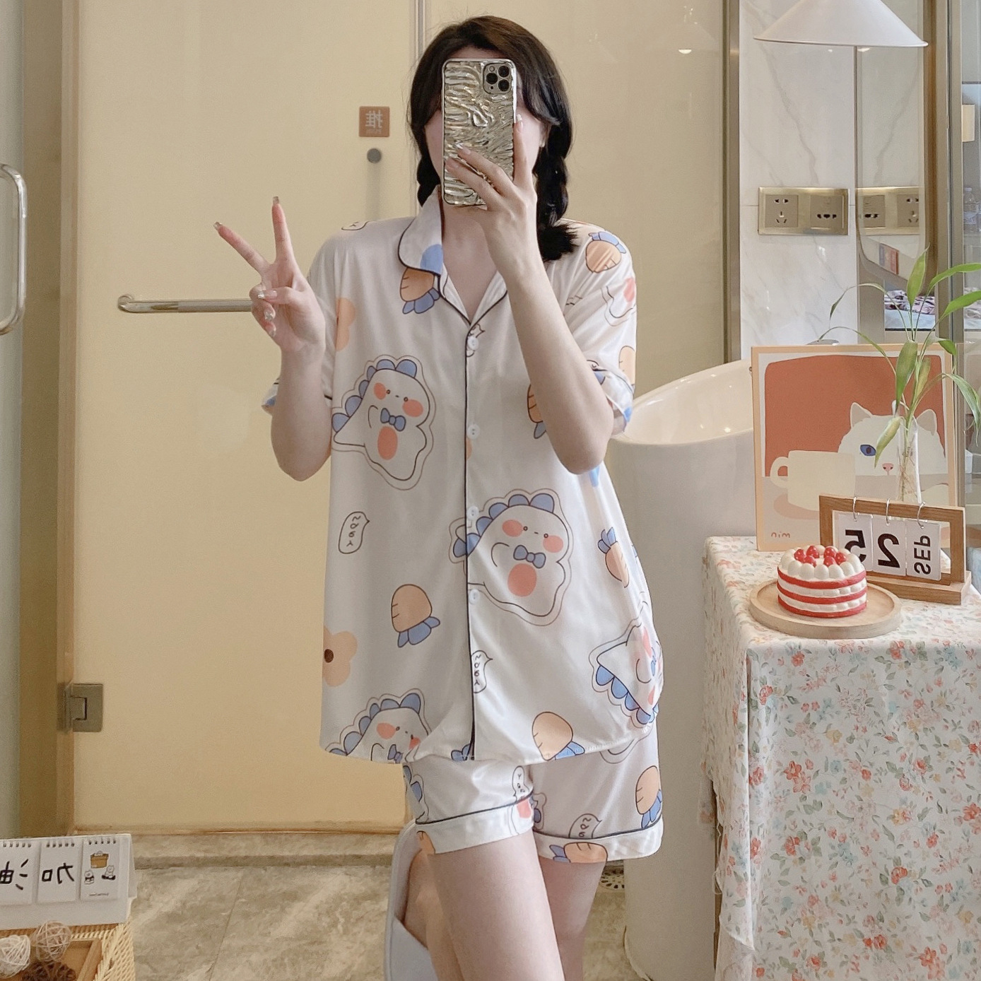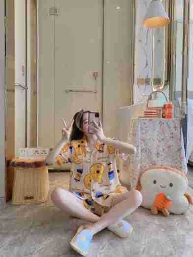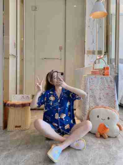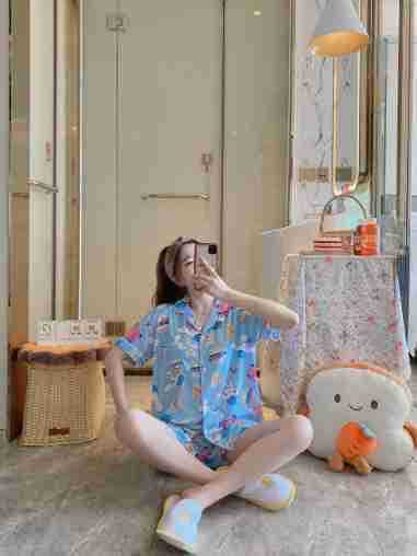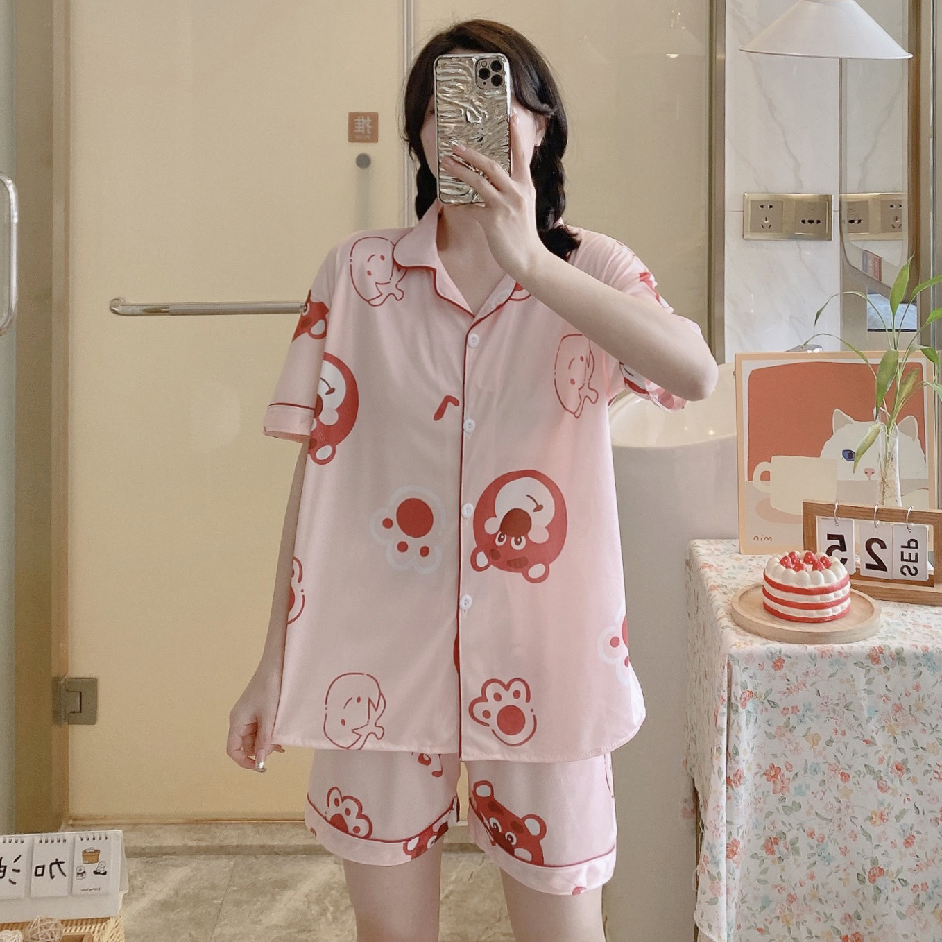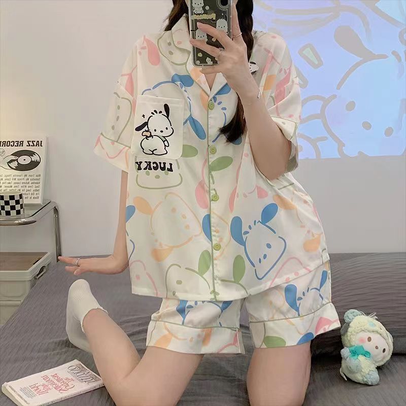 느슨한 인터넷 연예인 잠옷 새로운 디자인 만화 한국어 버전 멜로 반바지 여름 투피스 세트 소규모 사업 여성 반팔 가정복스토어 가기
