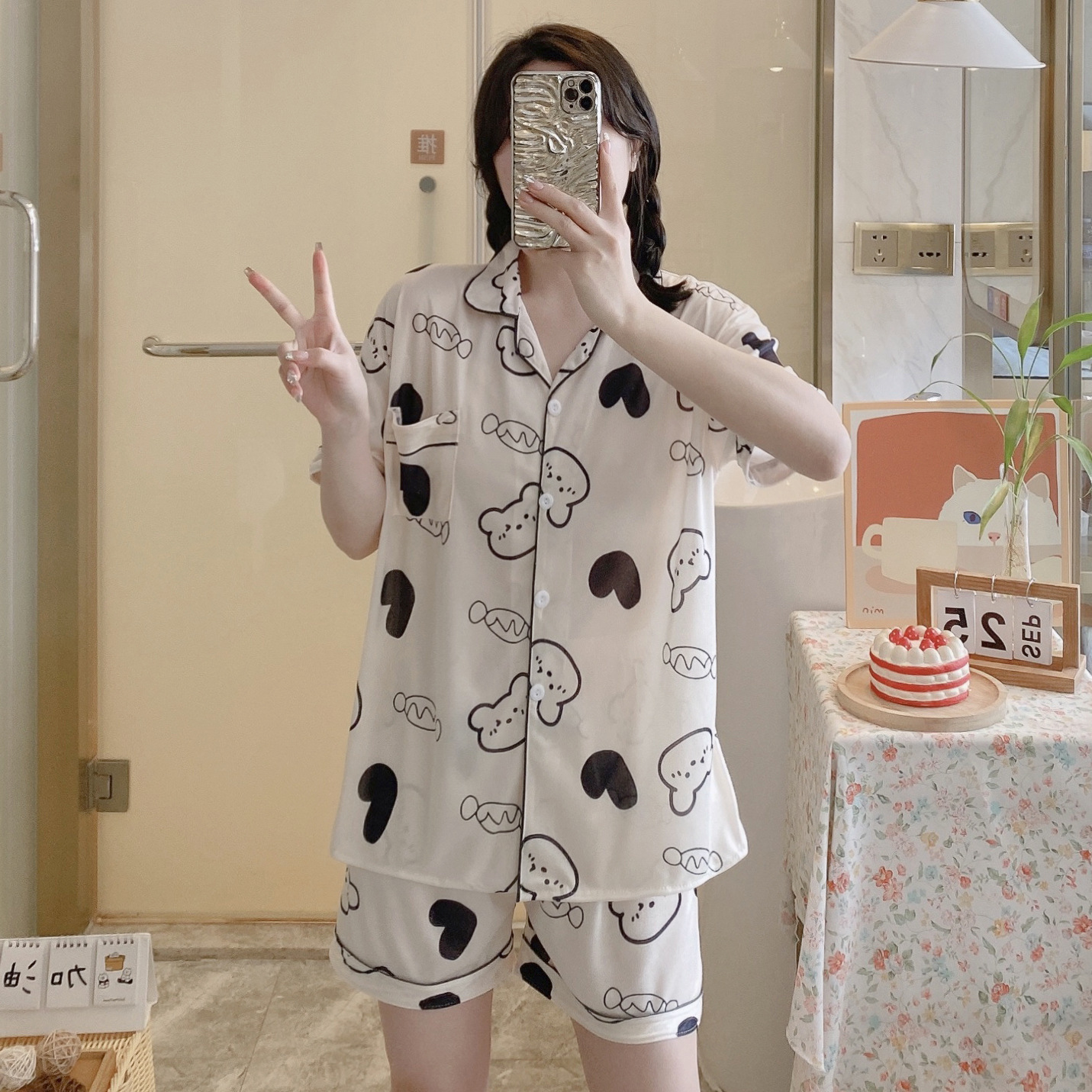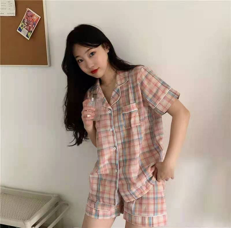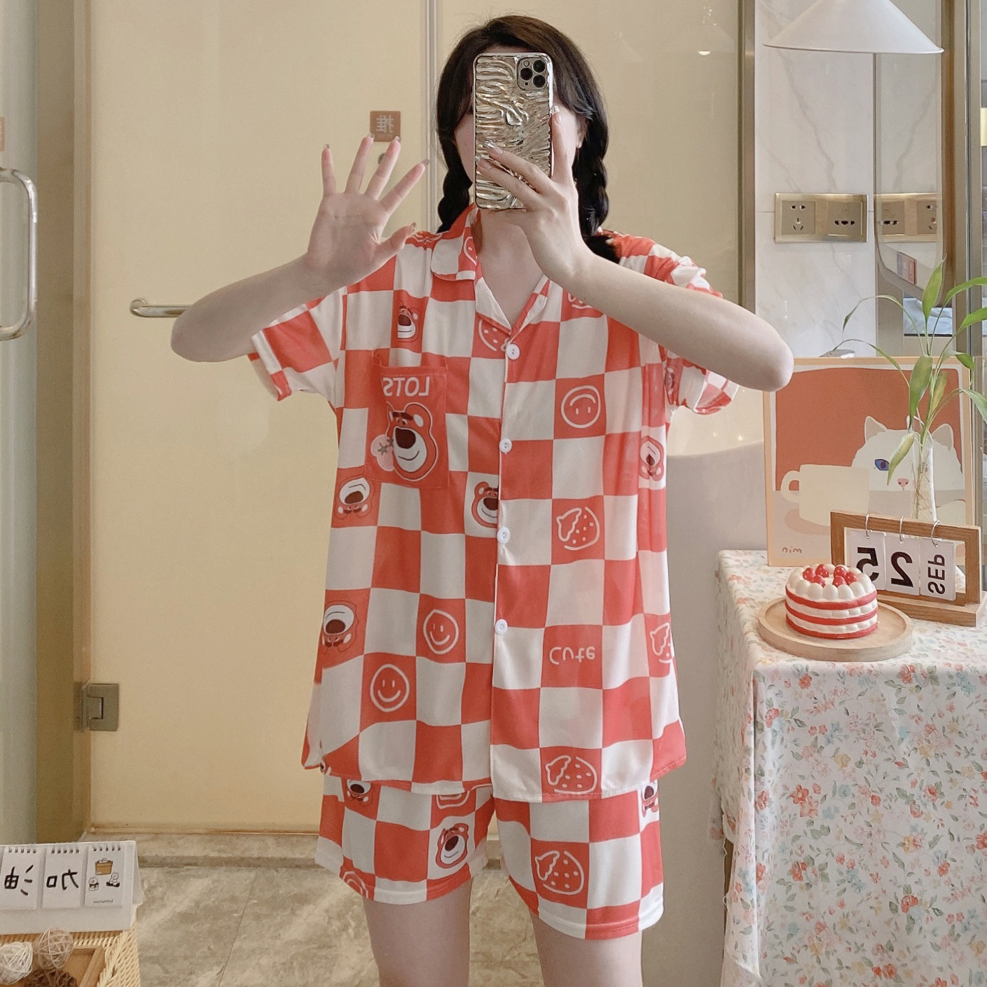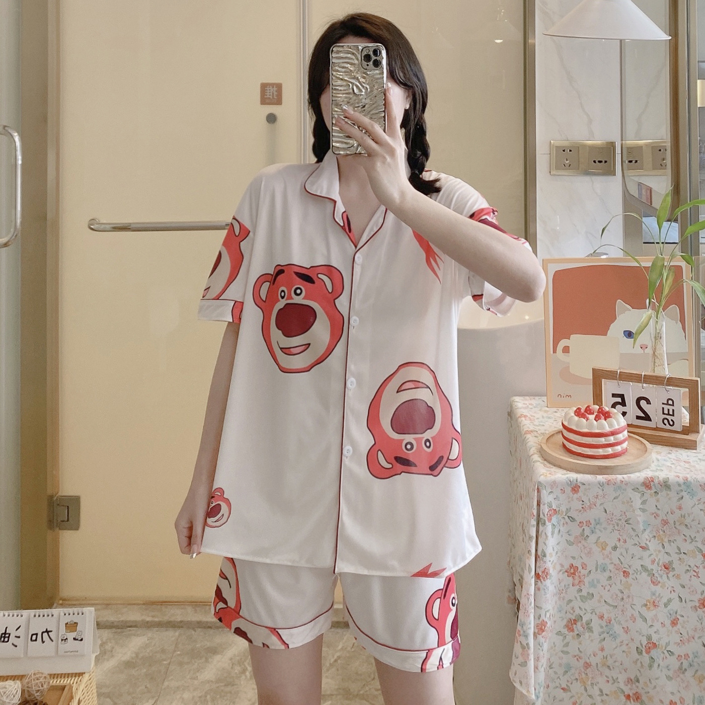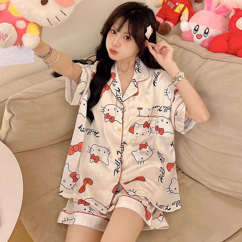 느슨한 인터넷 연예인 잠옷 새로운 디자인 만화 한국어 버전 멜로 반바지 여름 투피스 세트 소규모 사업 여성 반팔 가정복스토어 가기