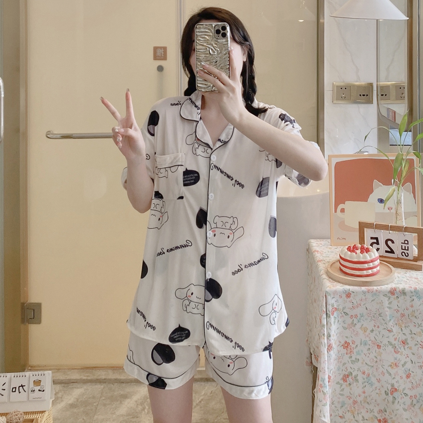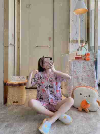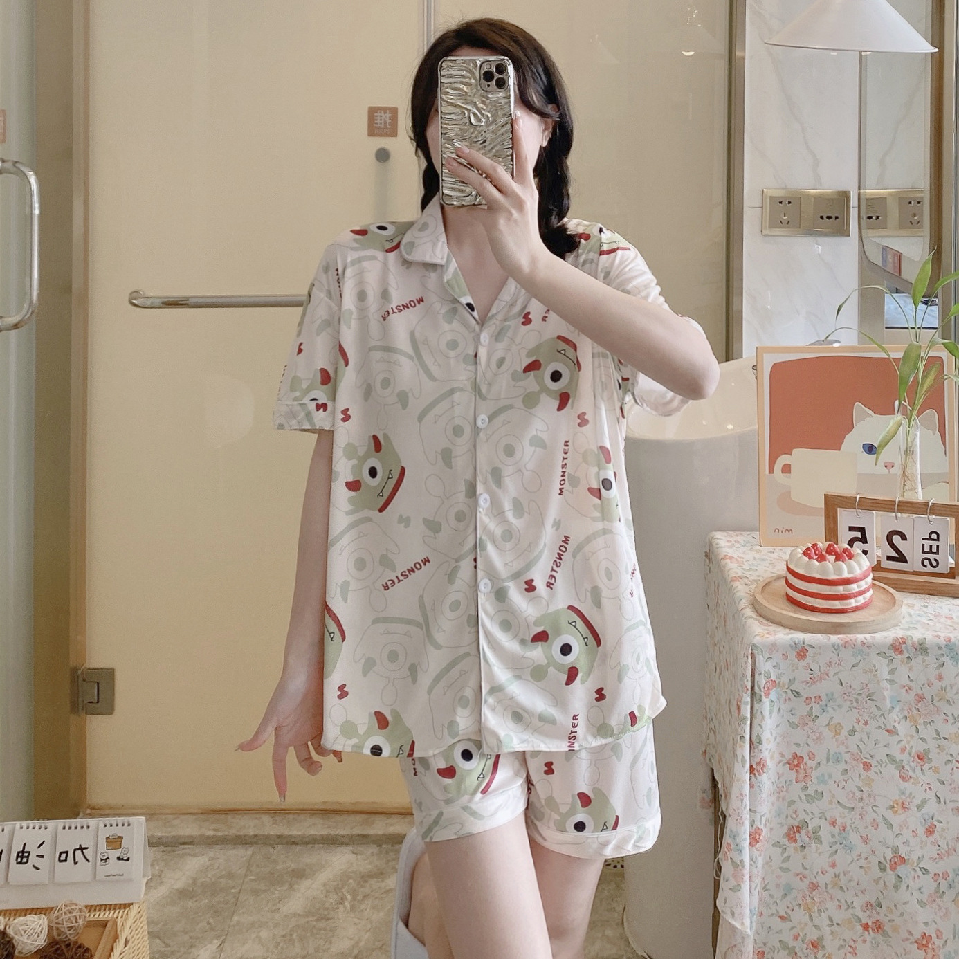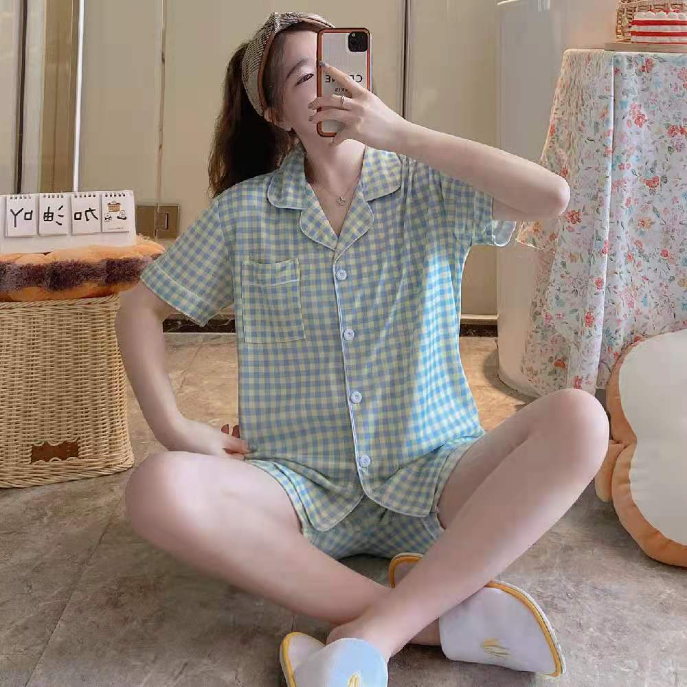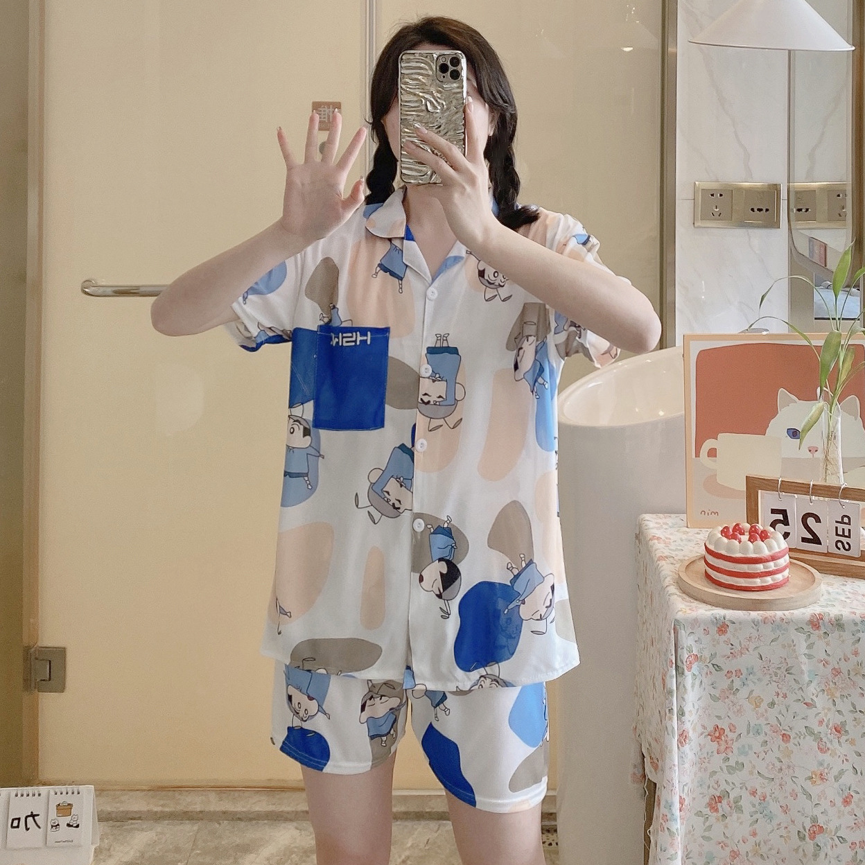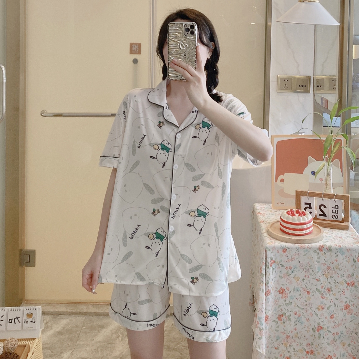 느슨한 인터넷 연예인 잠옷 새로운 디자인 만화 한국어 버전 멜로 반바지 여름 투피스 세트 소규모 사업 여성 반팔 가정복스토어 가기
