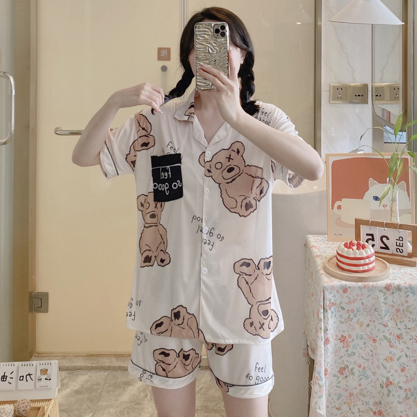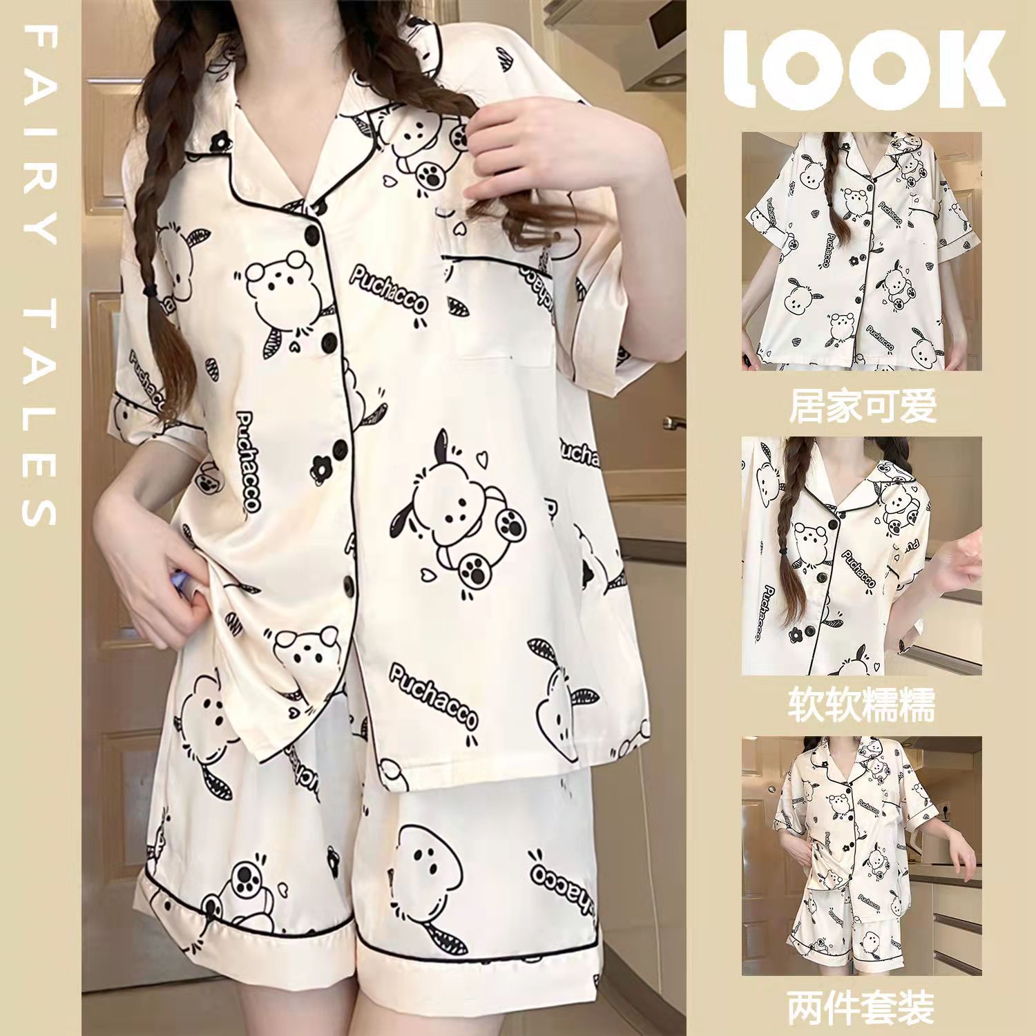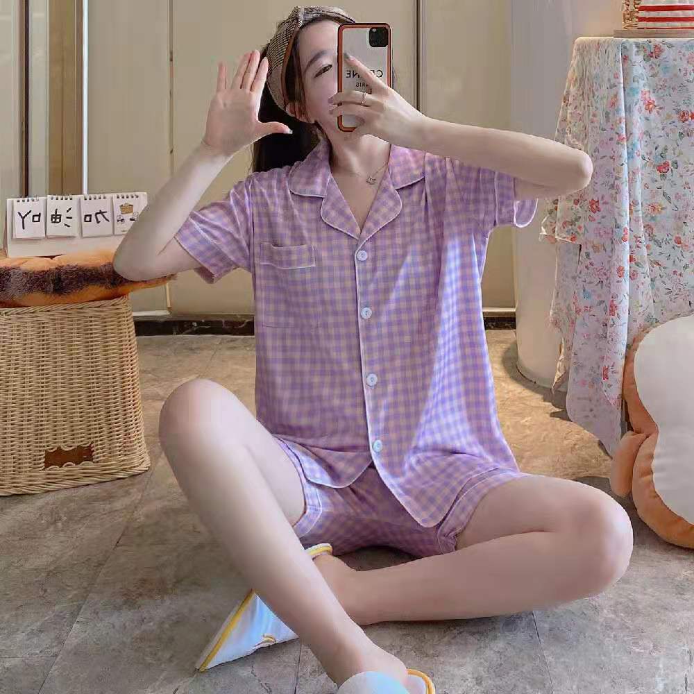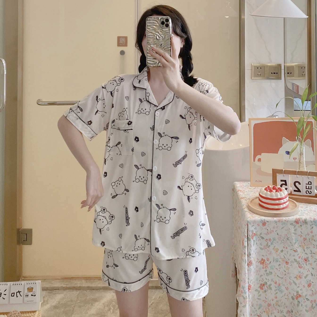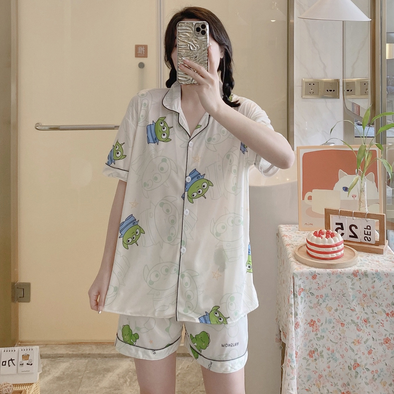 느슨한 인터넷 연예인 잠옷 새로운 디자인 만화 한국어 버전 멜로 반바지 여름 투피스 세트 소규모 사업 여성 반팔 가정복스토어 가기