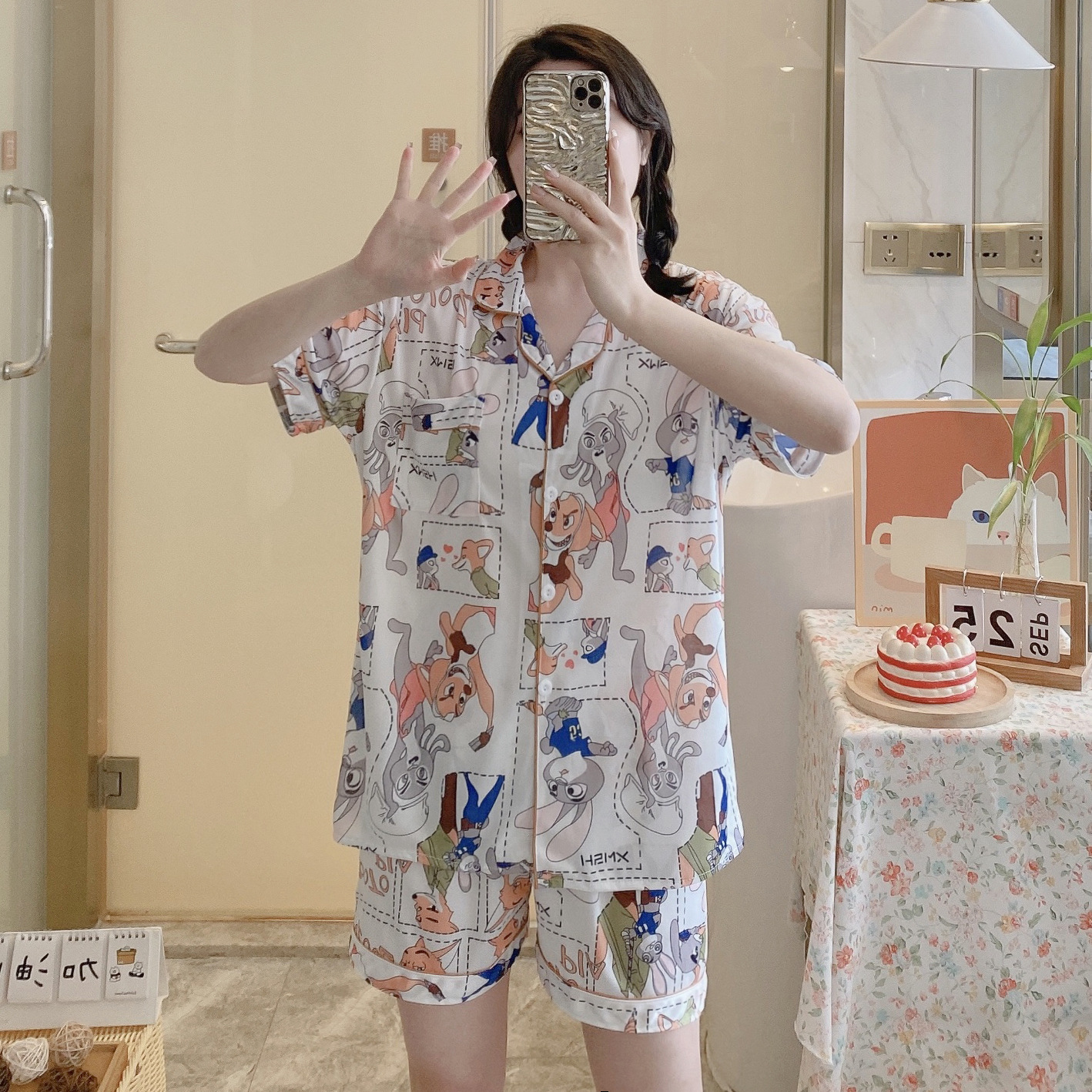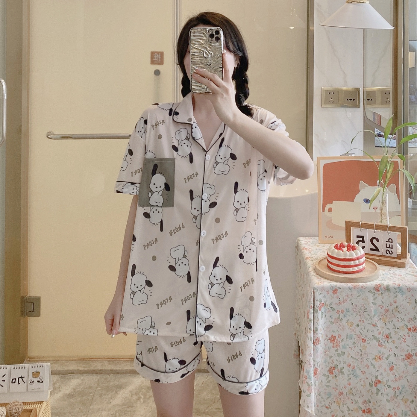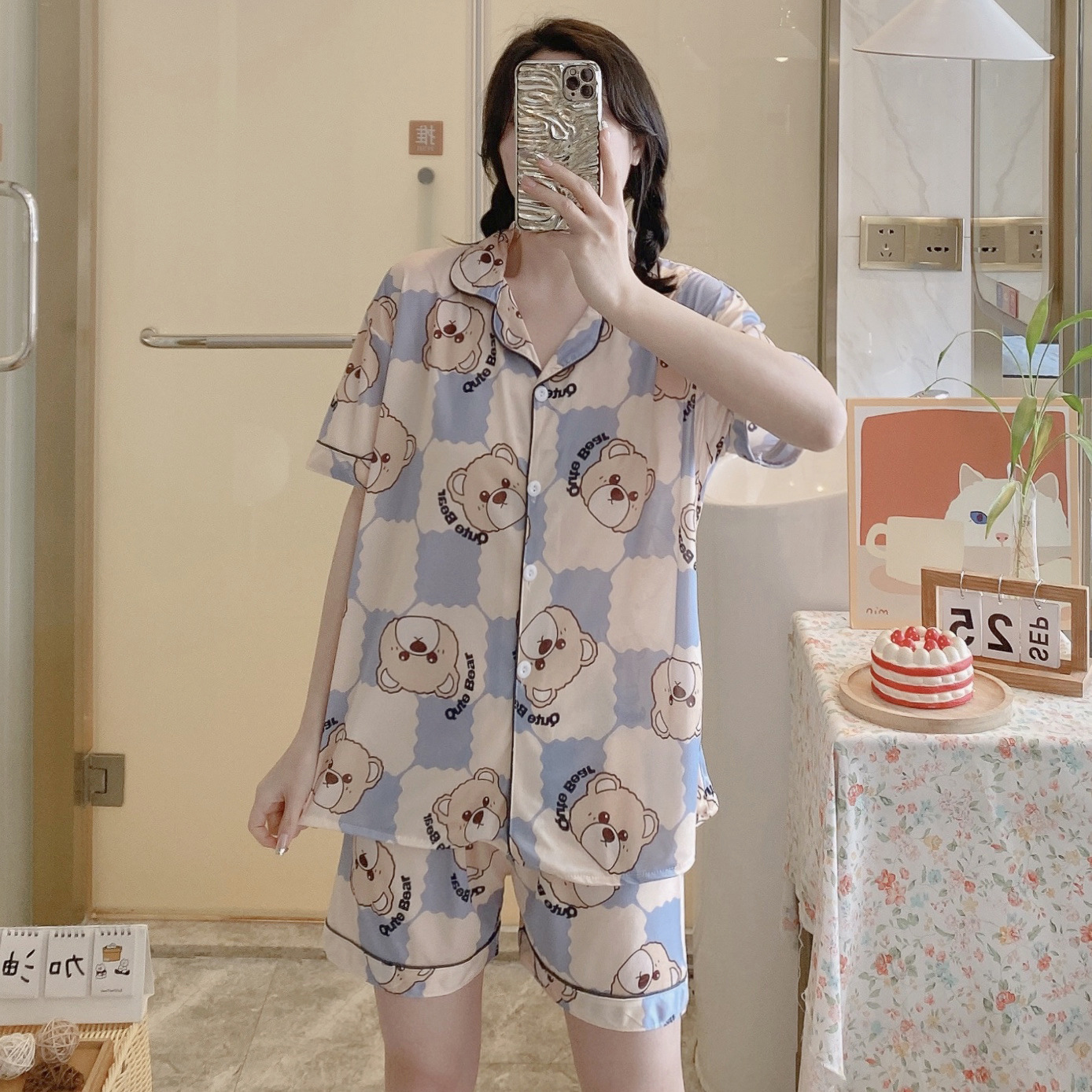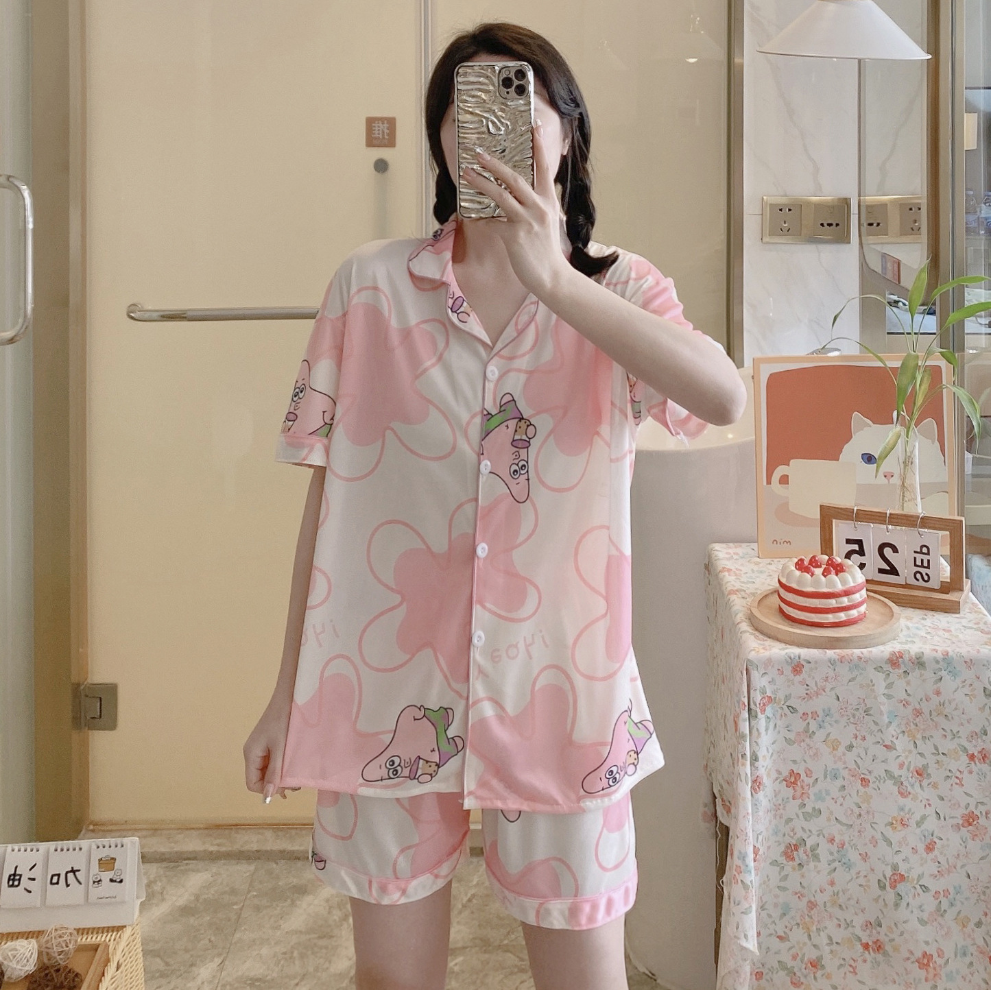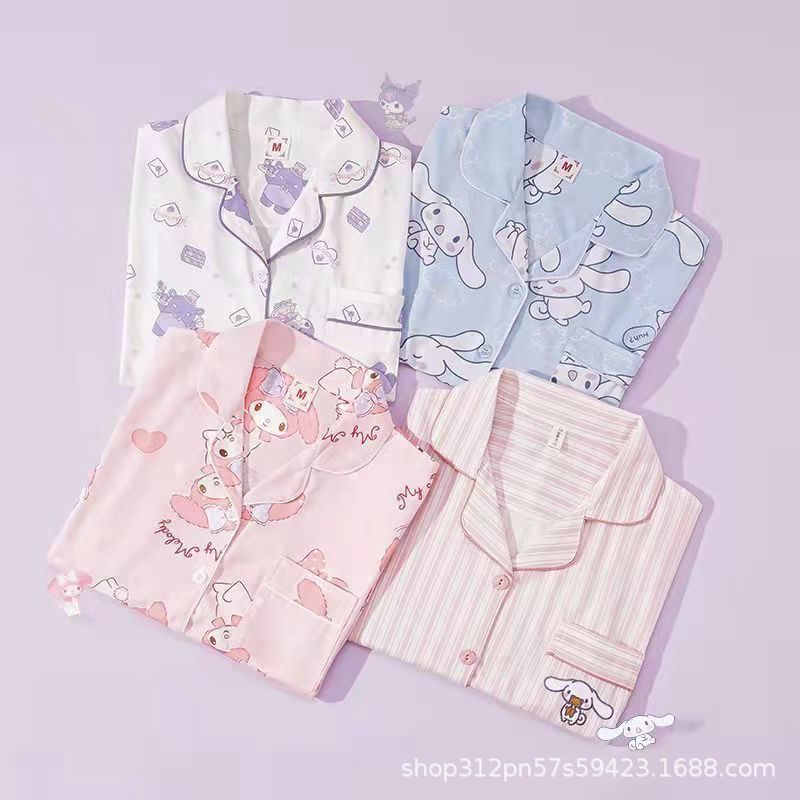 느슨한 인터넷 연예인 잠옷 새로운 디자인 만화 한국어 버전 멜로 반바지 여름 투피스 세트 소규모 사업 여성 반팔 가정복스토어 가기