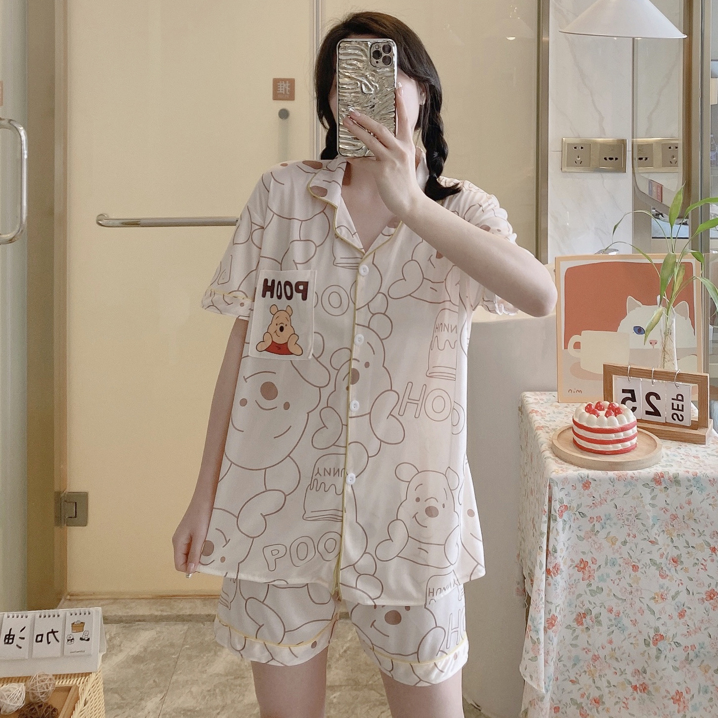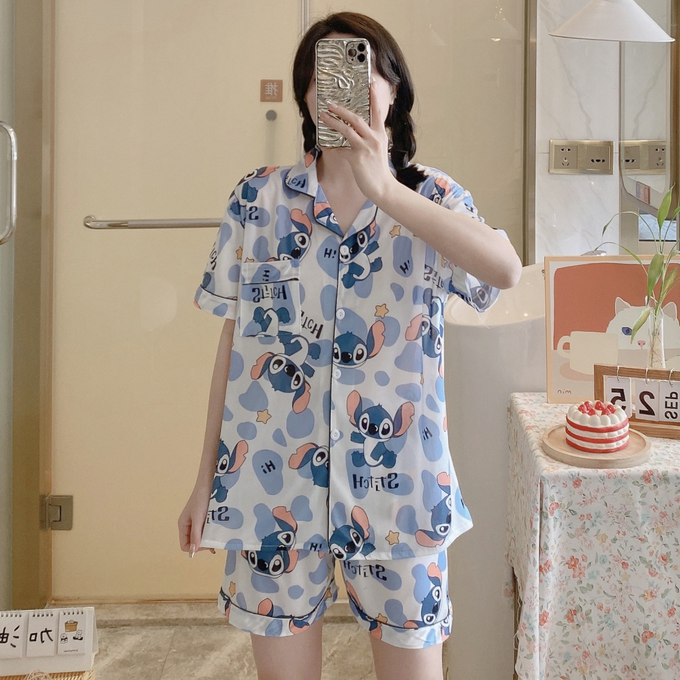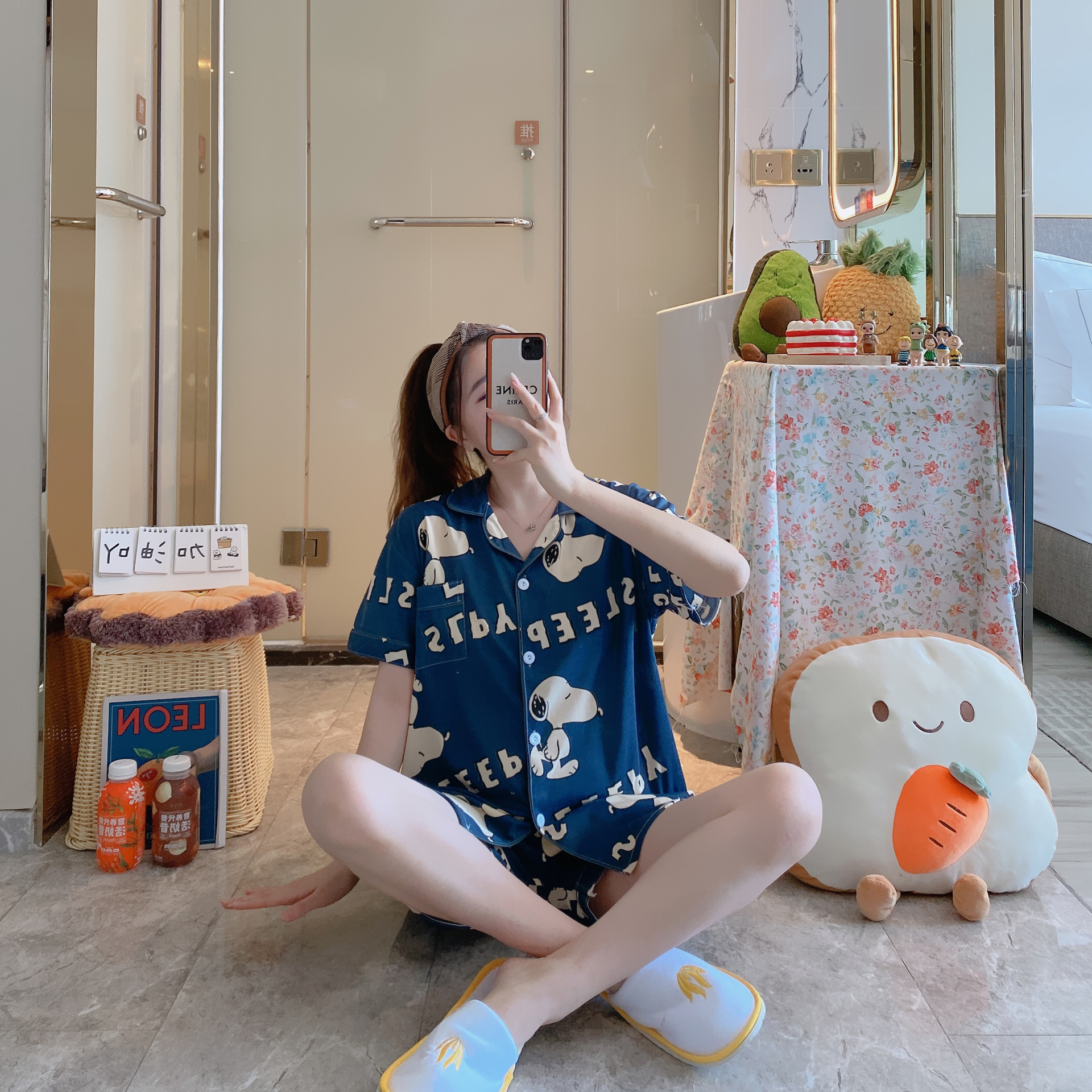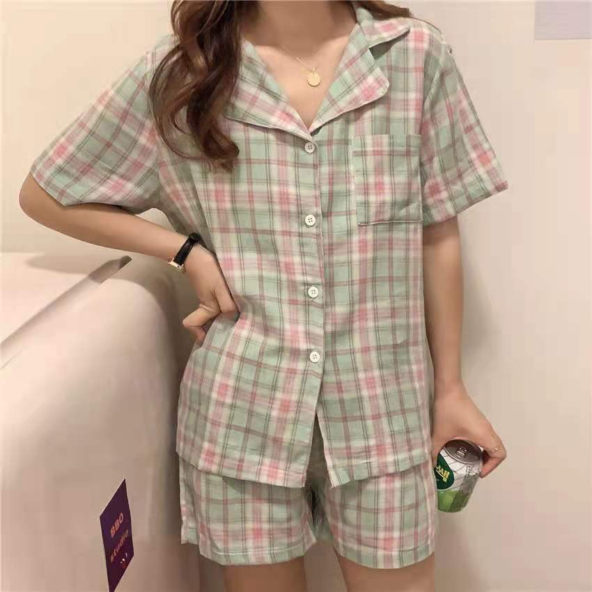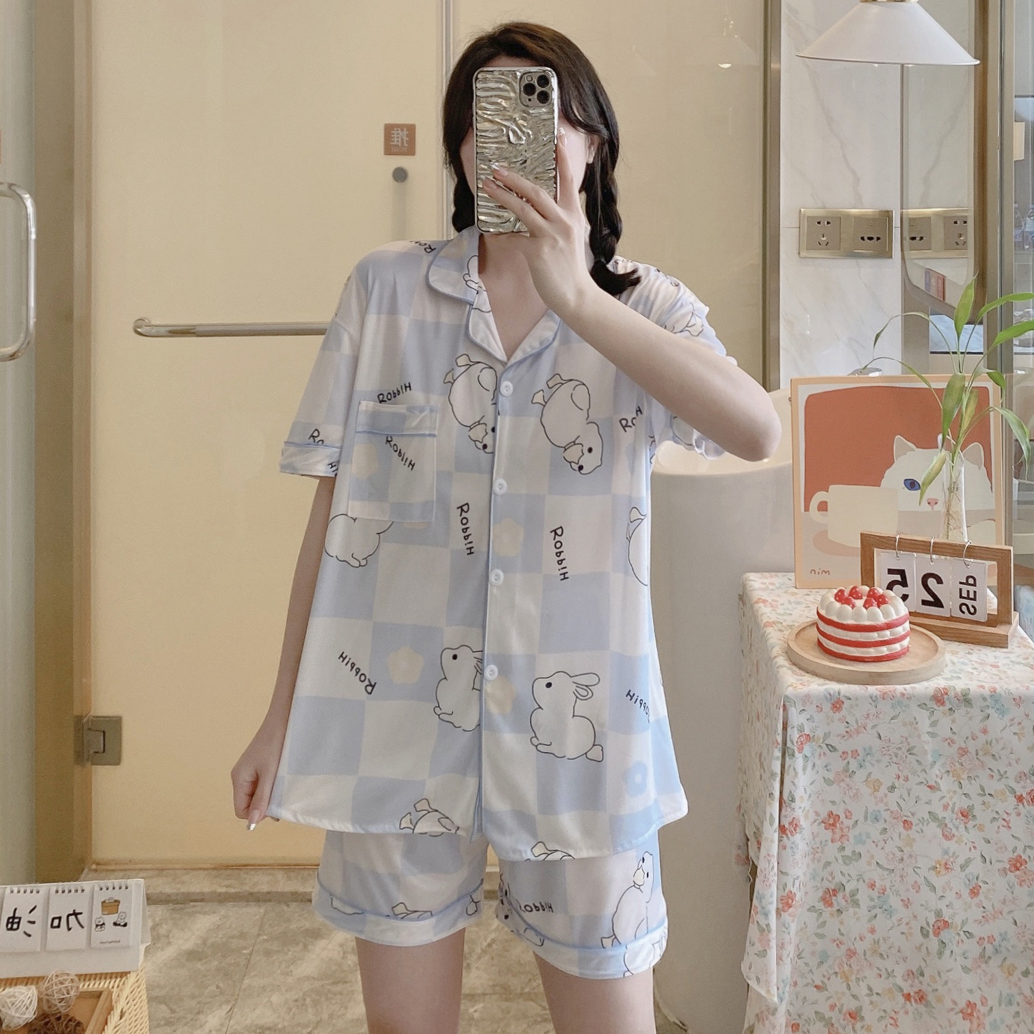느슨한 인터넷 연예인 잠옷 새로운 디자인 만화 한국어 버전 멜로 반바지 여름 투피스 세트 소규모 사업 여성 반팔 가정복스토어 가기