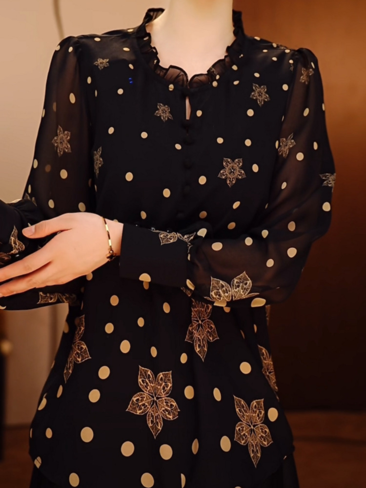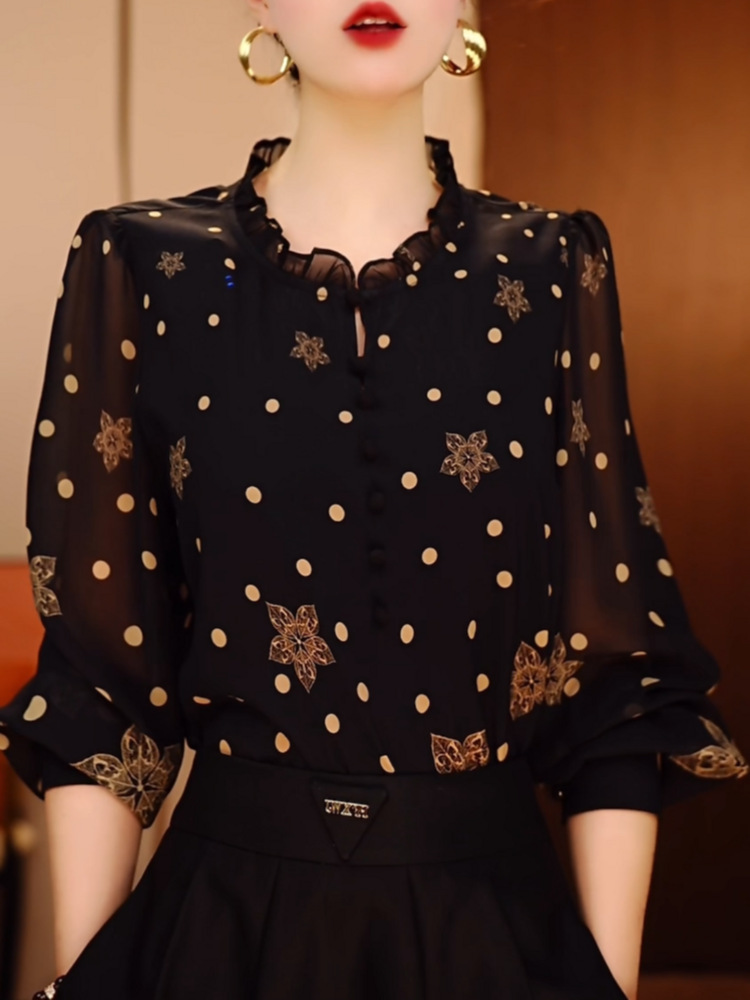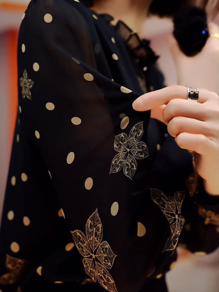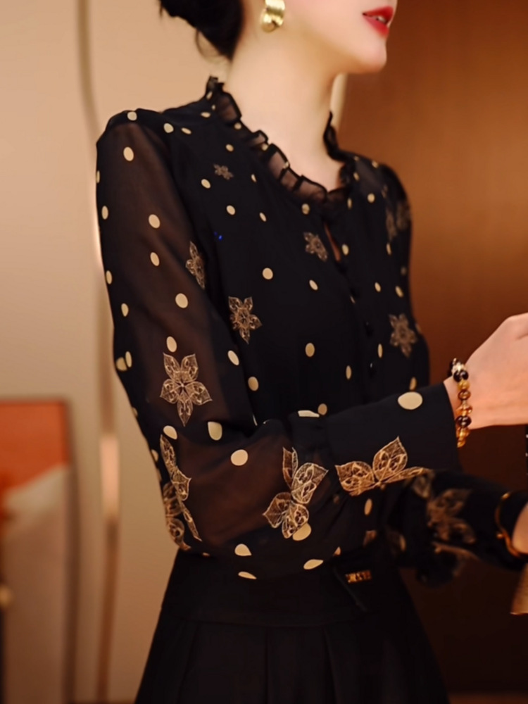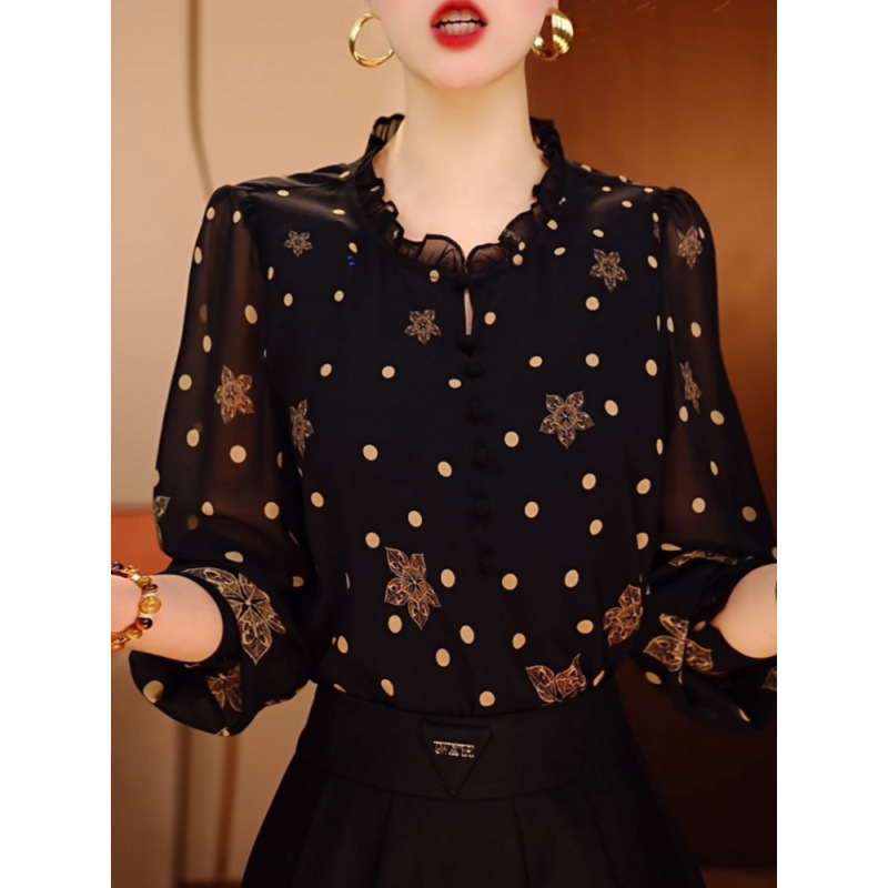 여성용 프렌치 브이넥 블랙 탑 2025 봄 신상 하이엔드 스타일 감년 얇은 긴팔 꽃무늬 셔츠스토어 가기