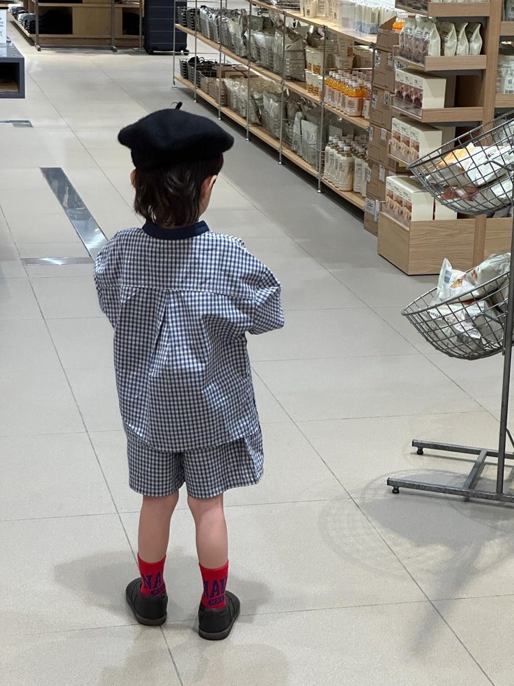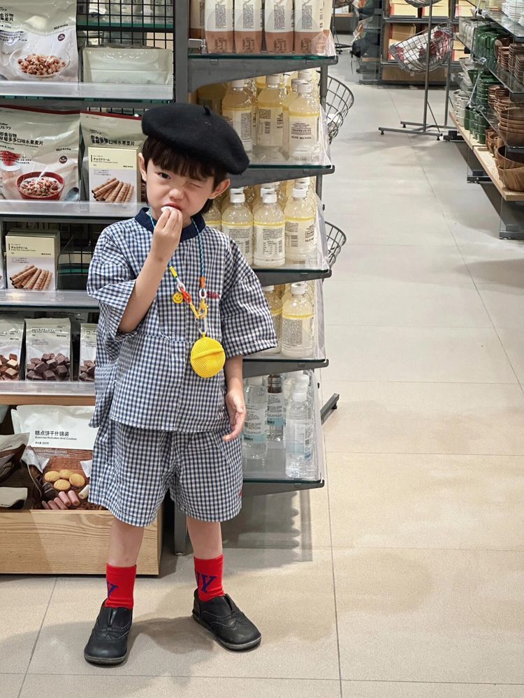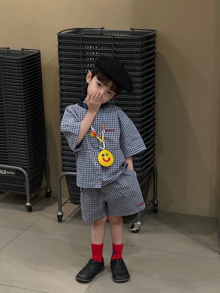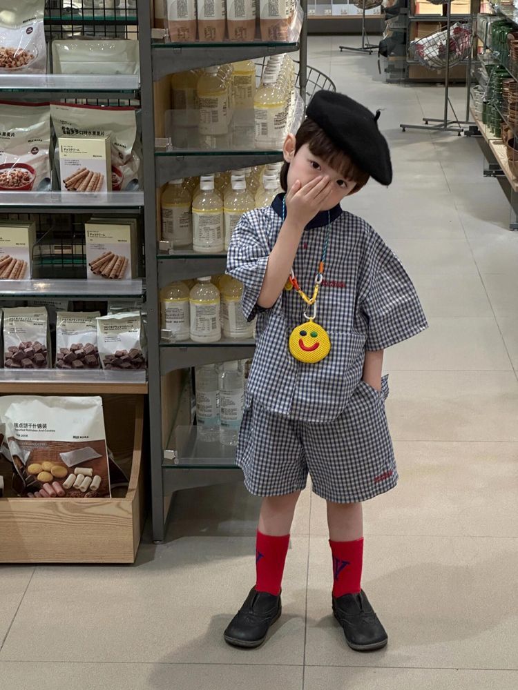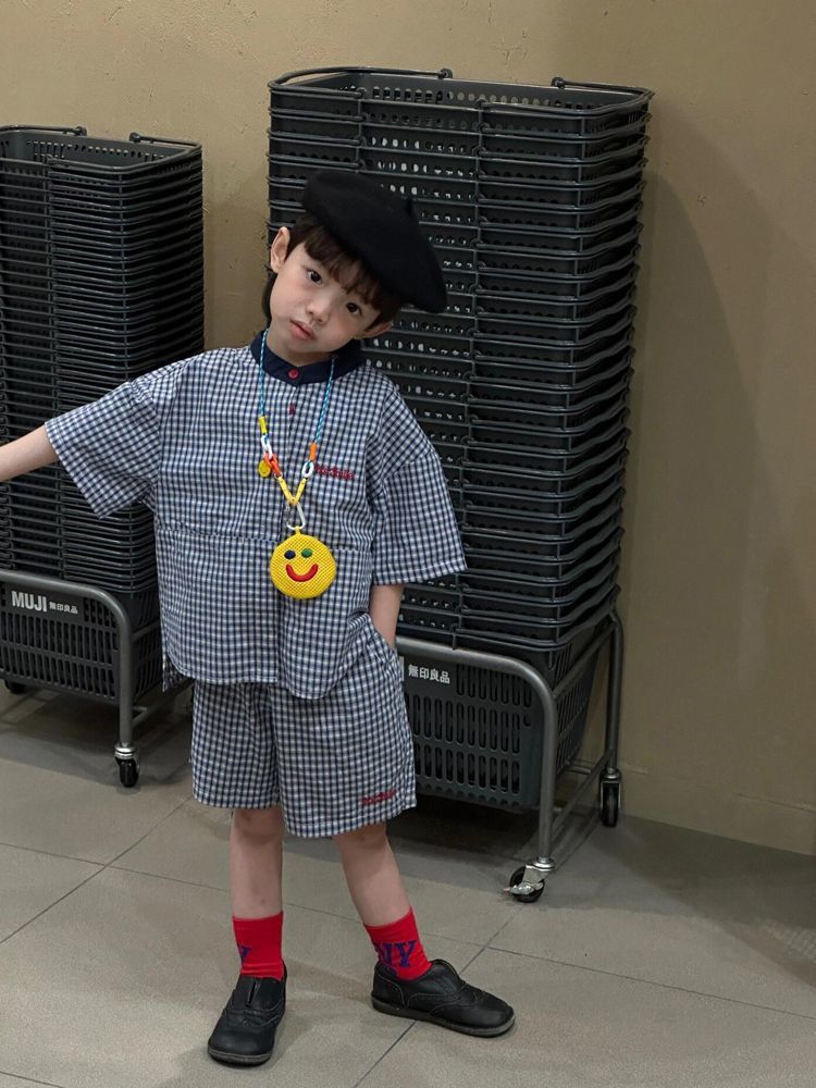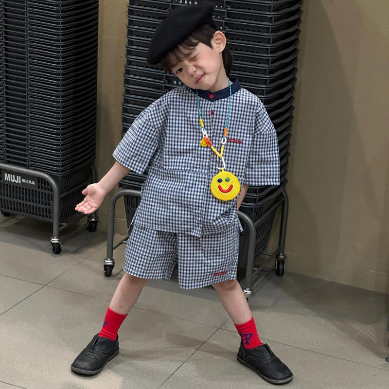 소년 여름 정장 2025 새로운 스타일 어린이 인터넷 연예인 스트리트 대비 색격자 반팔 셔츠 캐주얼 반바지스토어 가기