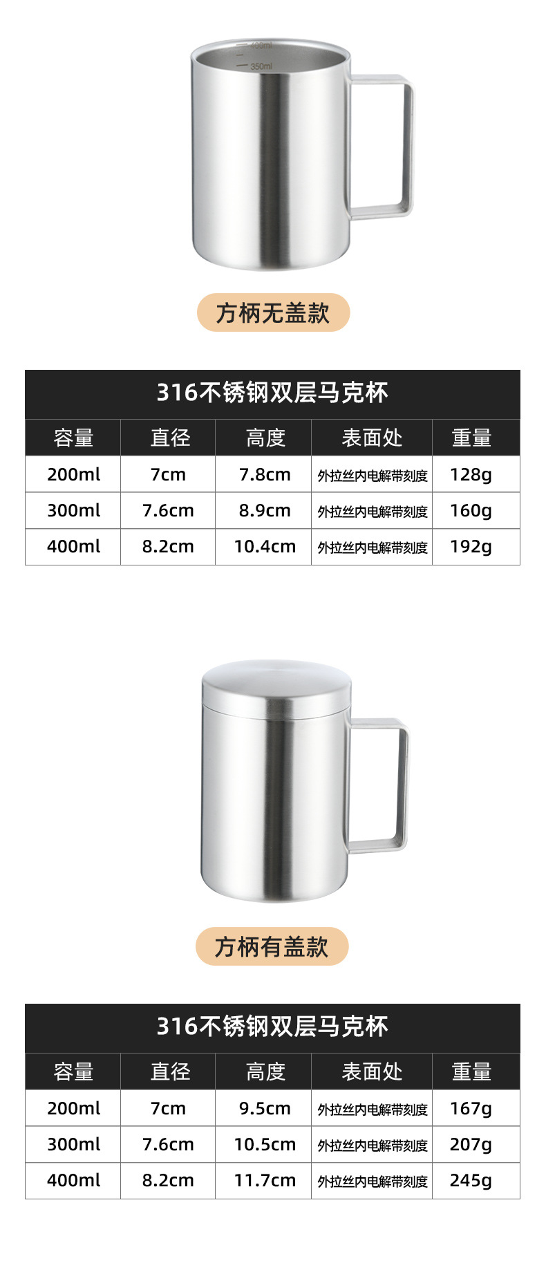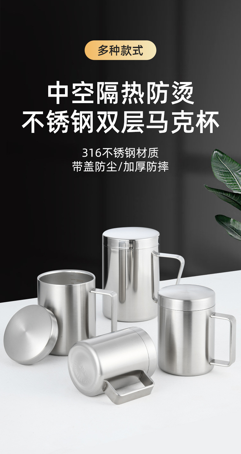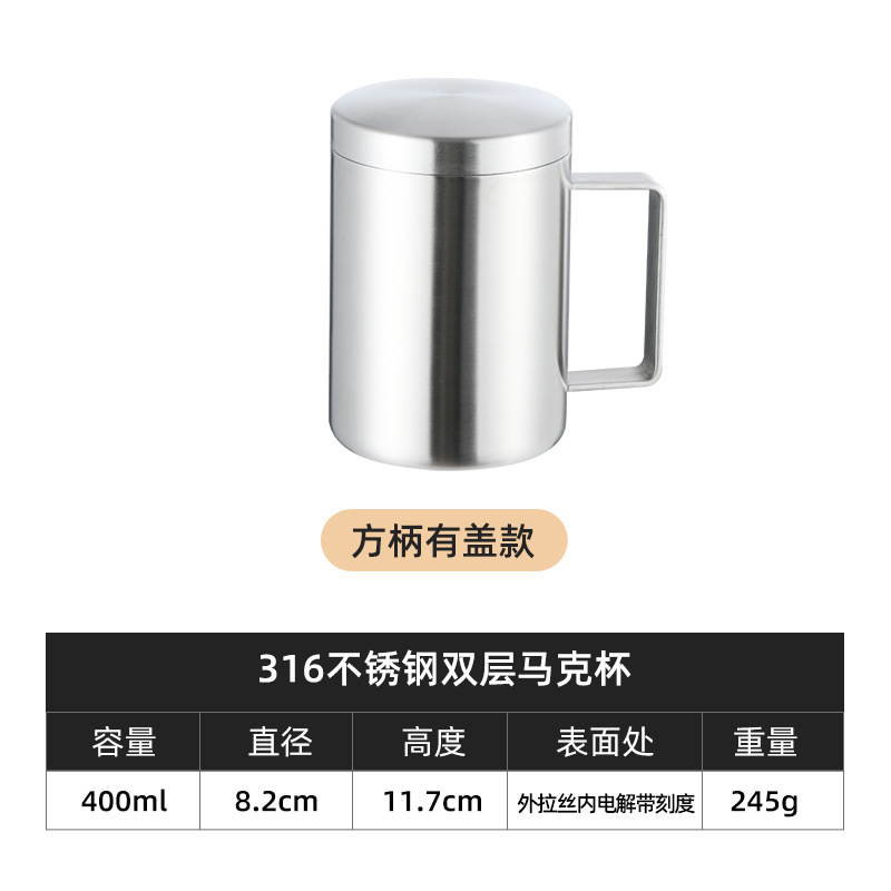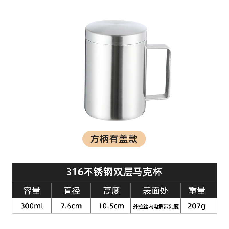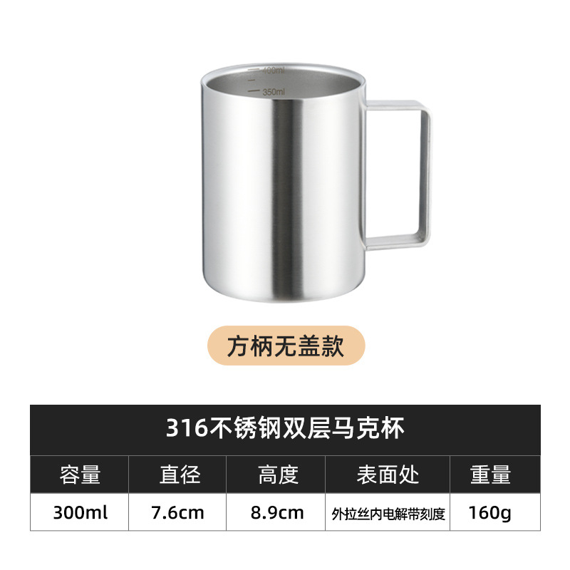 316 스테인레스 스틸 컵, 사각 손잡이 머그컵, 이중층 화상 방지 커피컵, 가정용, 유치원, 학교, 학생용 물컵