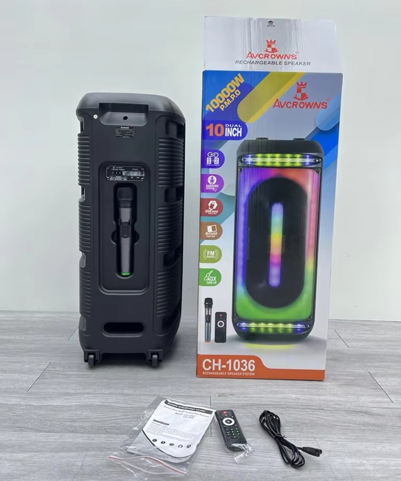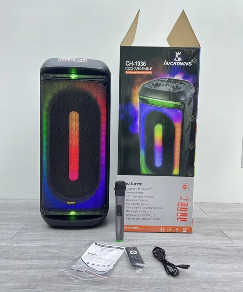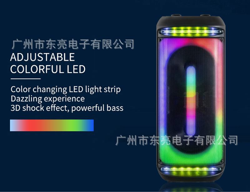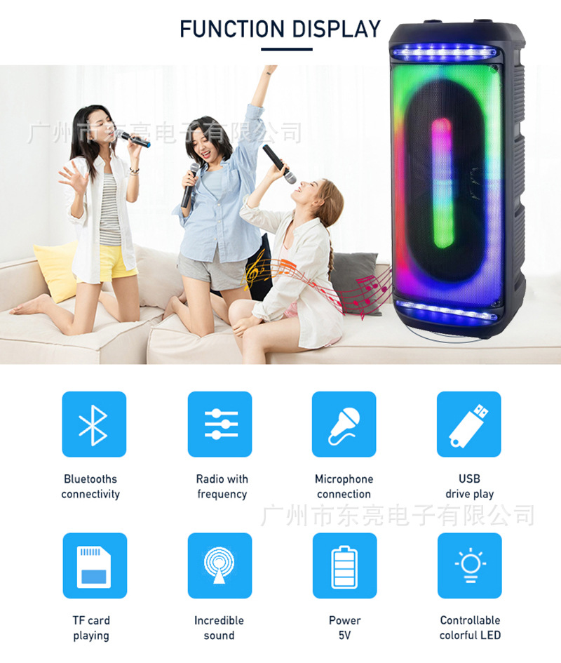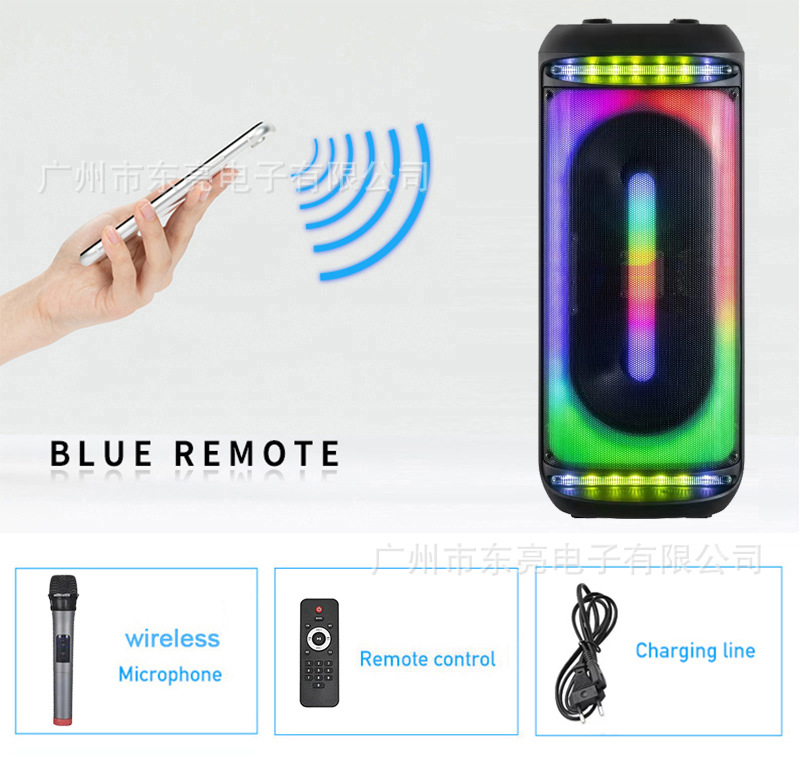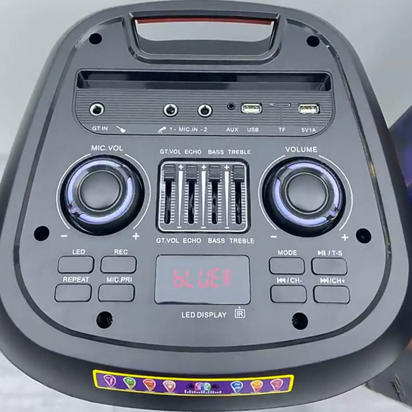 Supports USB, TF, FM, AUX, Bluetooth, remote control, LED lights TWS、EQ、BASS、TREBLE、ECHO、MIC*2、MIC.PRI、REPEAT、GT、GT.VOL、REC、LED Display screen, wireless microphone, RGB color lights