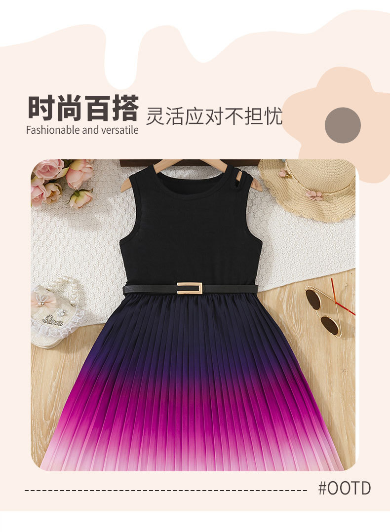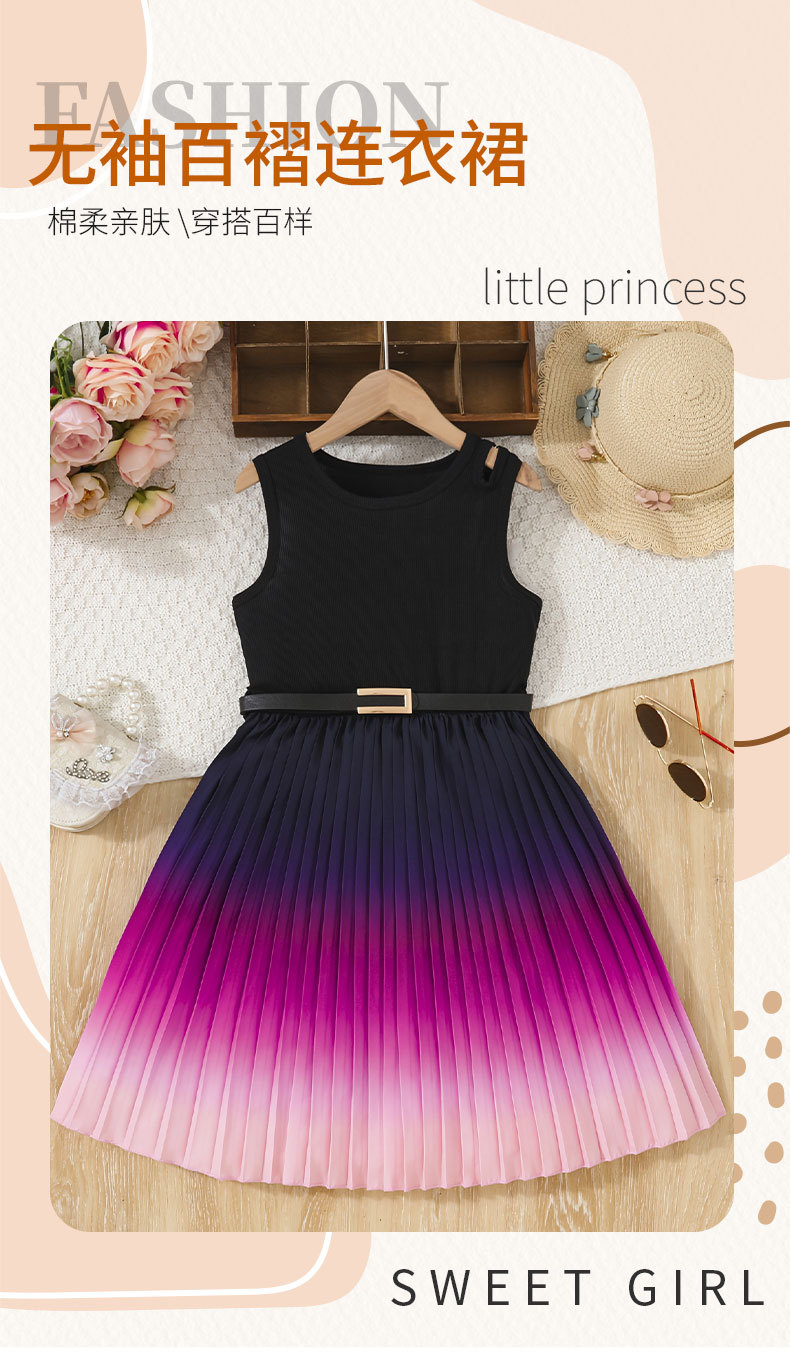 패셔너블한 중대형 아동용 그라데이션 컬러 캐미솔 신축성 있는 허리 주름 롱 스커트 패셔너블한 벨트 민소매 여아 드레스