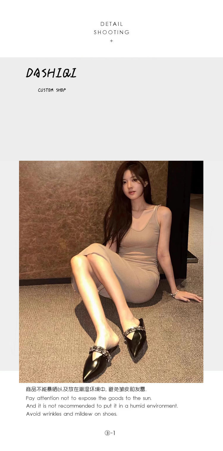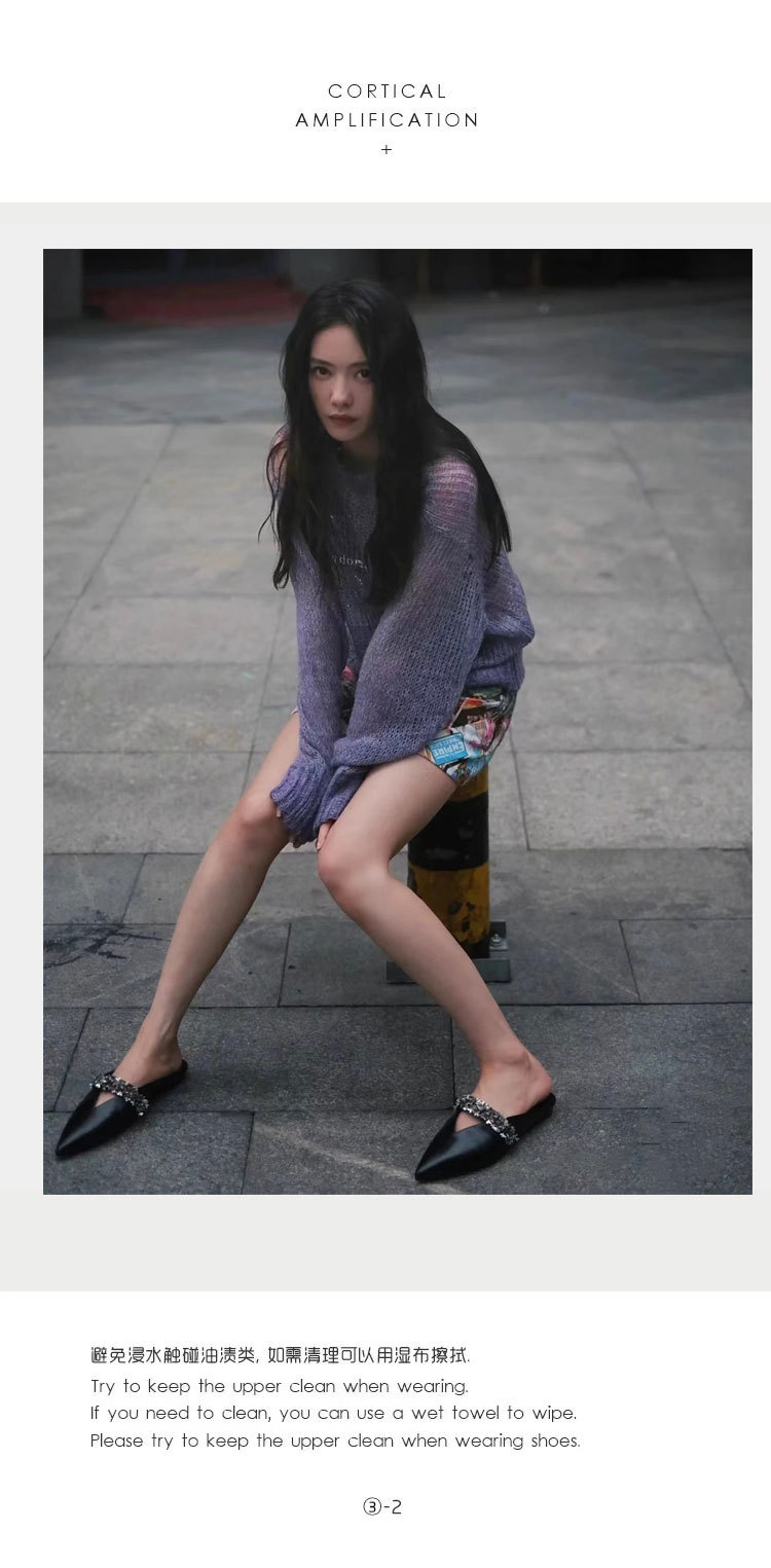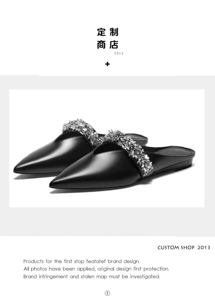 Zhao Lusi의 같은 스타일 Baotou 슬리퍼 여성용 뮬러 신발 메이플 리프 V 모조 다이아몬드 포인티드 토 플랫 바닥 복고풍 프렌치 슈즈스토어 가기