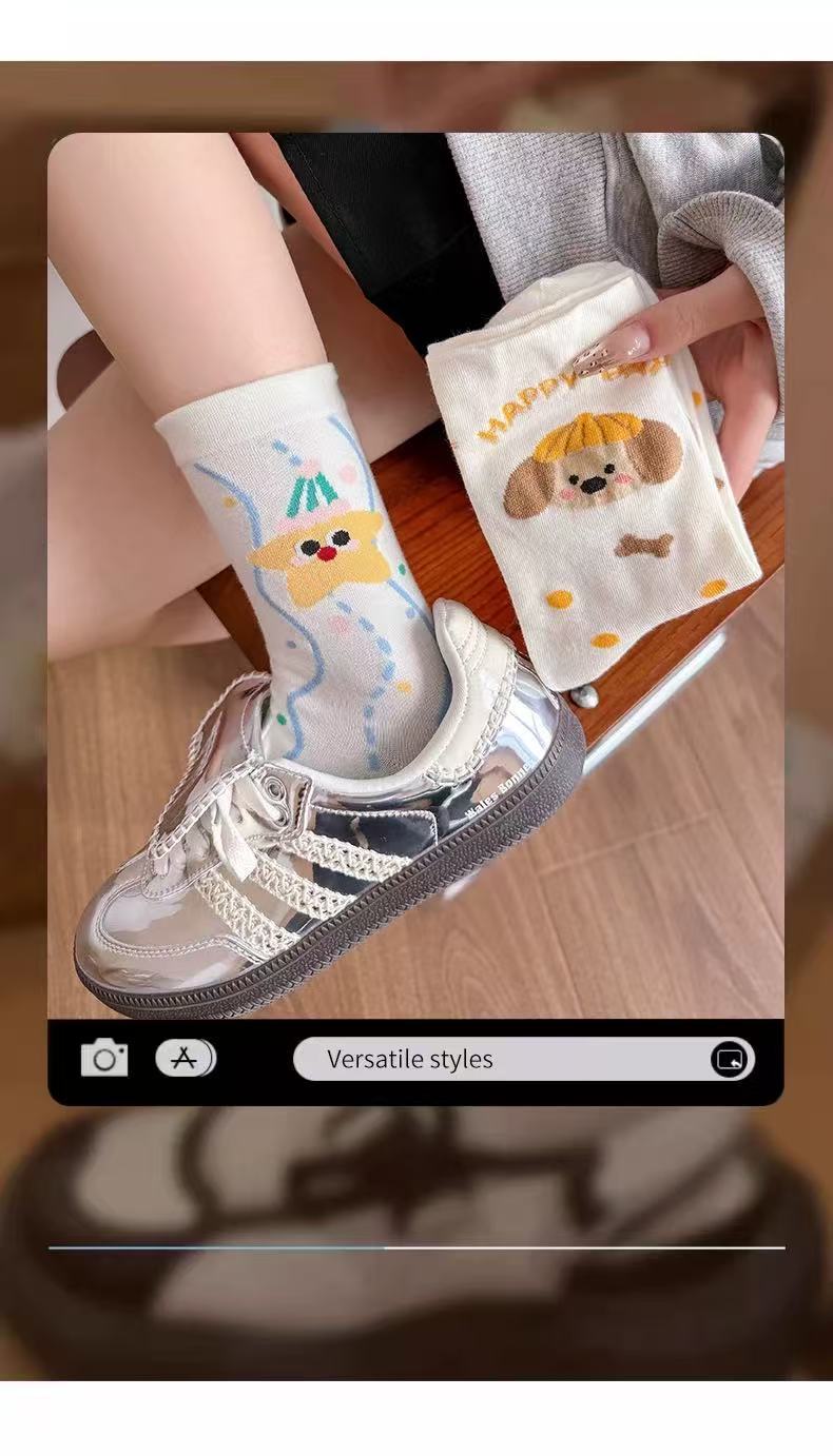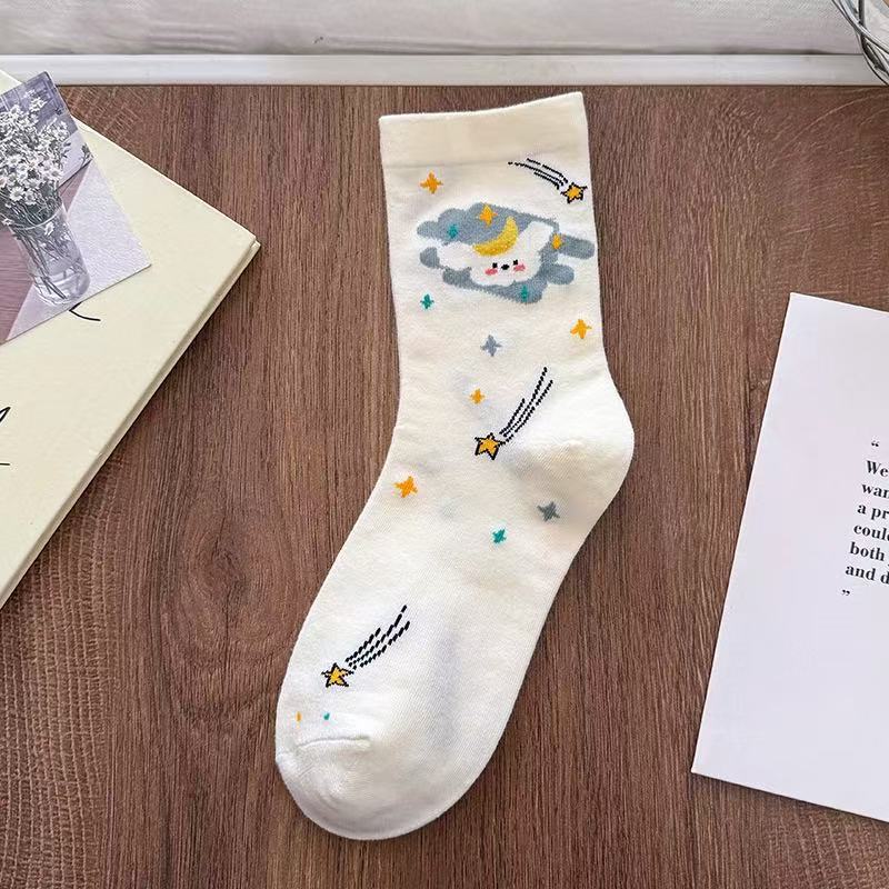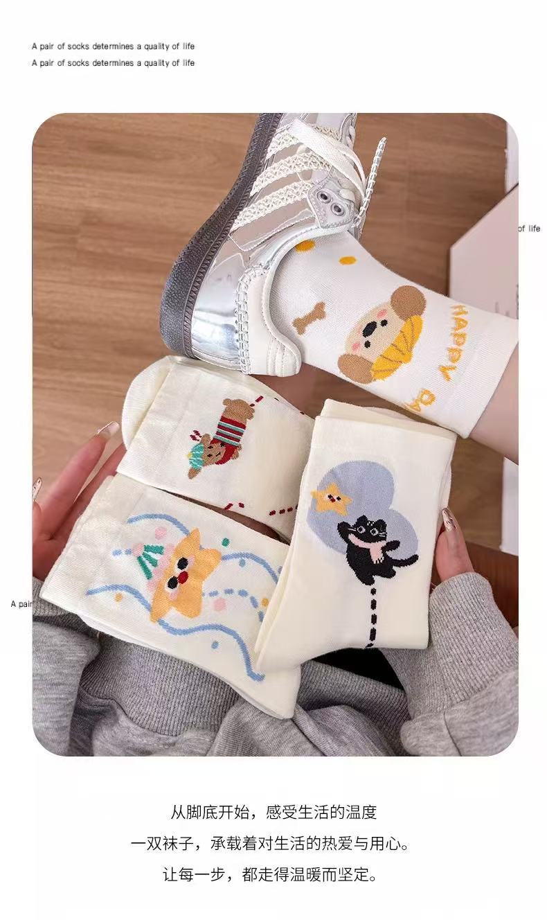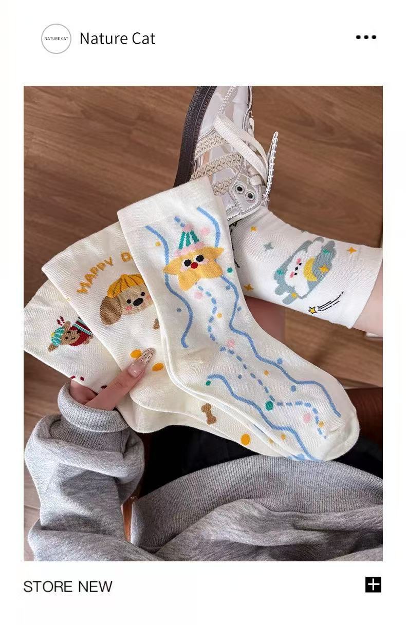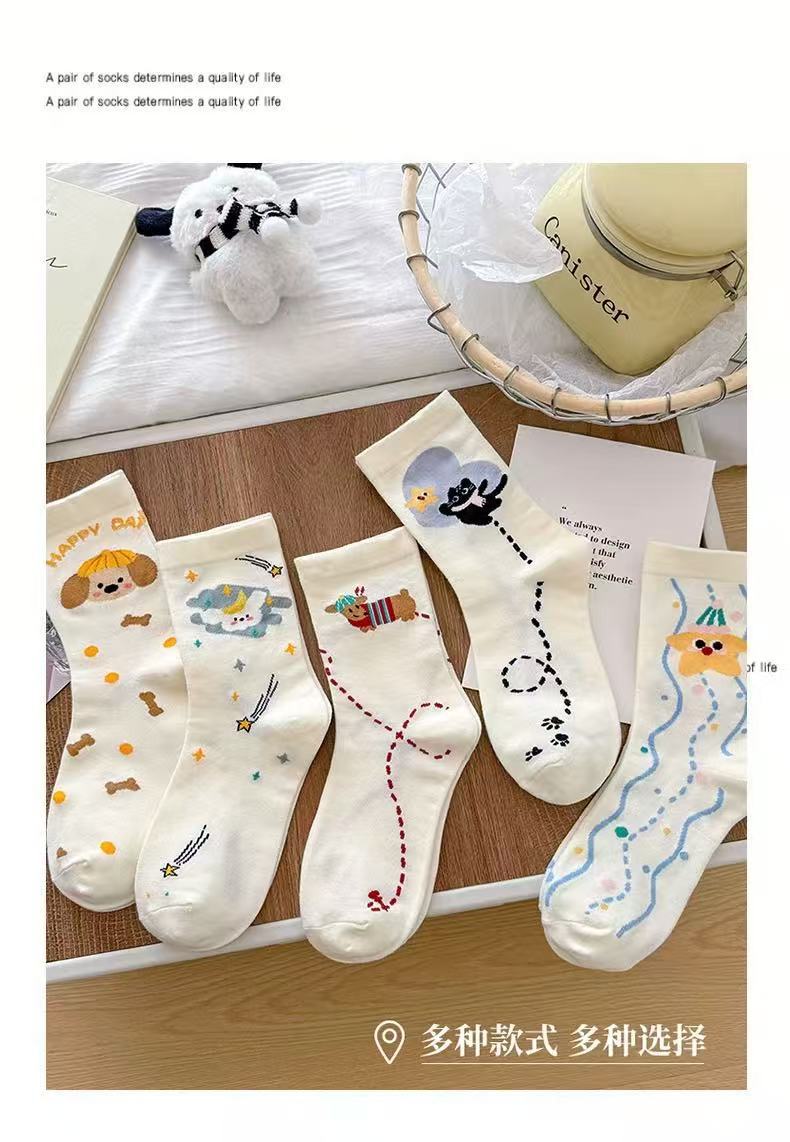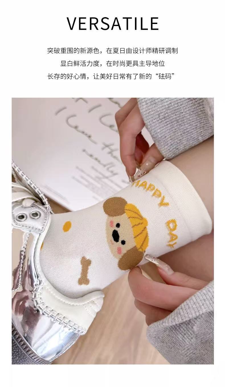 여성용 만화 종아리 양말 여름 얇은 흰색 양말 대학 스타일 일러스트 강아지 인터넷 연예인 스타 여성용면 양말스토어 가기