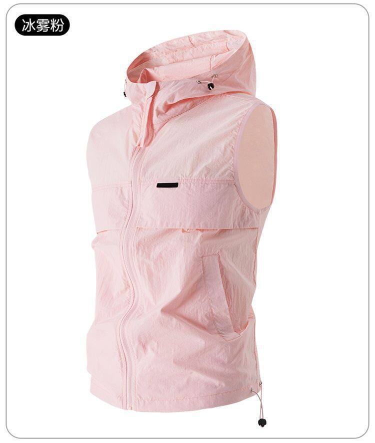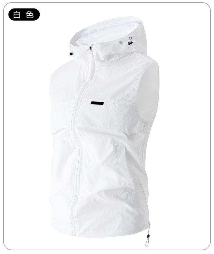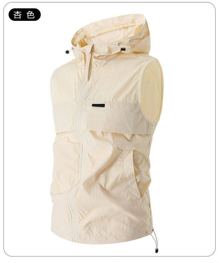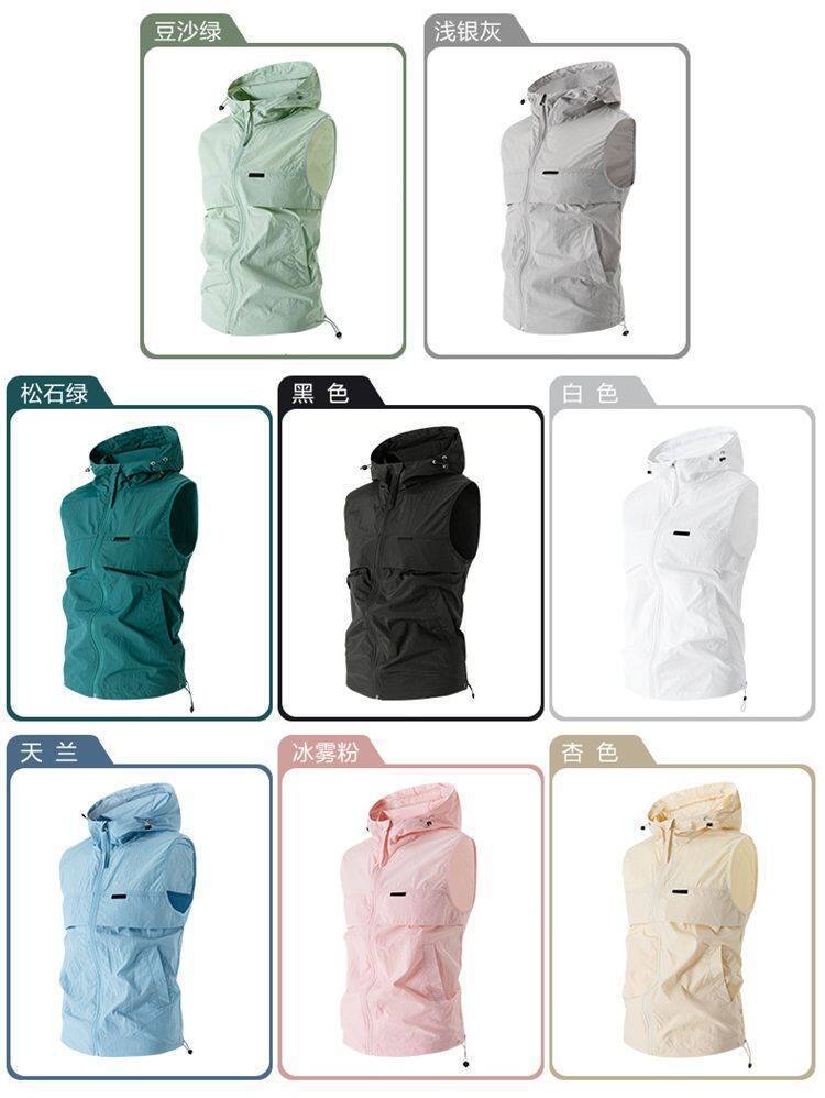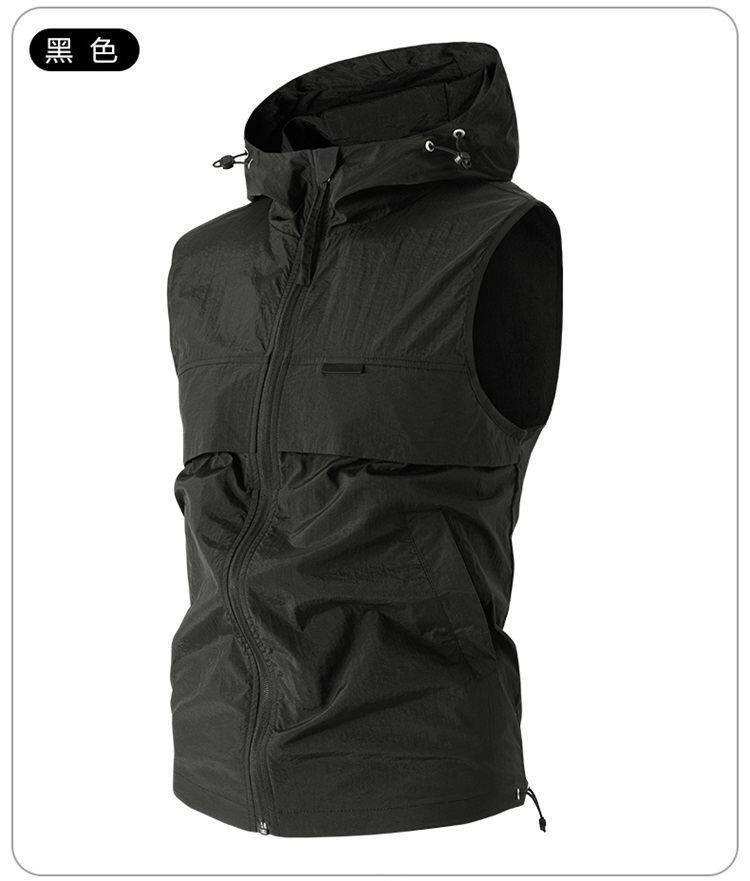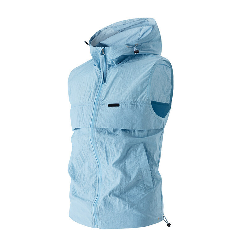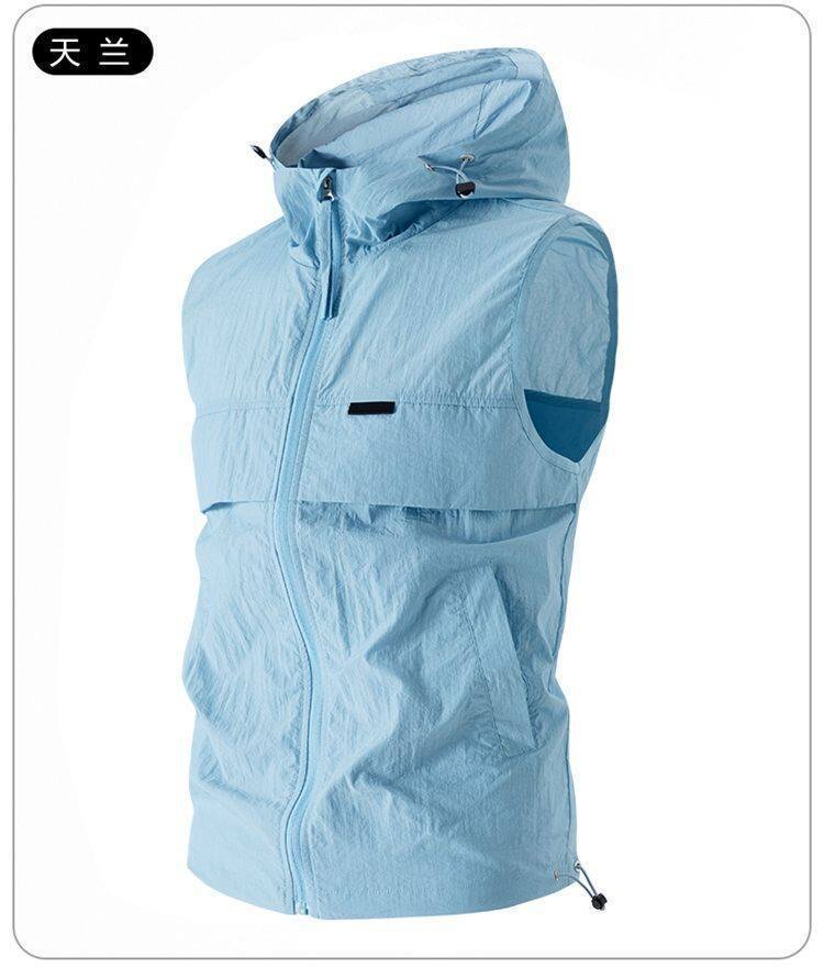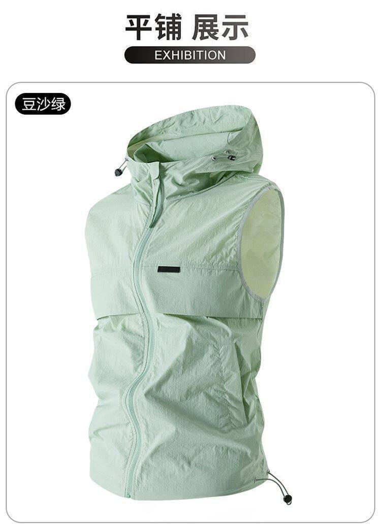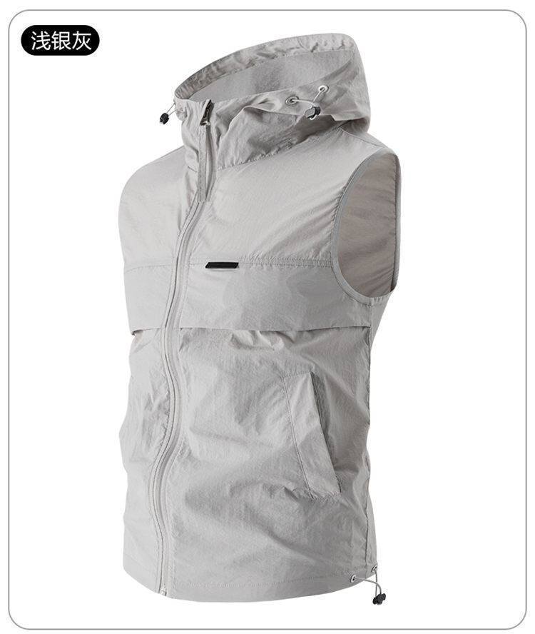 유럽과 미국 남성 후드 스포츠 조끼, 등산 및 달리기 자외선 차단 의류, 얼음 실크 야외 사이클링 의류, 민소매 코트, 가디건스토어 가기