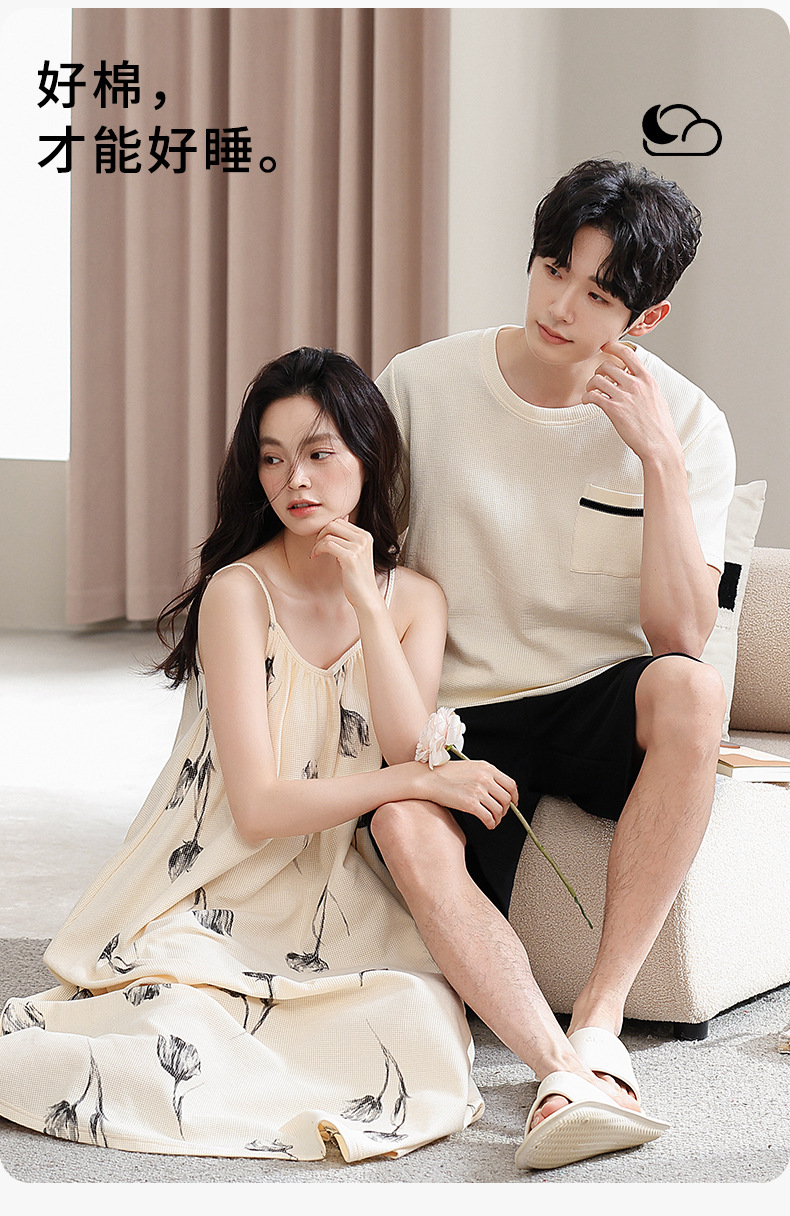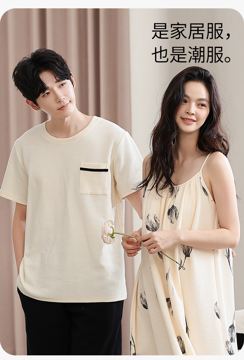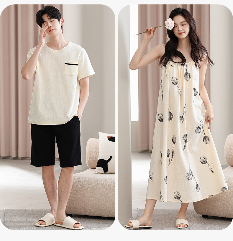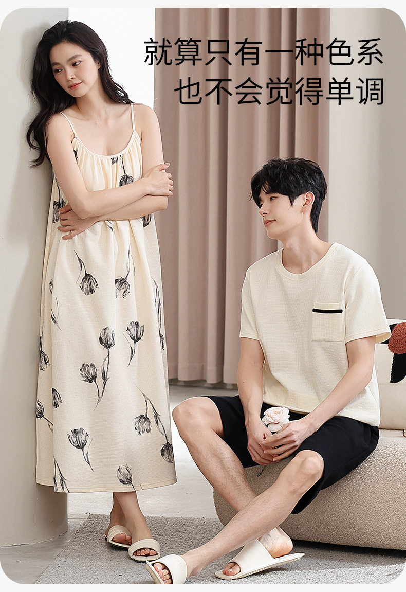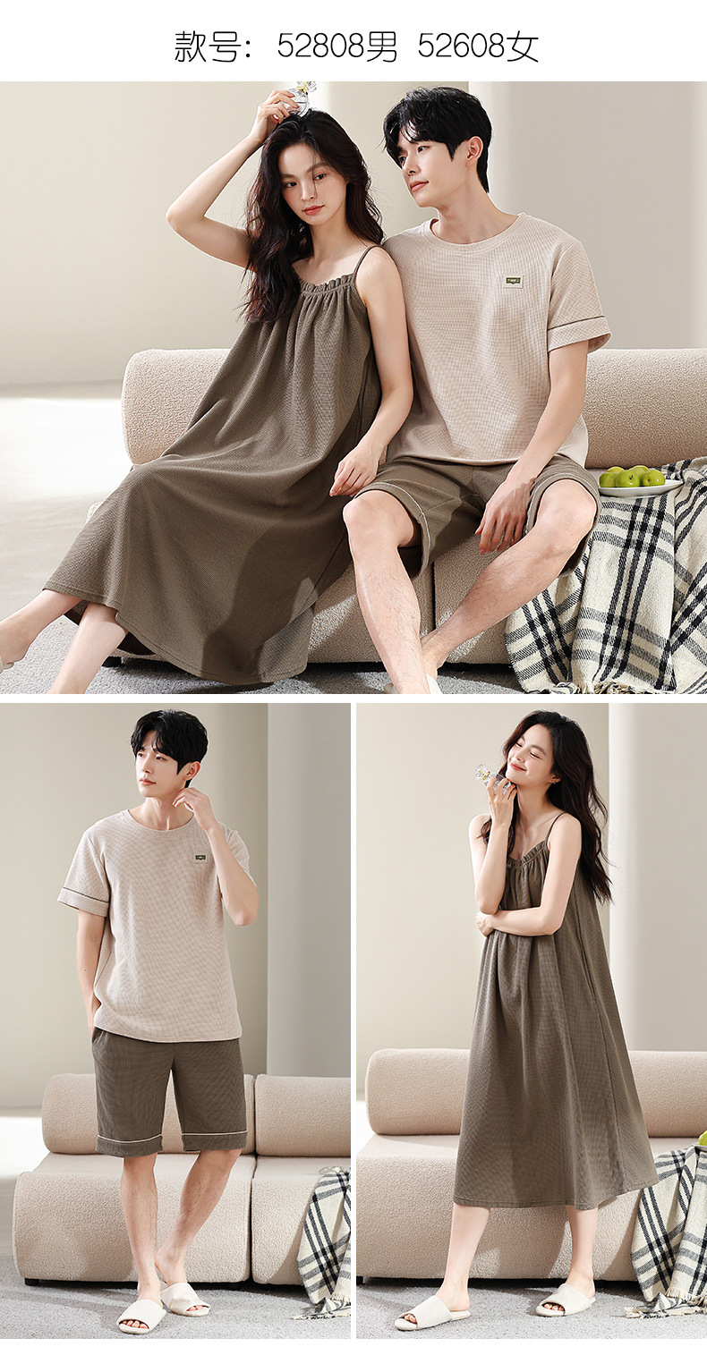 2025년 여름 신상 잠옷, 순면 와플 커플 스타일 남성 반바지, 여성 서스펜더 잠옷, 홈웨어스토어 가기