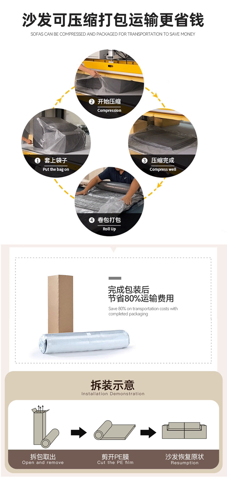 일체형 압축 소파 면 및 린넨 원단 풀 스펀지 접이식 이중 목적 뼈없는 빵 소파 베드 진공 압축스토어 가기