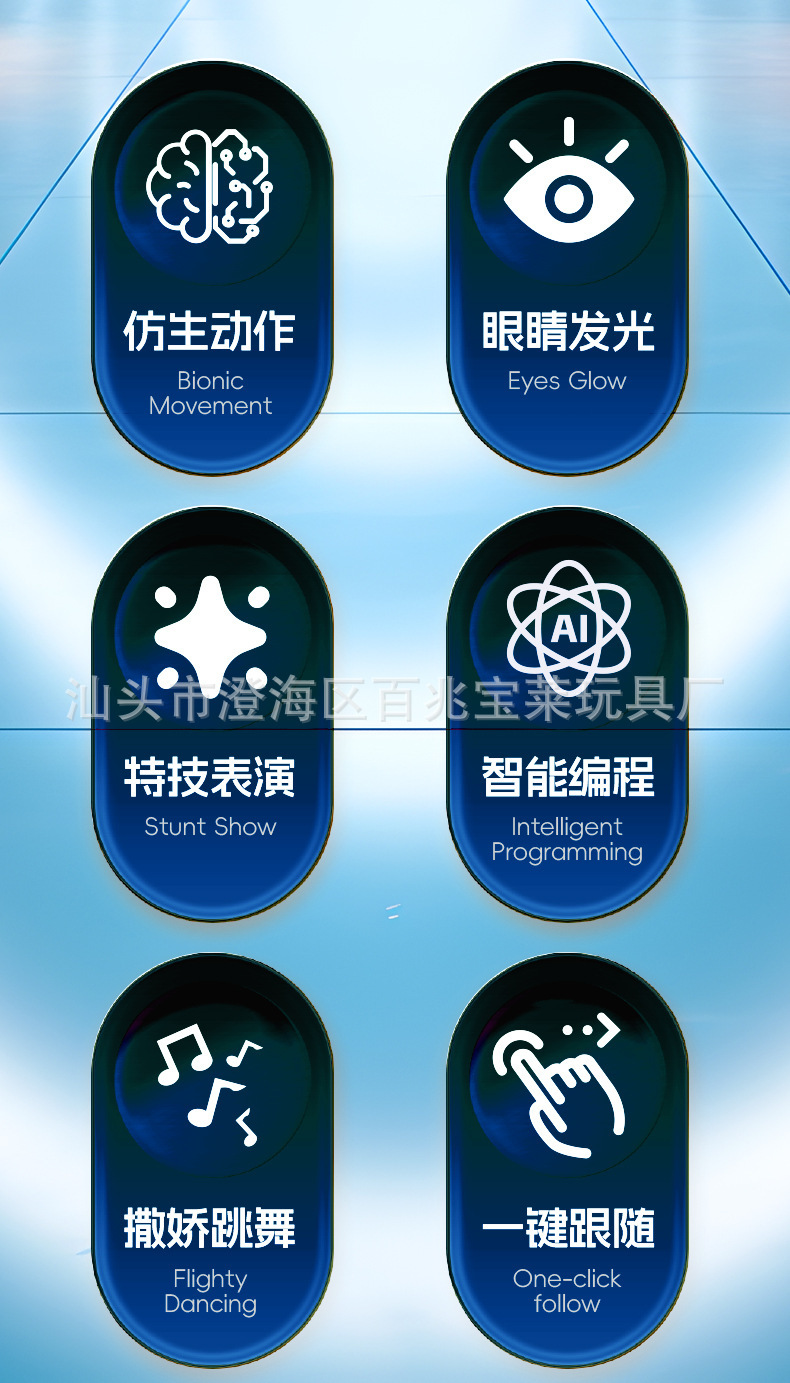 功能:跟随,前进.站立,俯卧撑,歌曲.舞曲.编程.坐下,倒立,趴下等等
