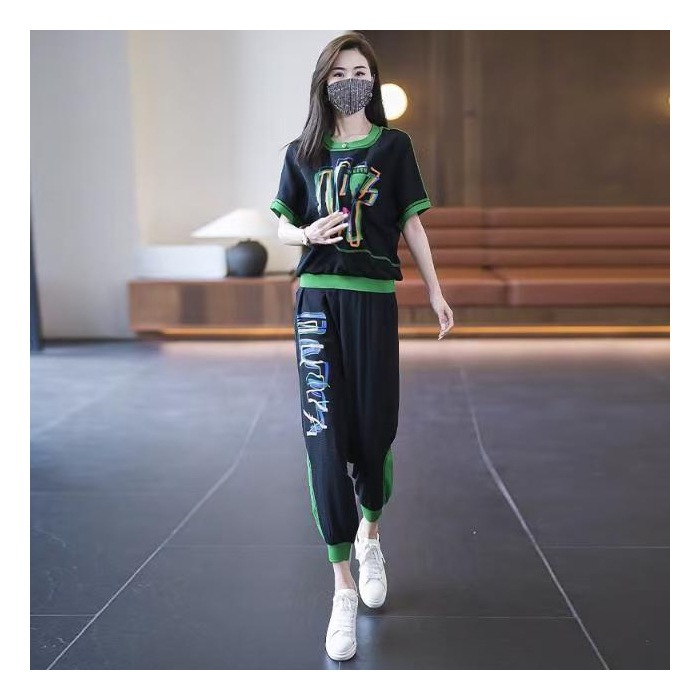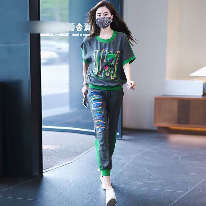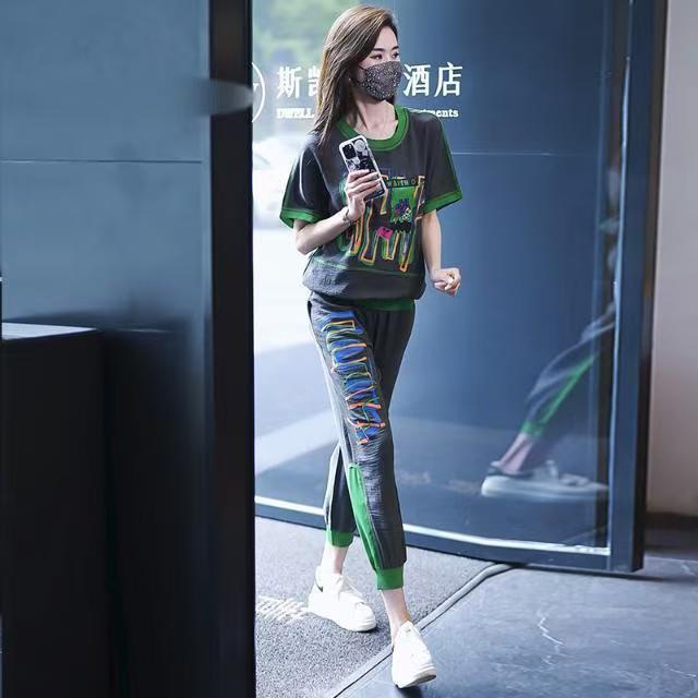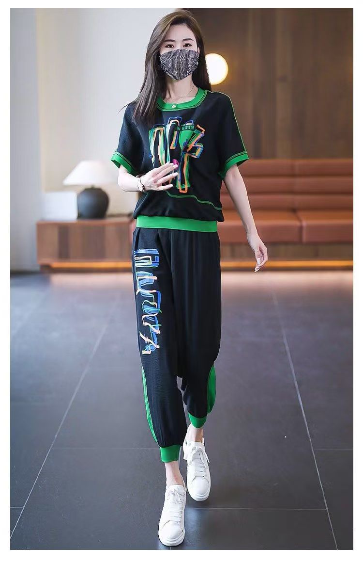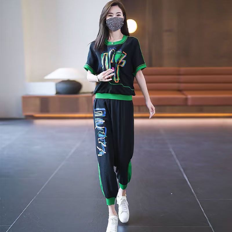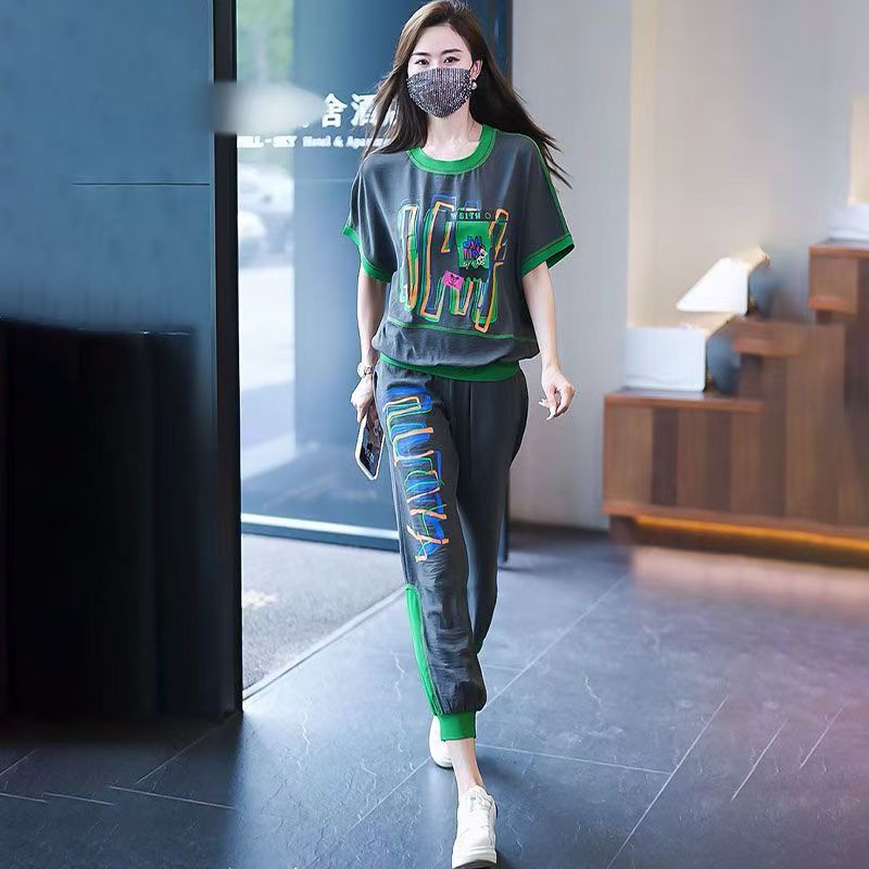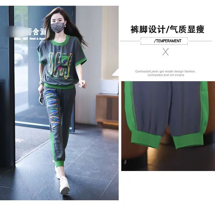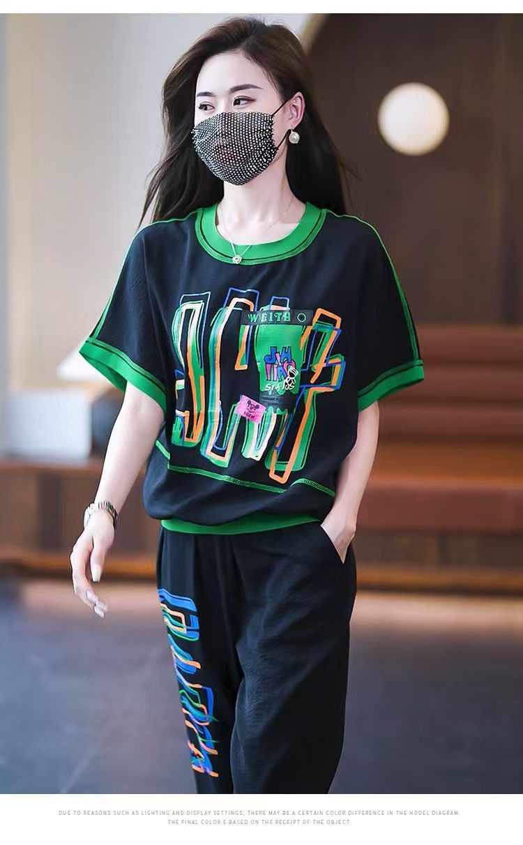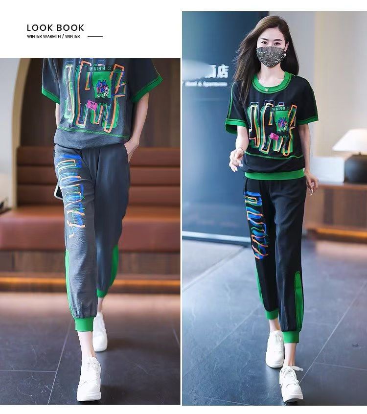 플러스 사이즈 여성 캐주얼 스포츠 정장 2025 여름 새로운 패션 다목적 인쇄 반팔 9 점 바지 투피스 세트