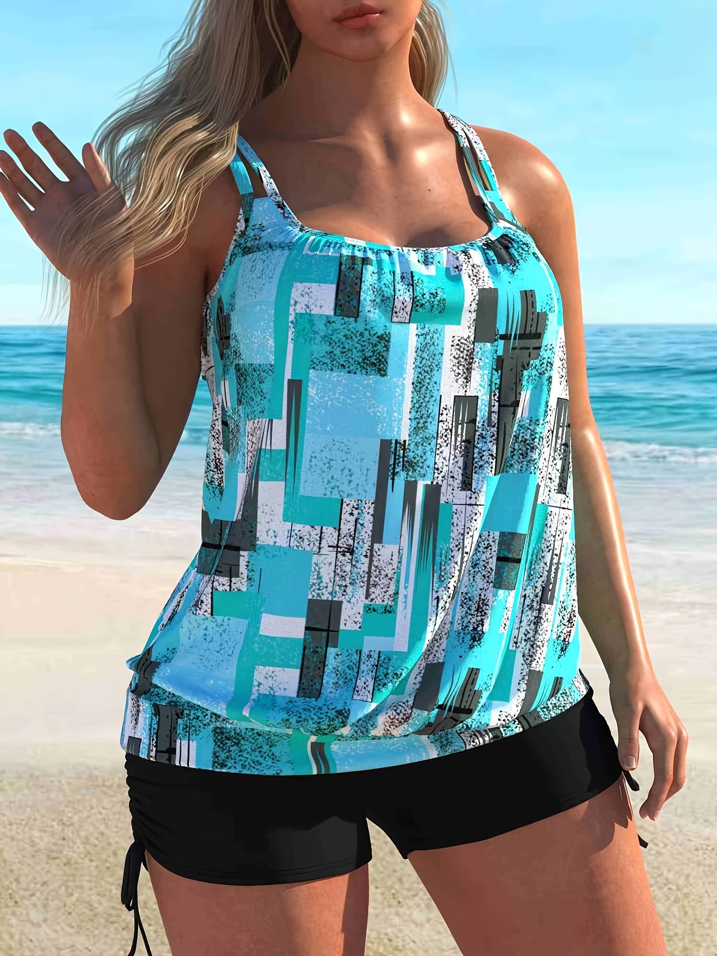 플러스 사이즈 여성용 스카이 블루 탱키니 세트 세련된 기하학적 국경 간스토어 가기