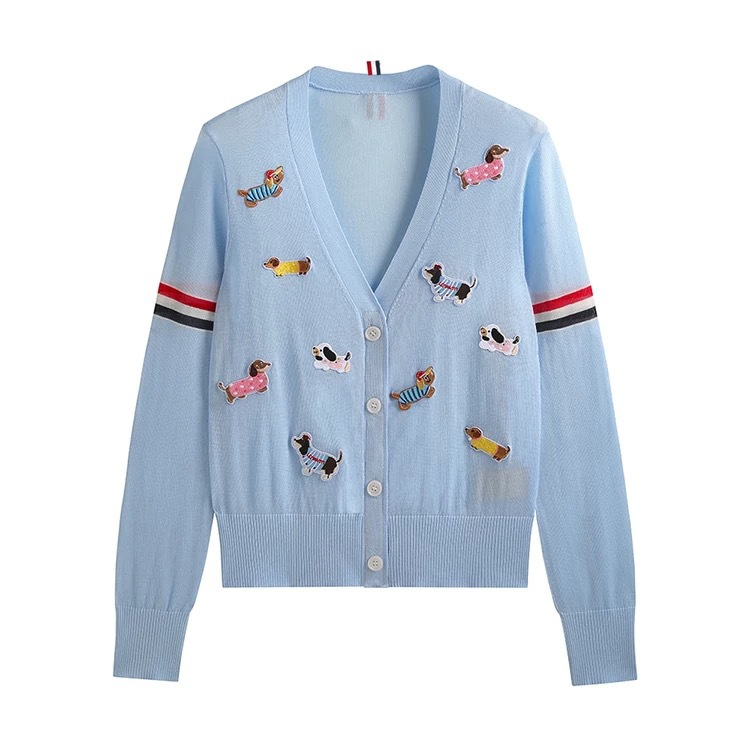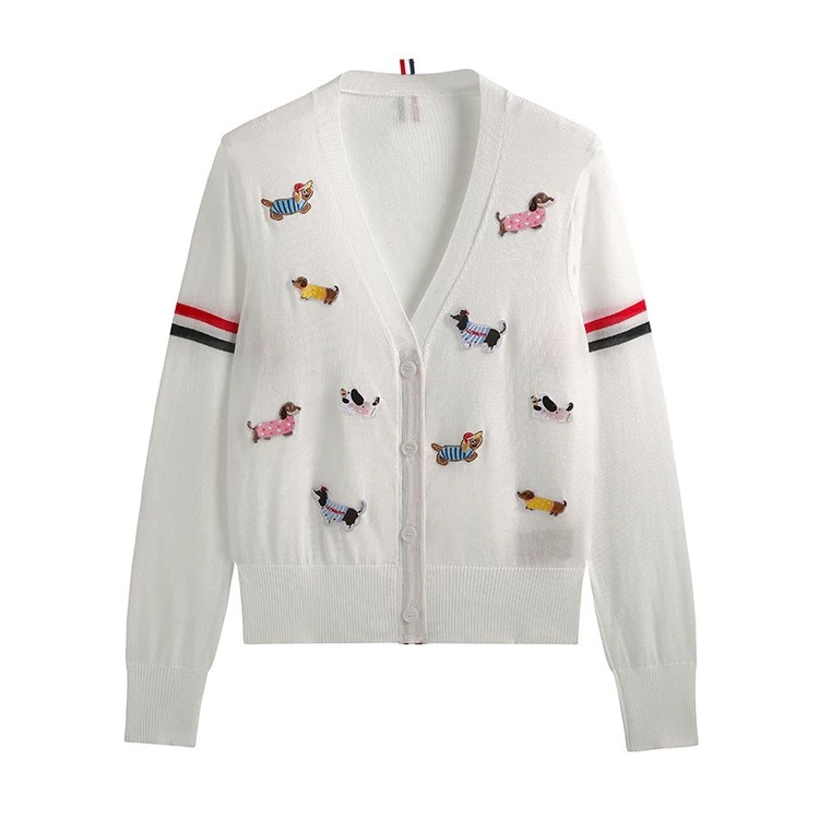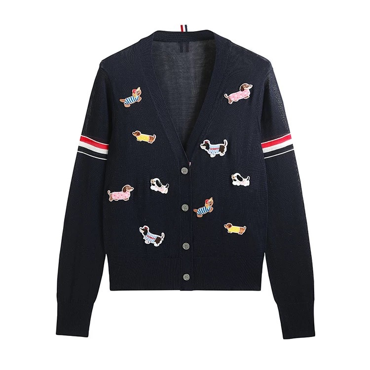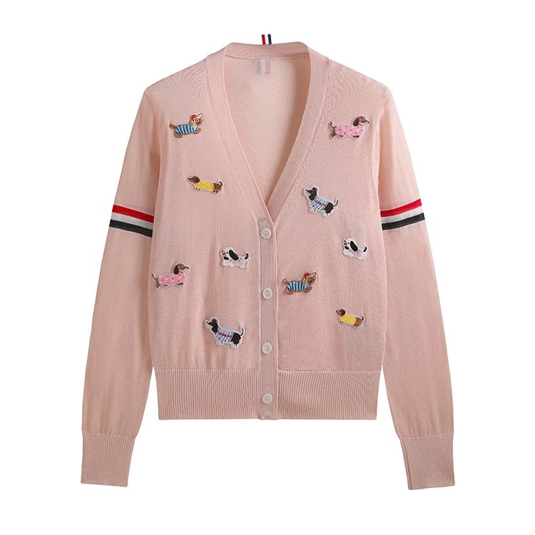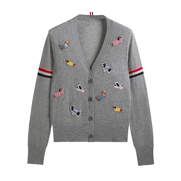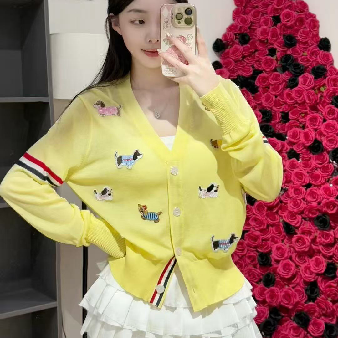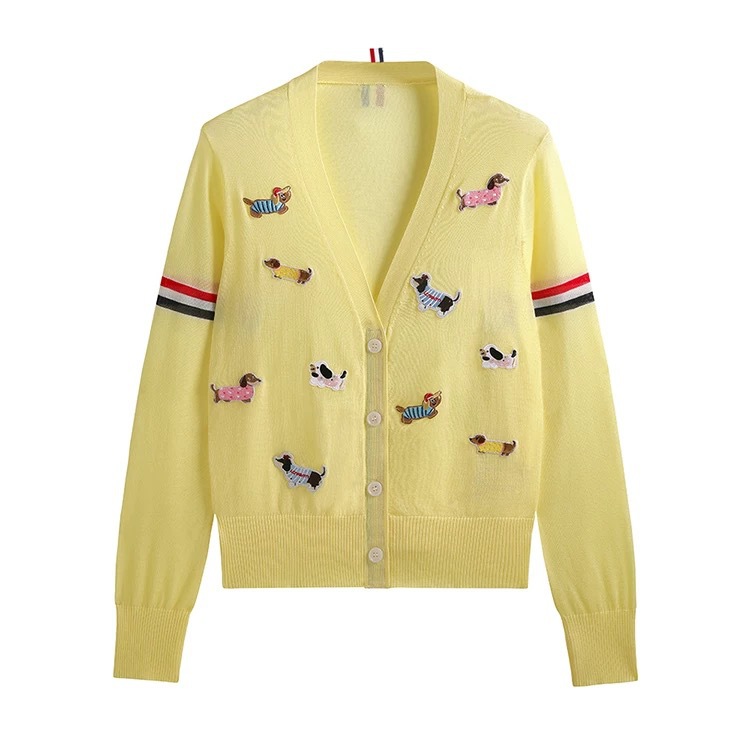 노란색 카디건 tb 대학 스타일 강아지 라벨 장식 더블 슬리브 컬러 스트립 v 넥 니트 카디건 여성 자켓 유행