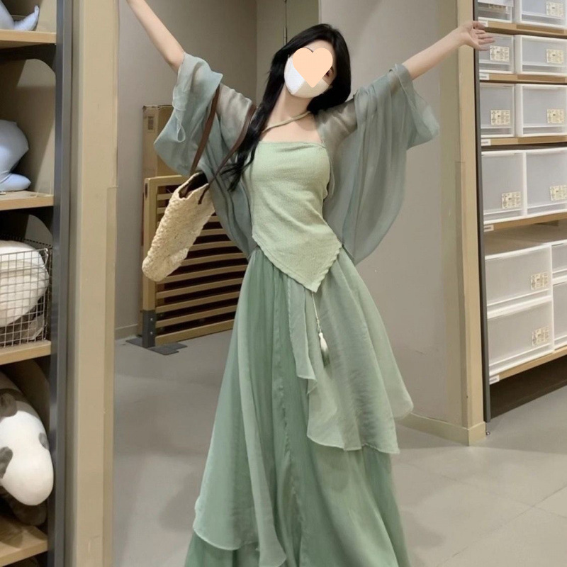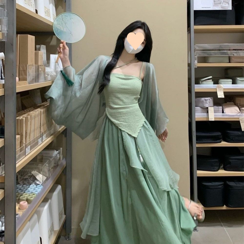 新中式女装国风改良汉服汉元素日常小个子绿色连衣裙子三件套装女