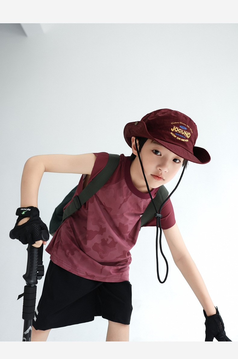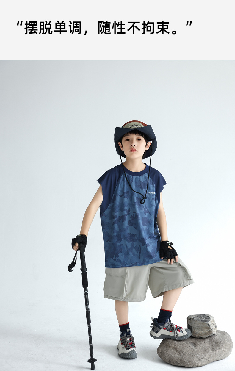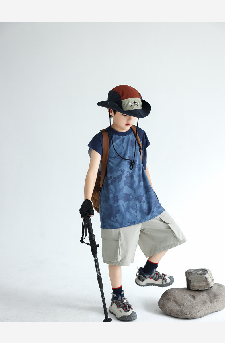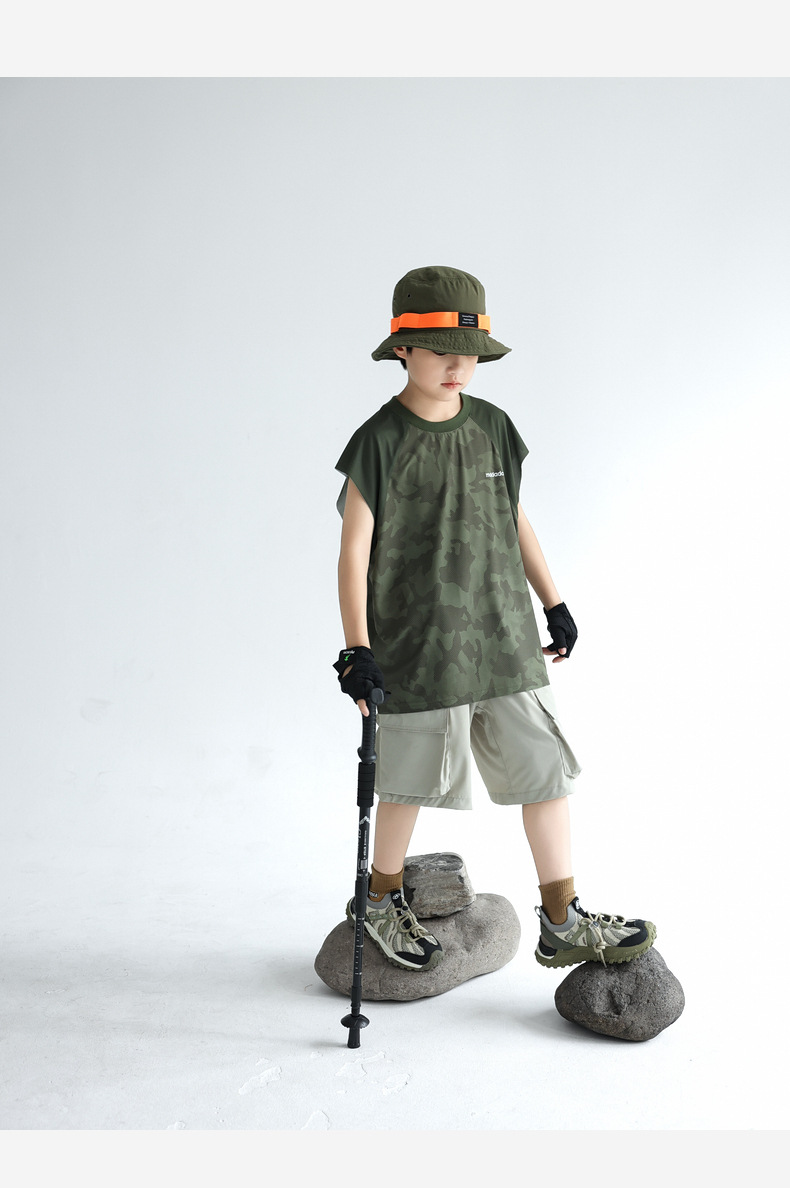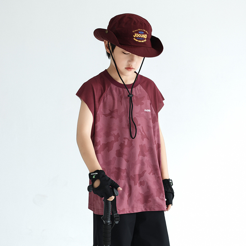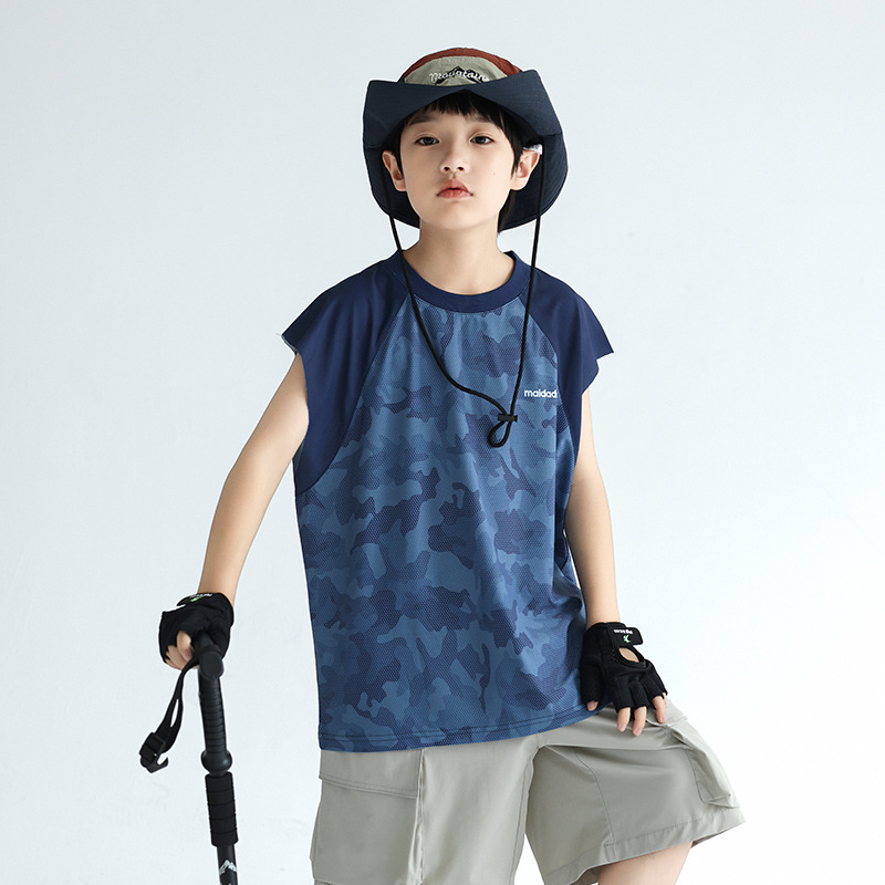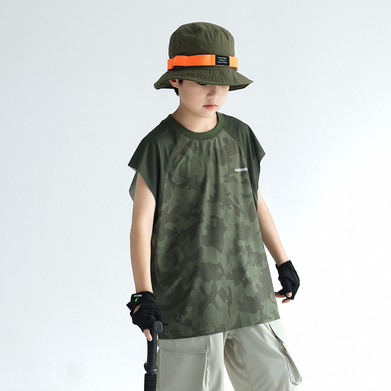 트렌디 한 위장 소년 시원한 속건성 스포츠 조끼 2025 여름 통기성 메쉬 어린이 민소매 티셔츠 도매스토어 가기