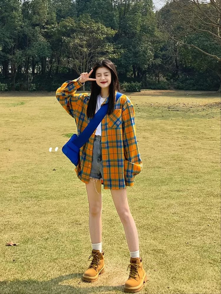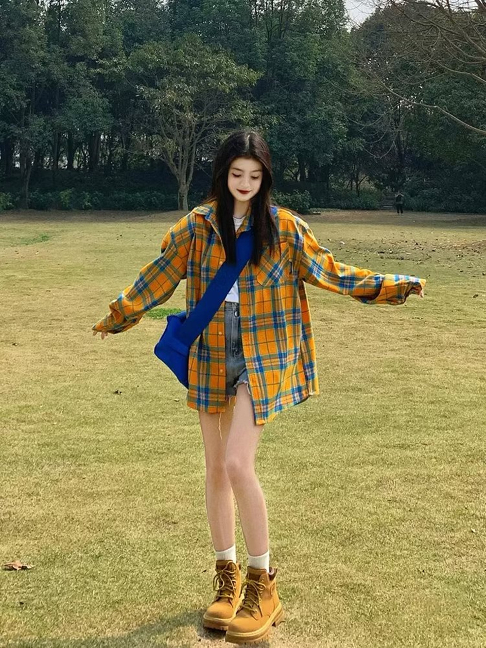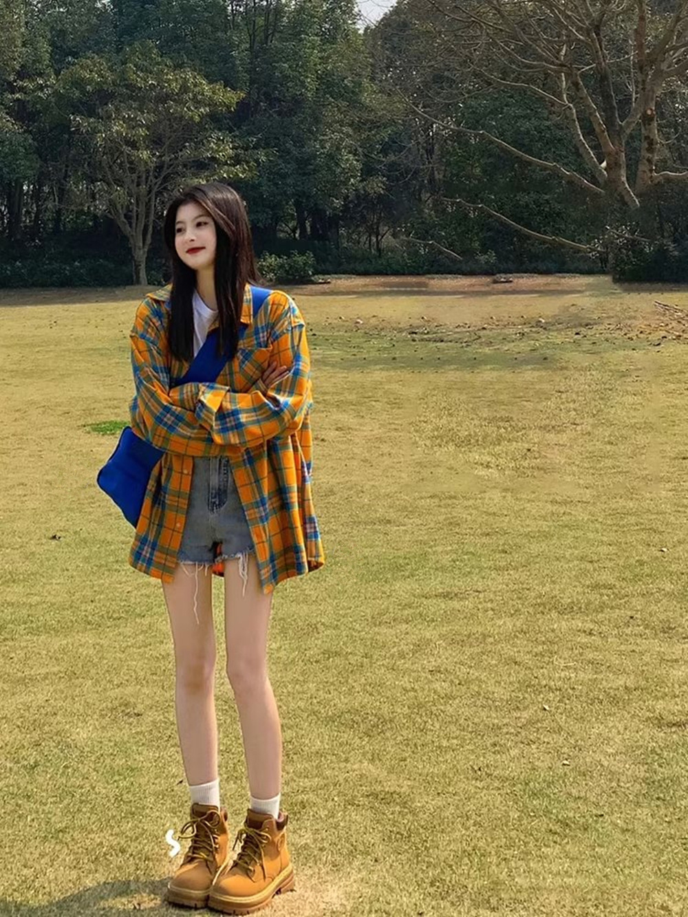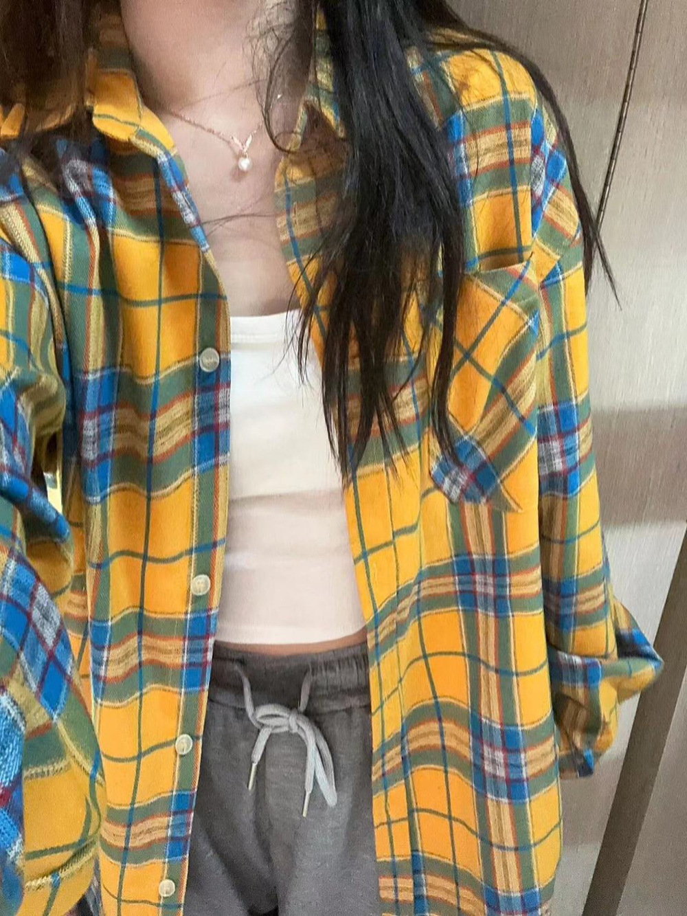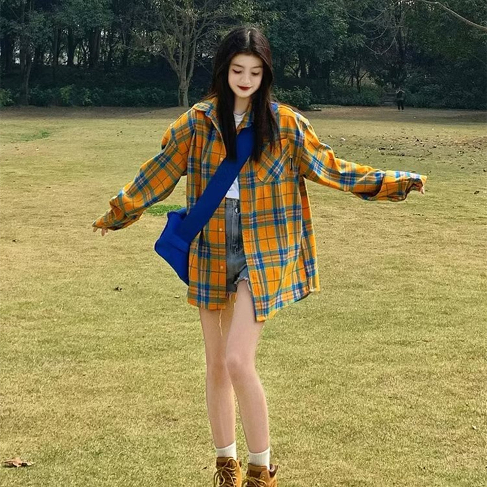 여성용 프렌치 옐로우 체크 무늬 셔츠, 여름용 가디건, 루즈한 긴팔 얇은 자외선 차단 셔츠, 재킷 탑스토어 가기