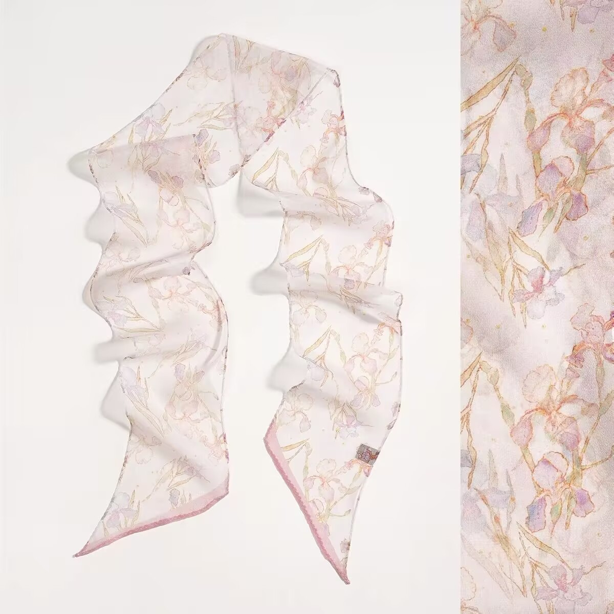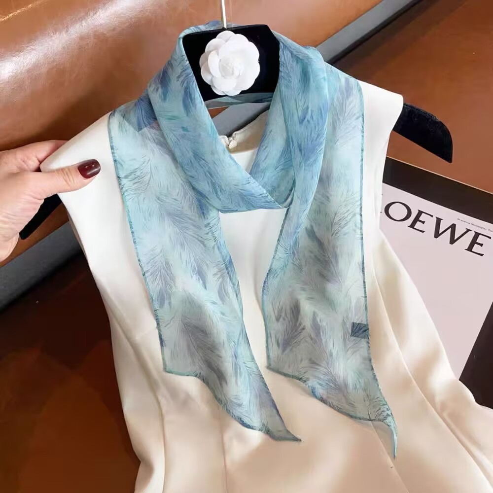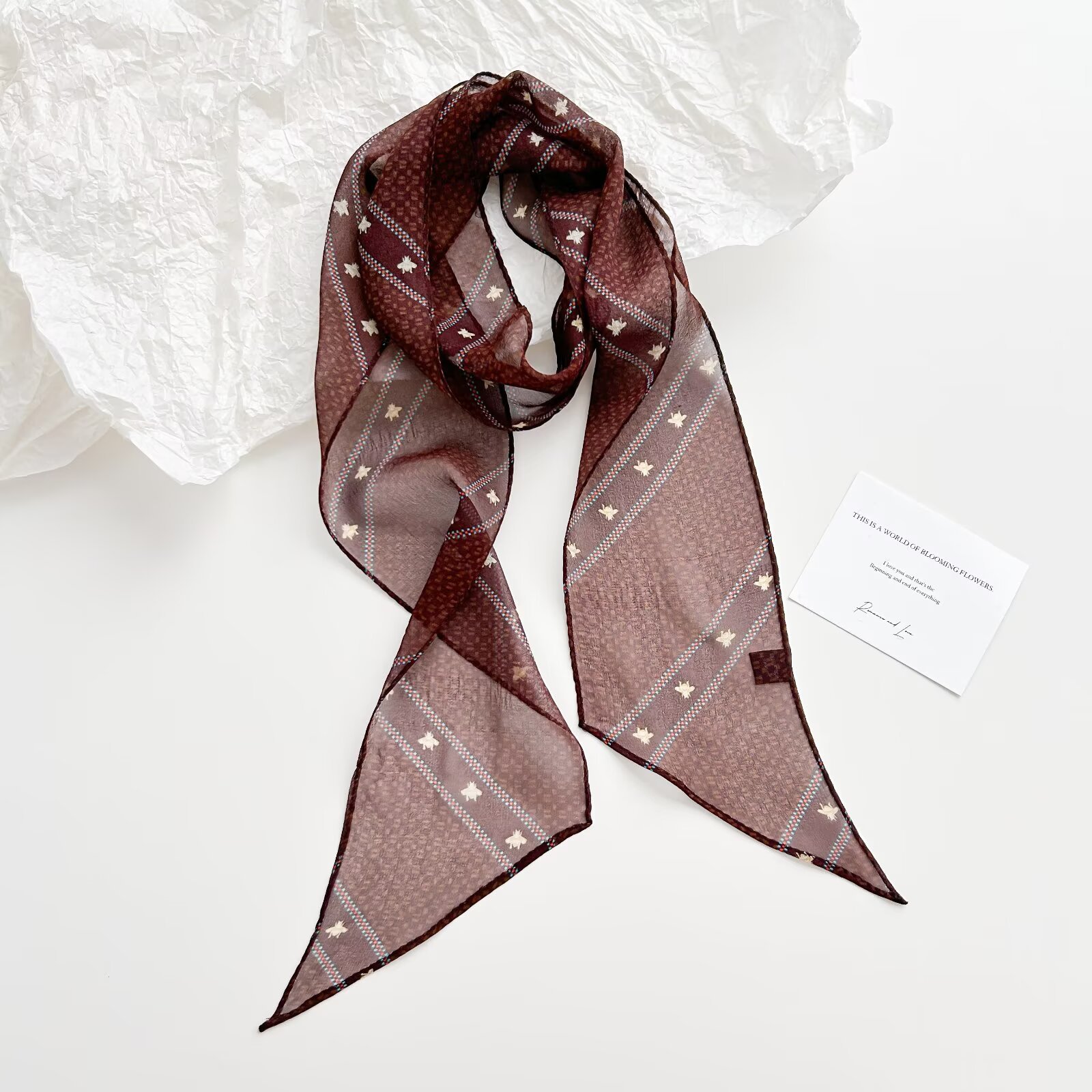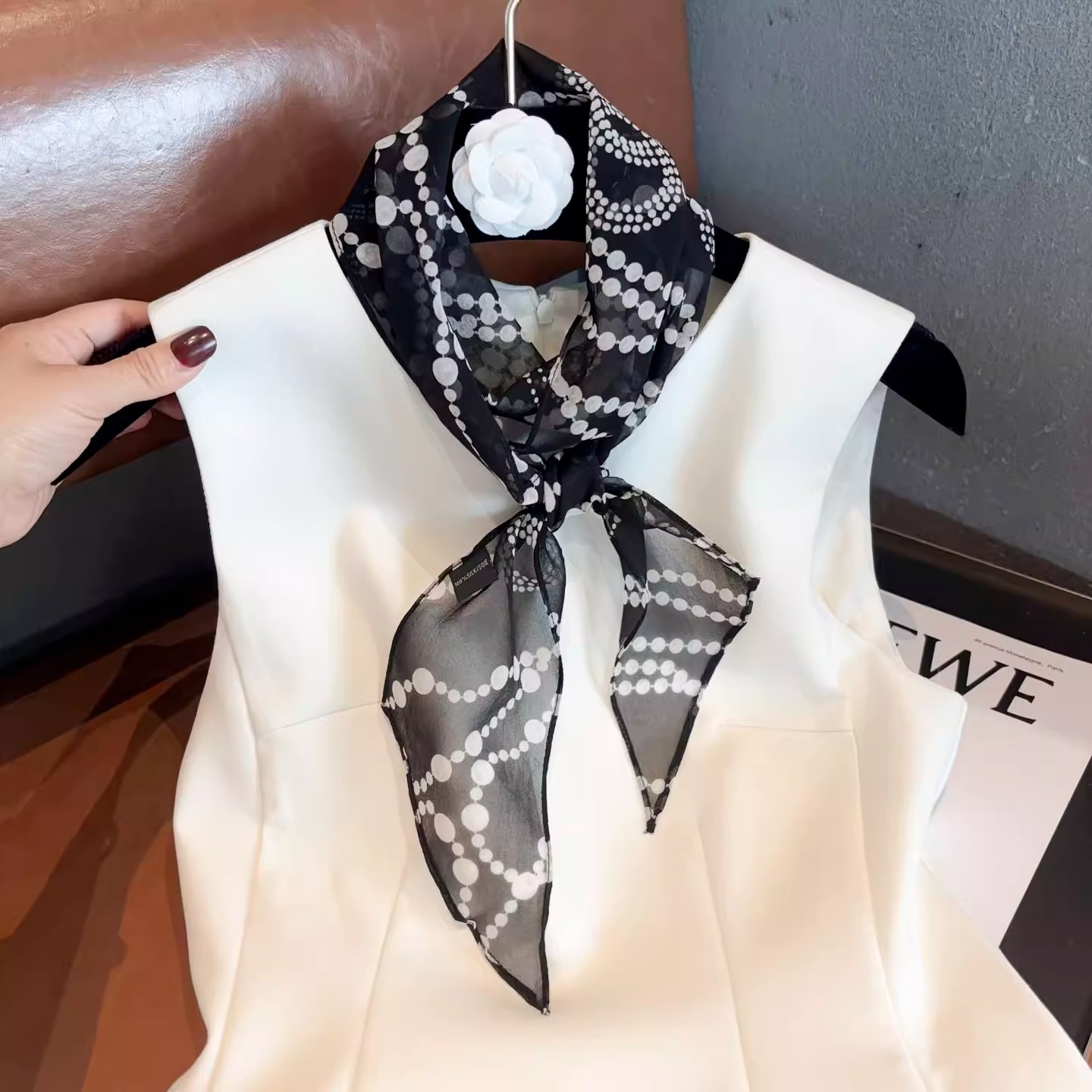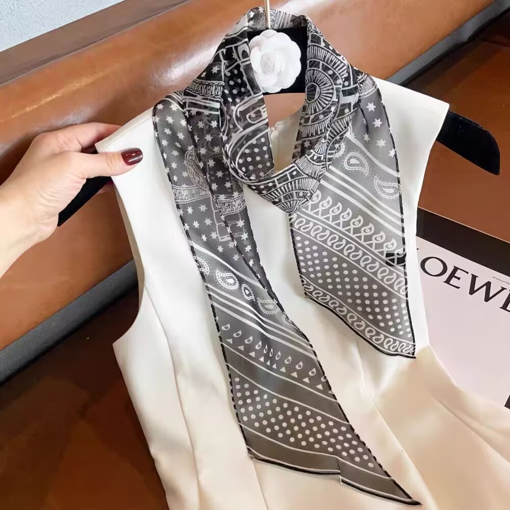 여름 상큼하고 통기성이 좋은 얇은 실크 스카프 100% 뽕나무 실크 숨겨진 체크 무늬 조젯 스트립 스커트가 있는 여성용 작은 스카프