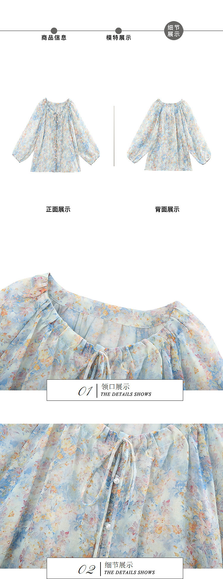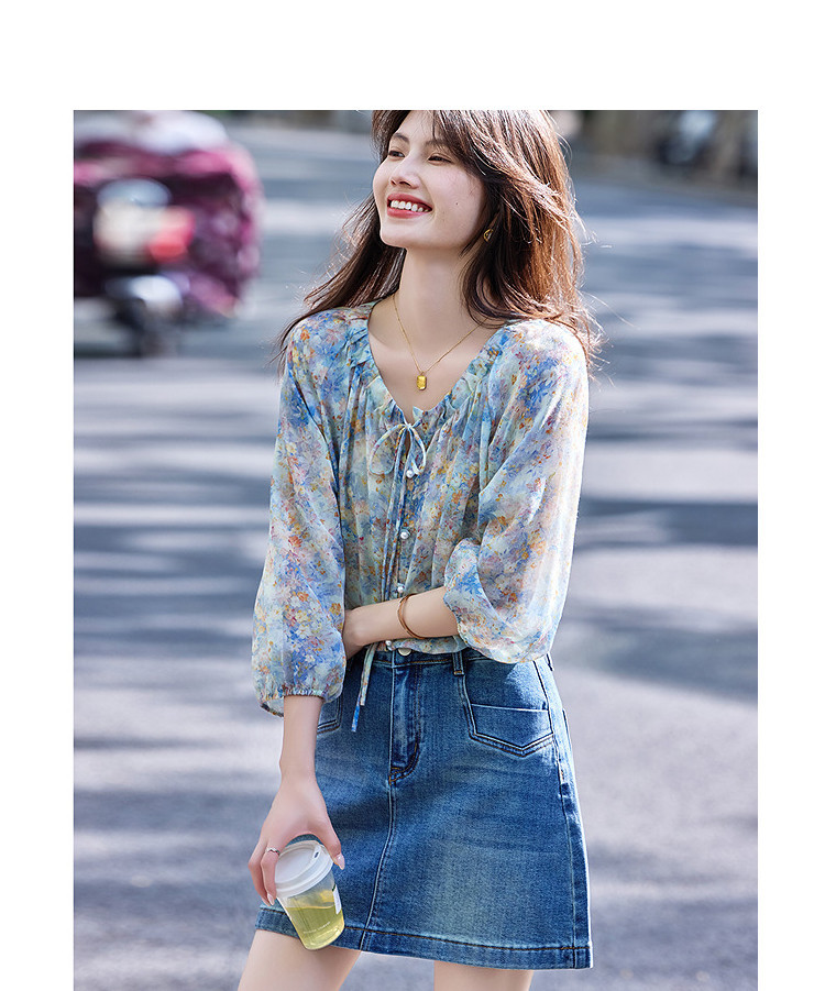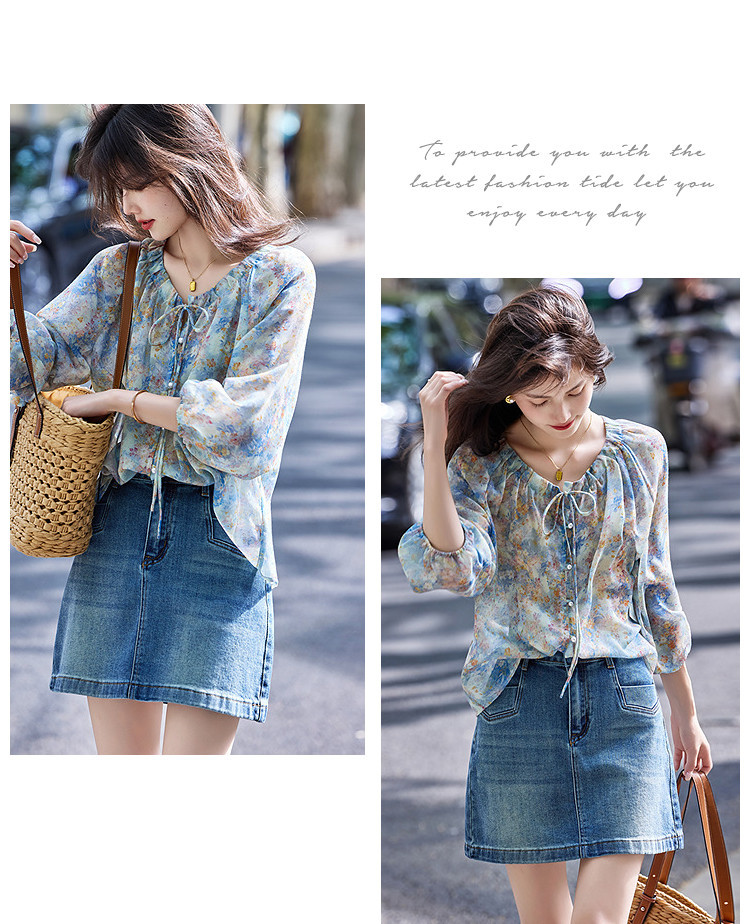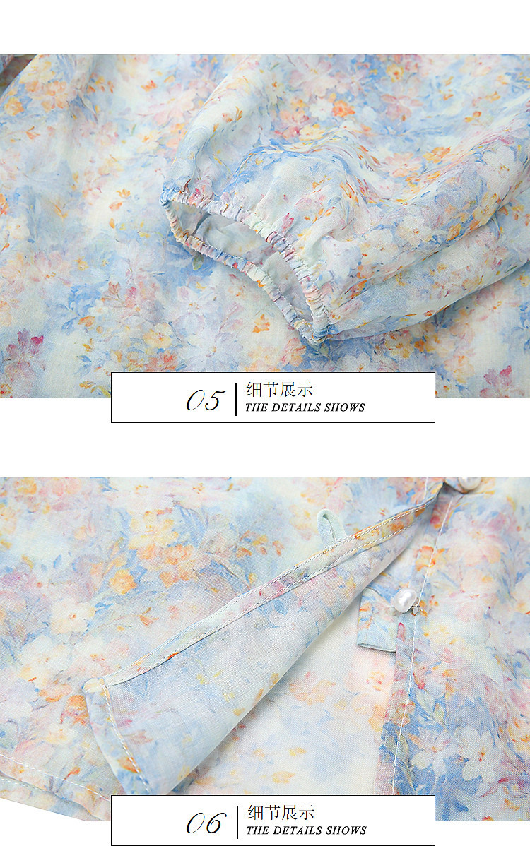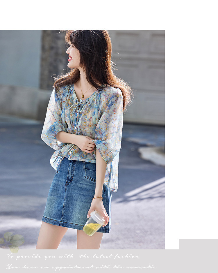 여름 느슨한 슬림 V 넥 세련된 아름다운 그늘 셔츠 최고의 프랑스 꽃 쉬폰 통근 셔츠