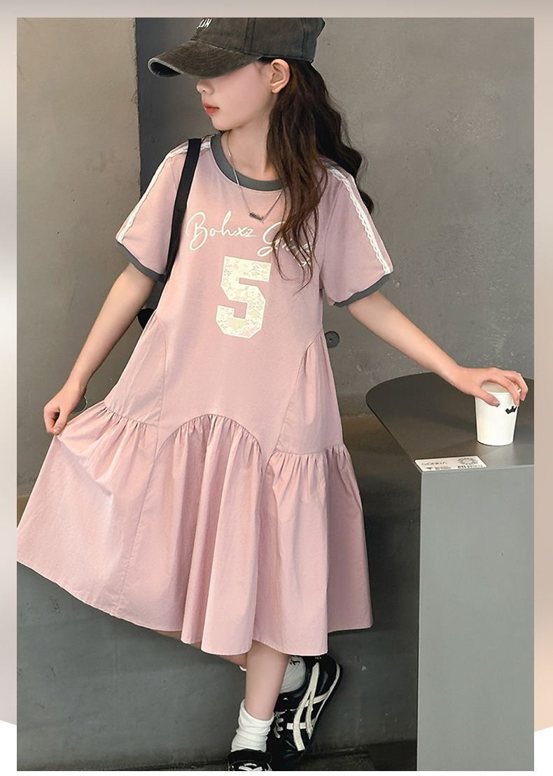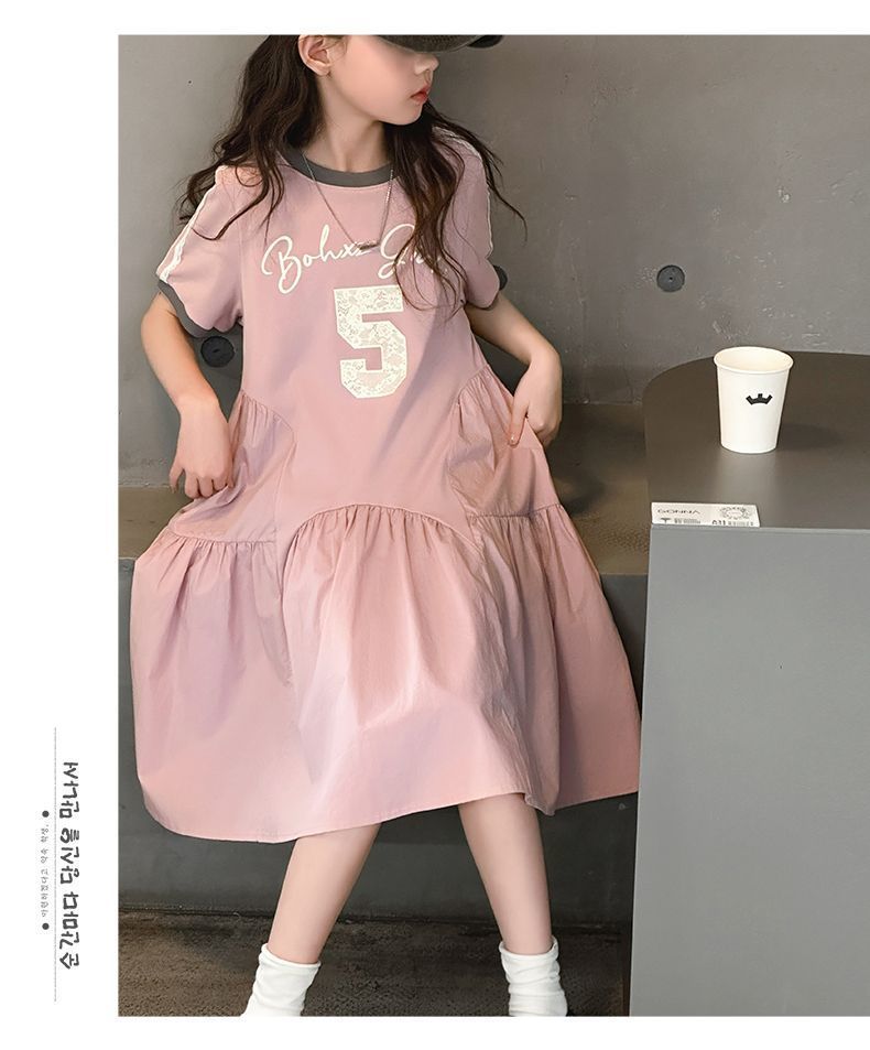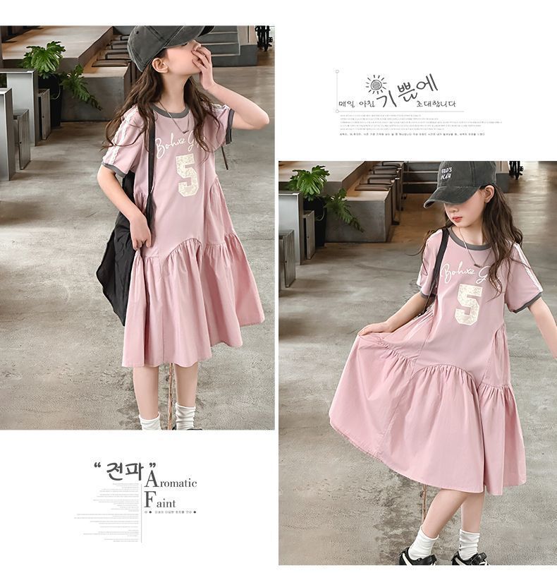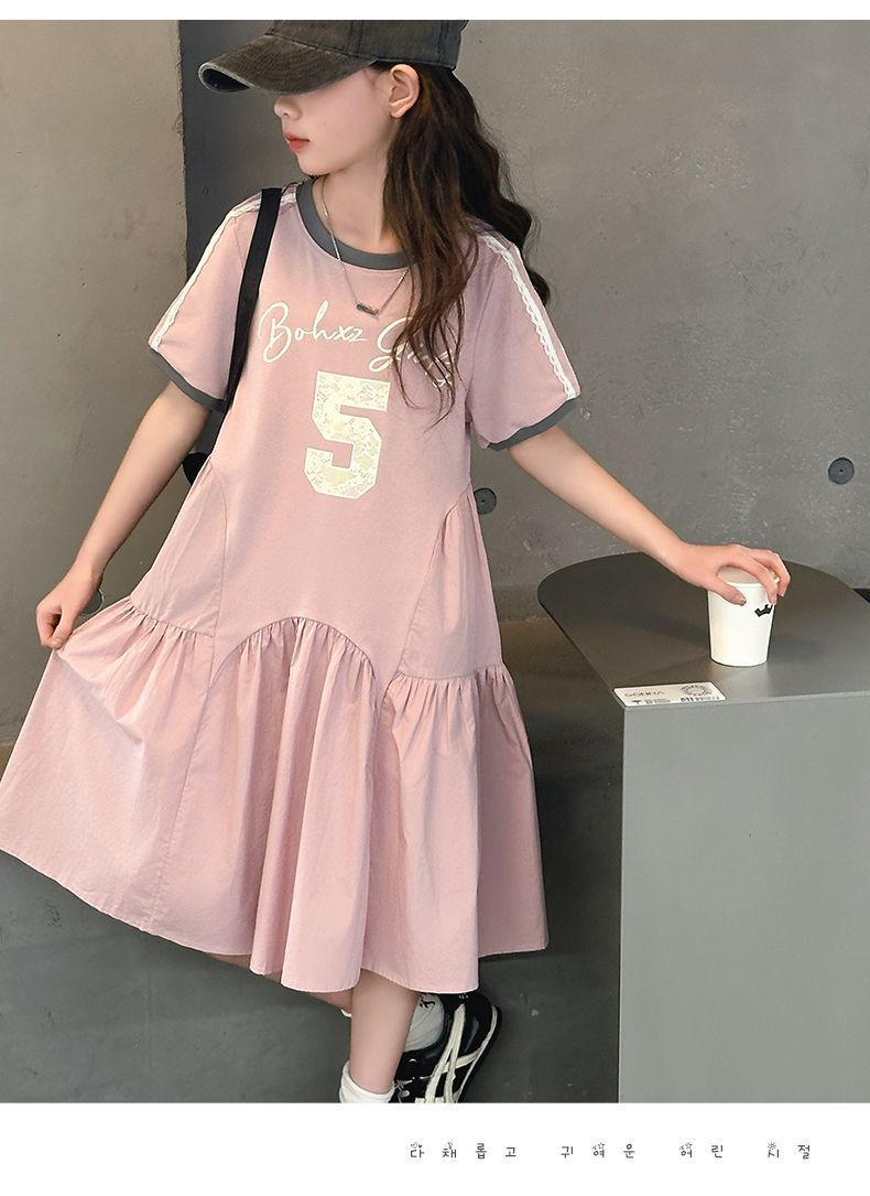 여자 드레스 여름 드레스 2025 새로운 스타일 여자 스플 라이스 프린트 드레스 큰 어린이를위한 한국 스타일 캐주얼 공주 드레스