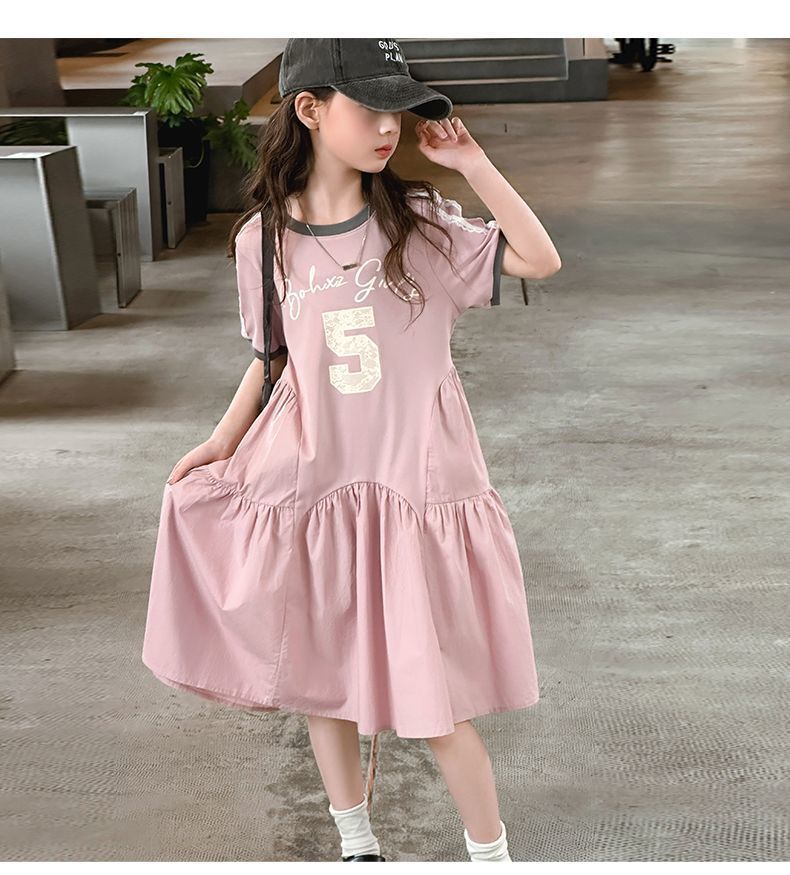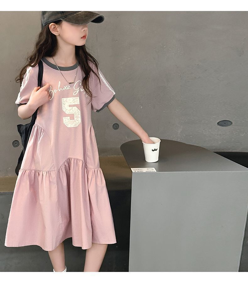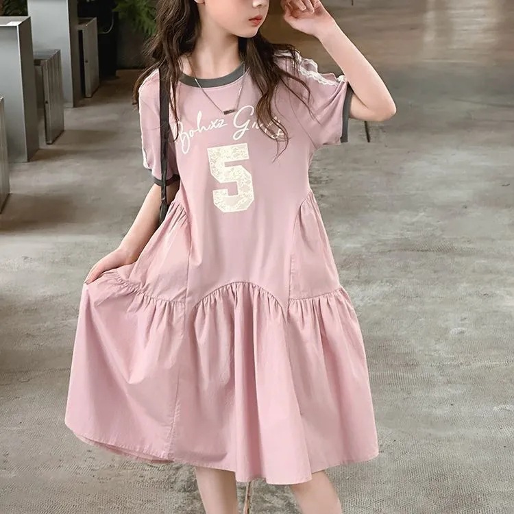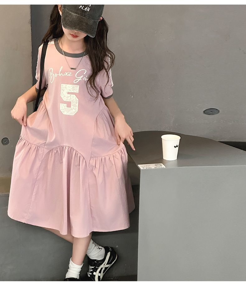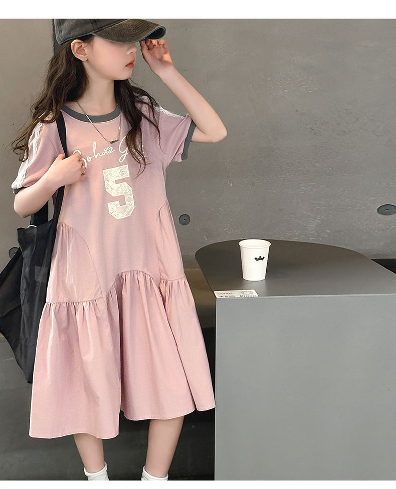 여자 드레스 여름 드레스 2025 새로운 스타일 여자 스플 라이스 프린트 드레스 큰 어린이를위한 한국 스타일 캐주얼 공주 드레스