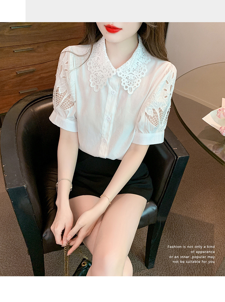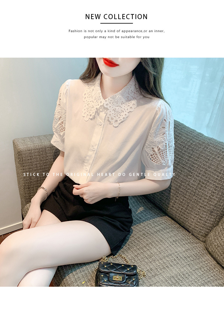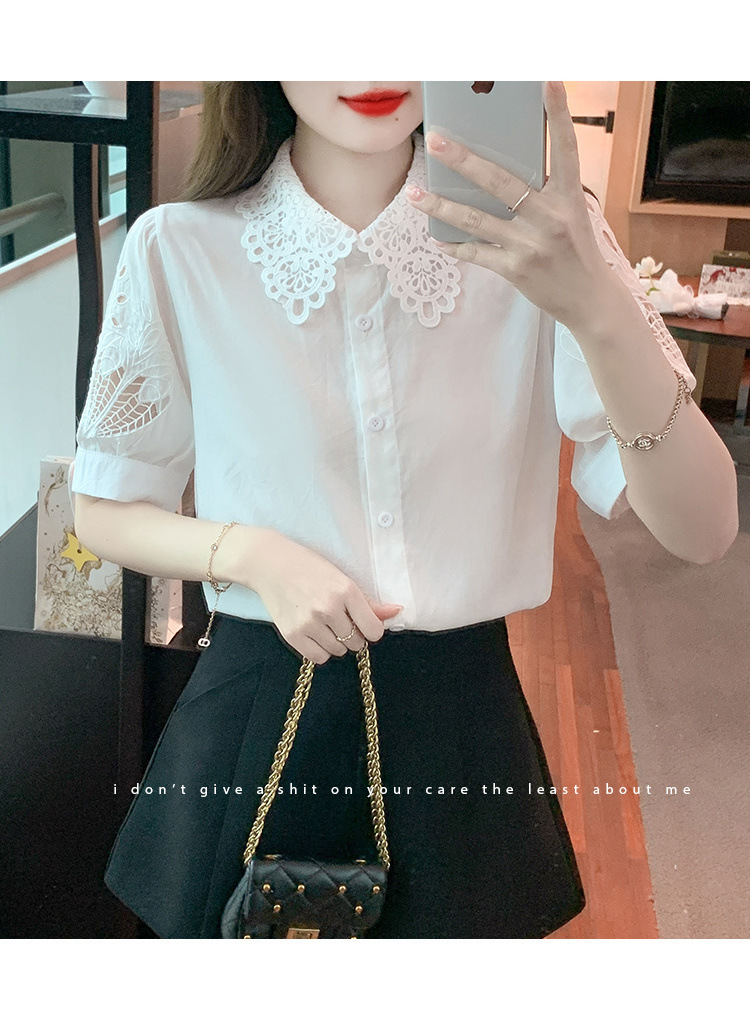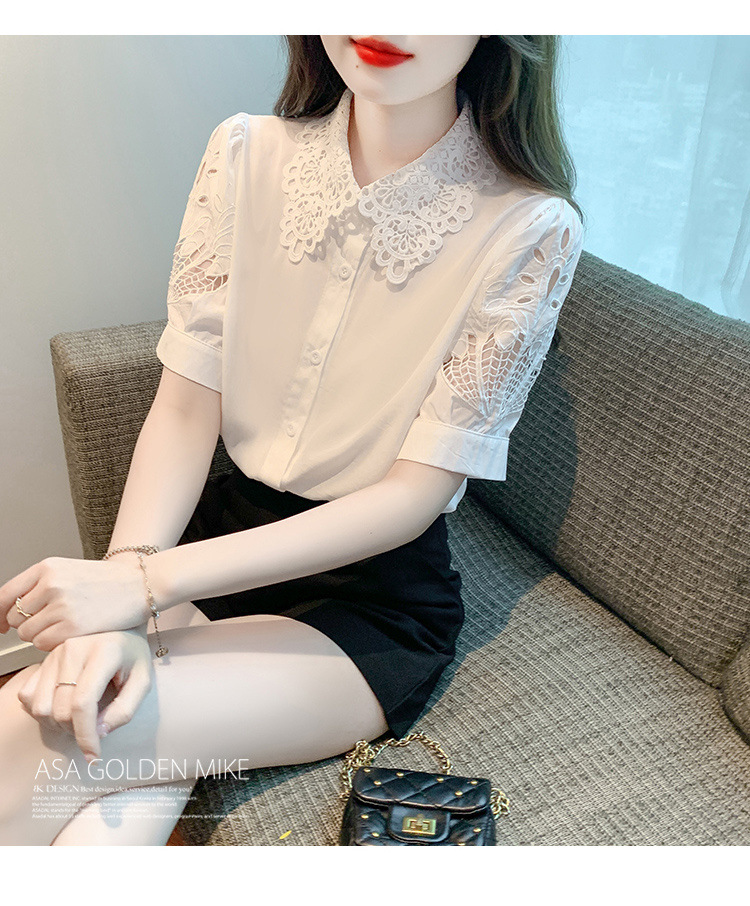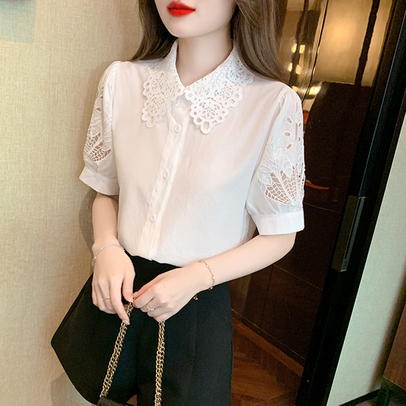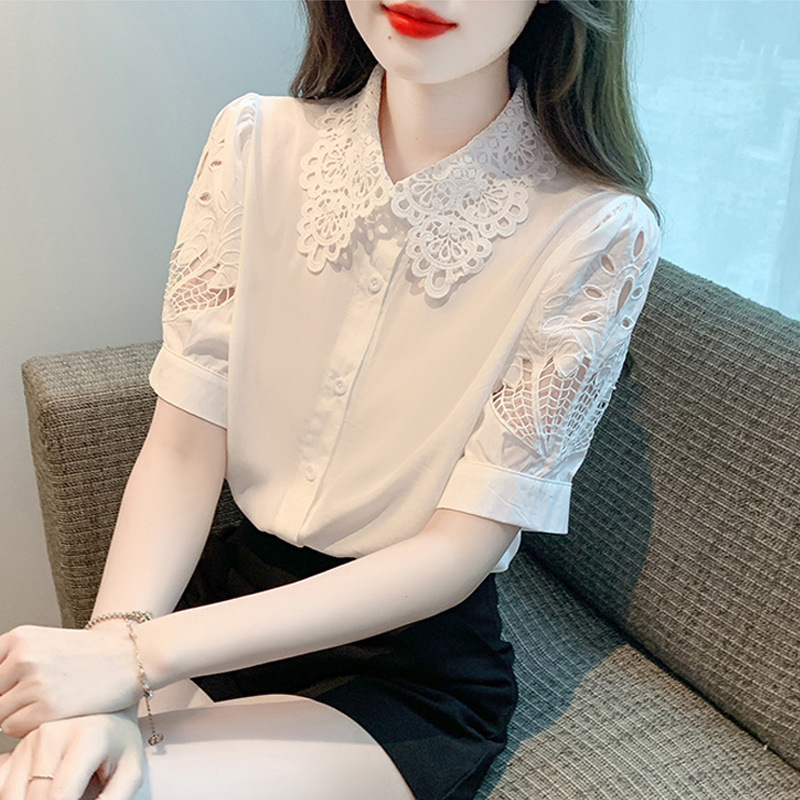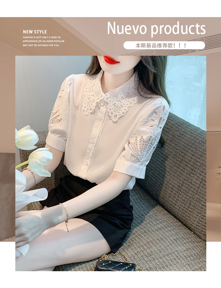 여성을위한 중공 인형 칼라 쉬폰 셔츠 2025 새로운 여름 반팔 흰색 셔츠 서양식 작은 셔츠 얇은 탑스토어 가기