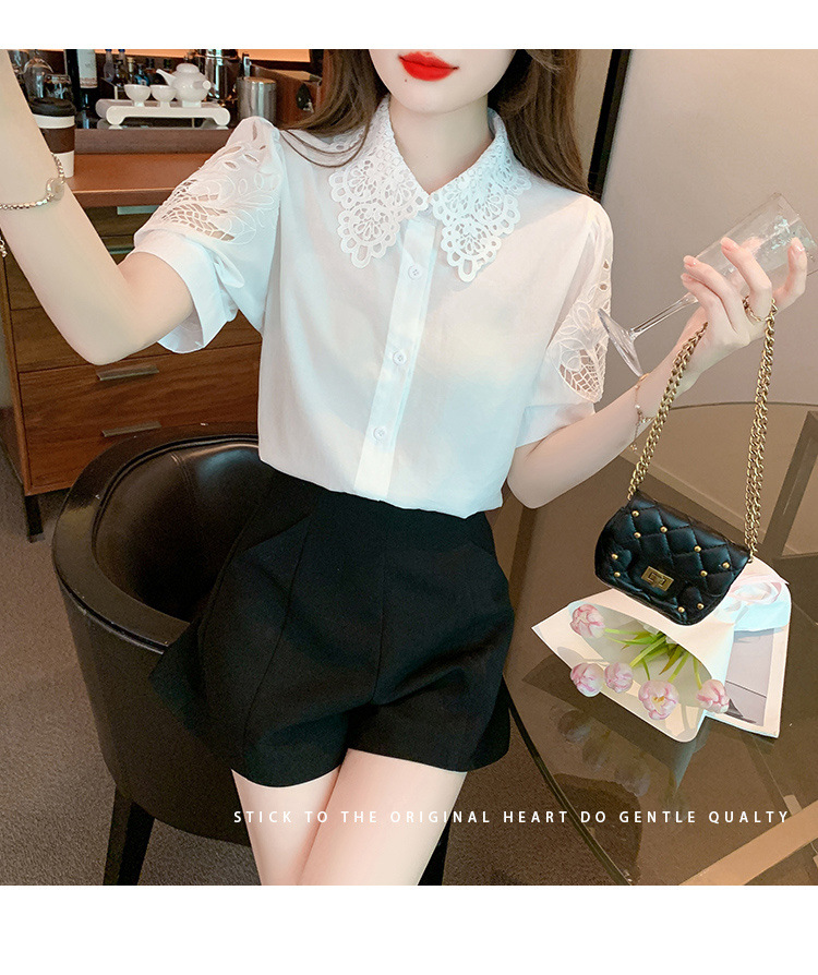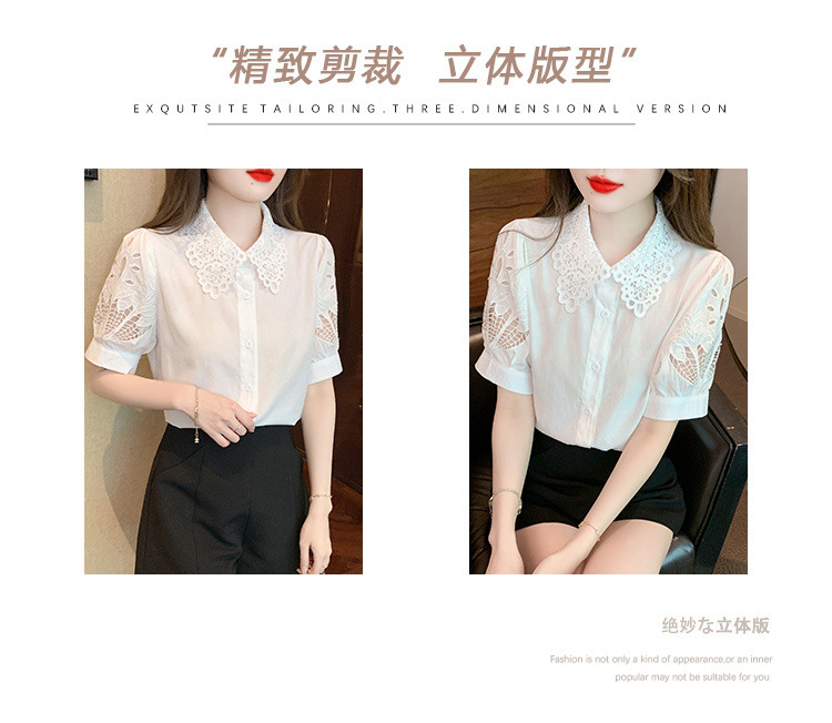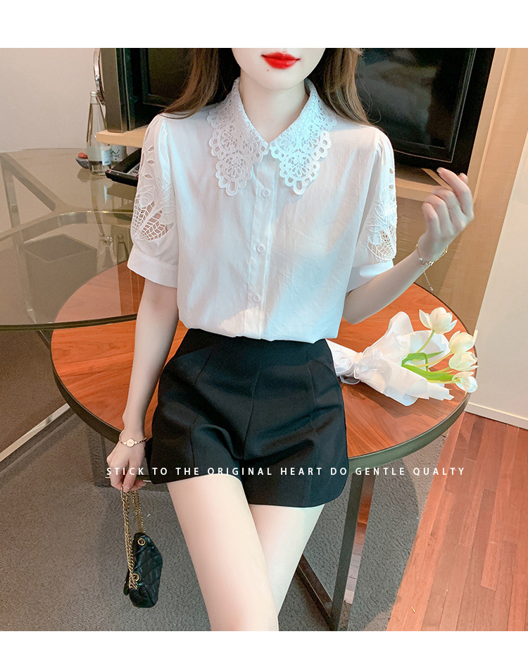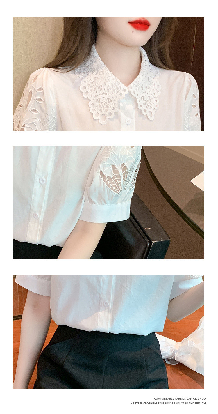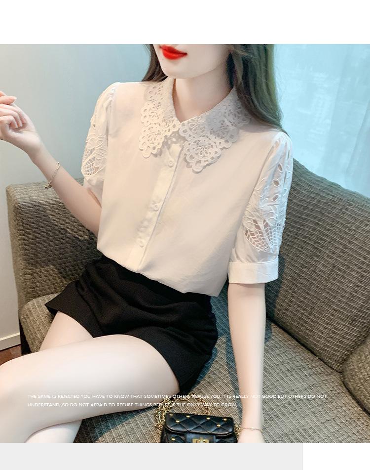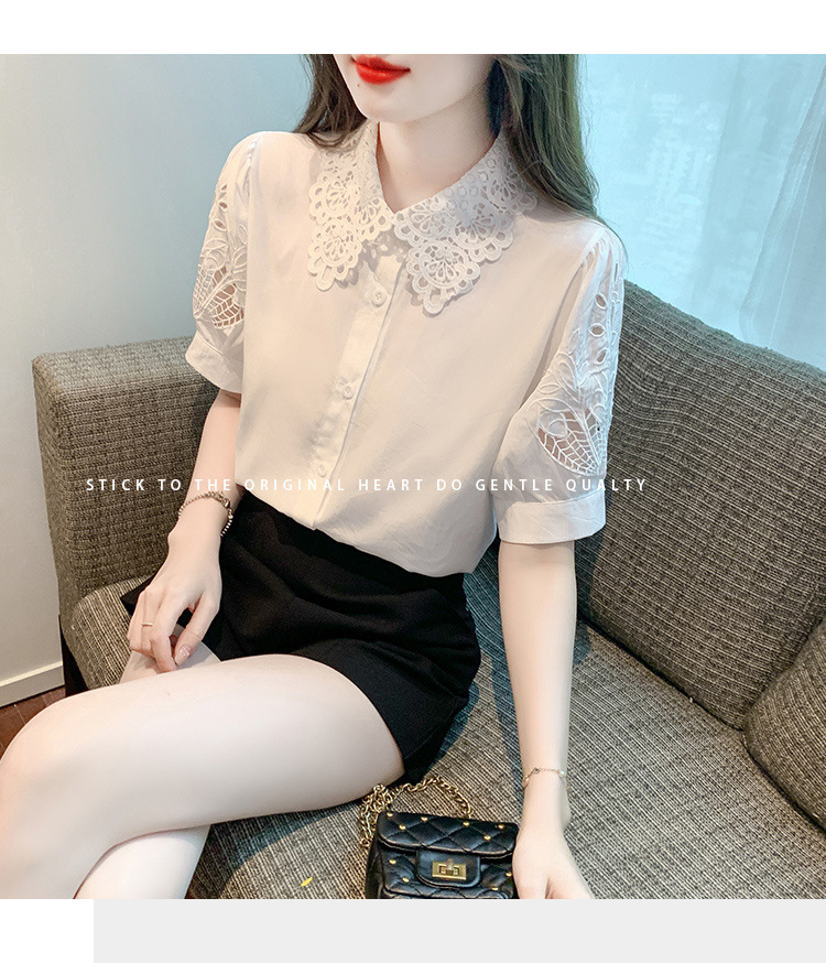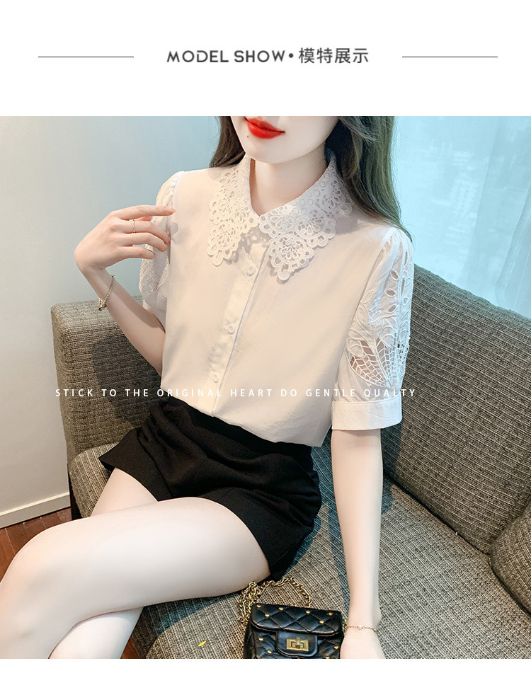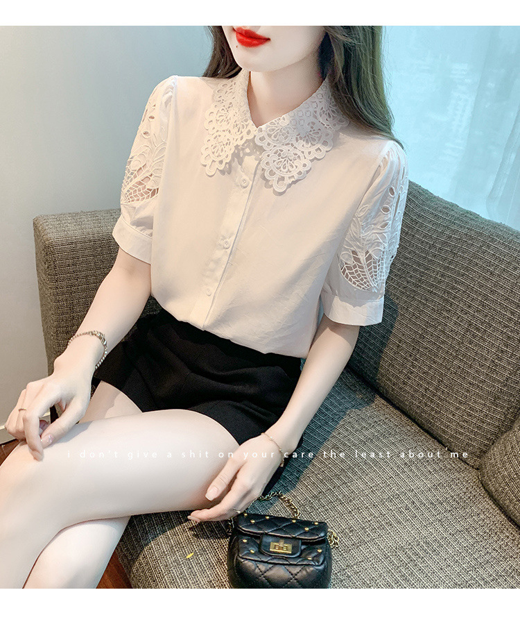 여성을위한 중공 인형 칼라 쉬폰 셔츠 2025 새로운 여름 반팔 흰색 셔츠 서양식 작은 셔츠 얇은 탑스토어 가기