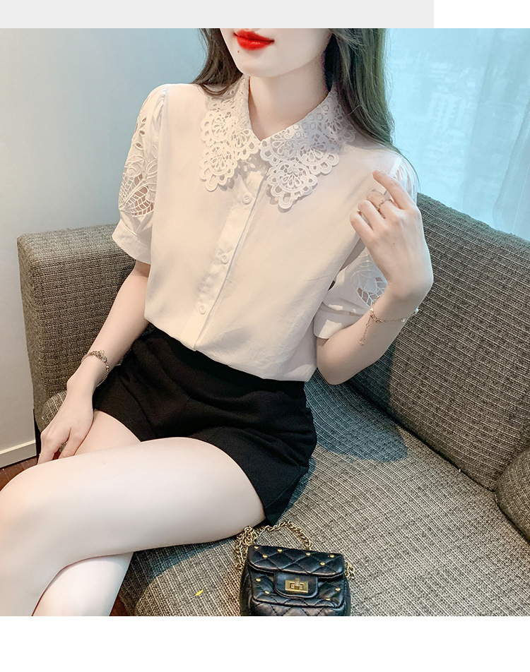 여성을위한 중공 인형 칼라 쉬폰 셔츠 2025 새로운 여름 반팔 흰색 셔츠 서양식 작은 셔츠 얇은 탑