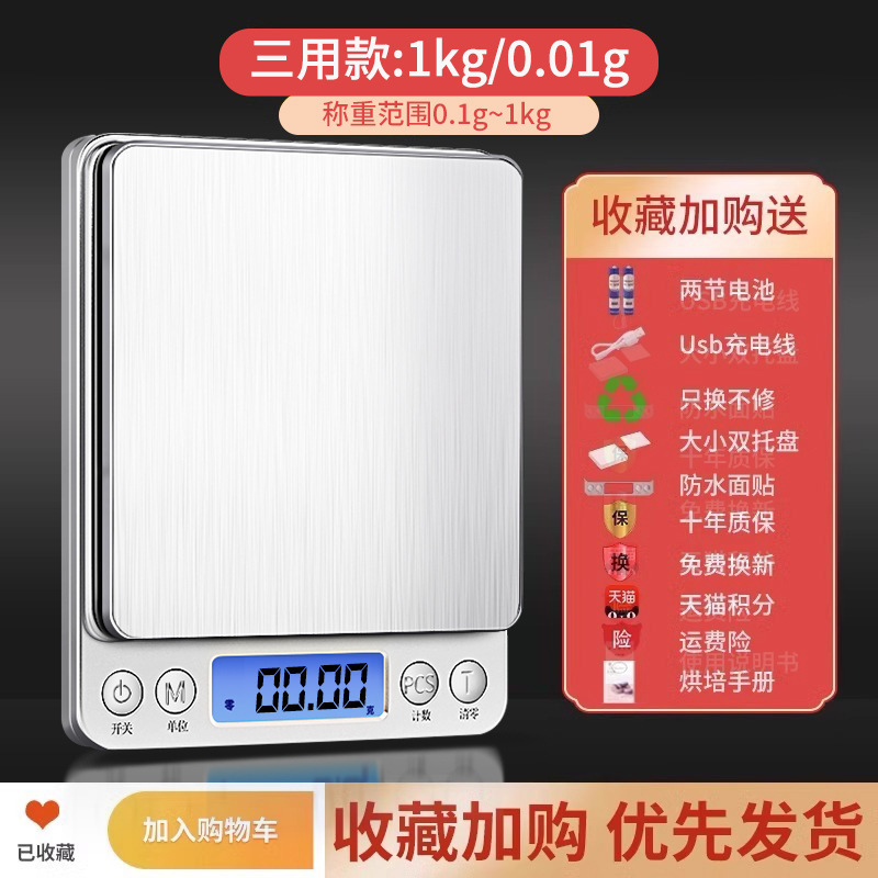 • 충전식 삼용모델 500g/0.01g 무게 + 눈금그릇 + 이중트레이 + 계량컵 + 방수스티커