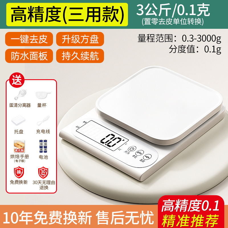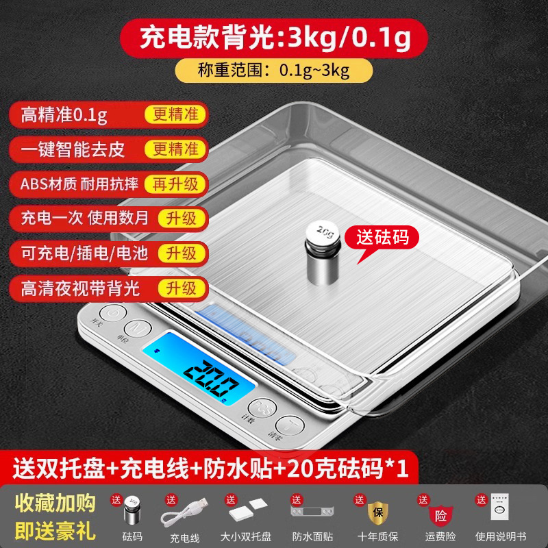 • 충전식 삼용모델 3kg/0.1g 무게 + 눈금볼 + 이중트레이 + 계량컵 + 방수스티커 9개
