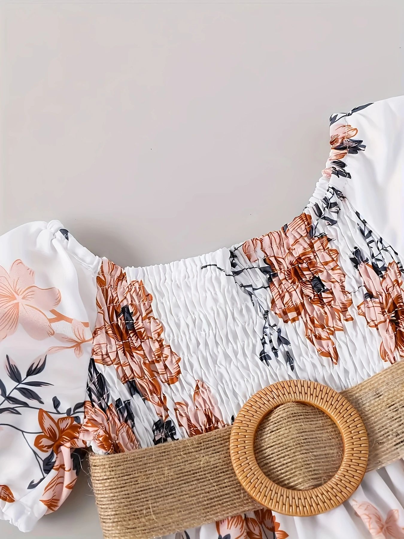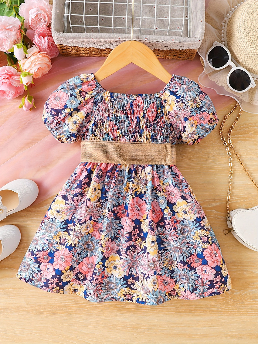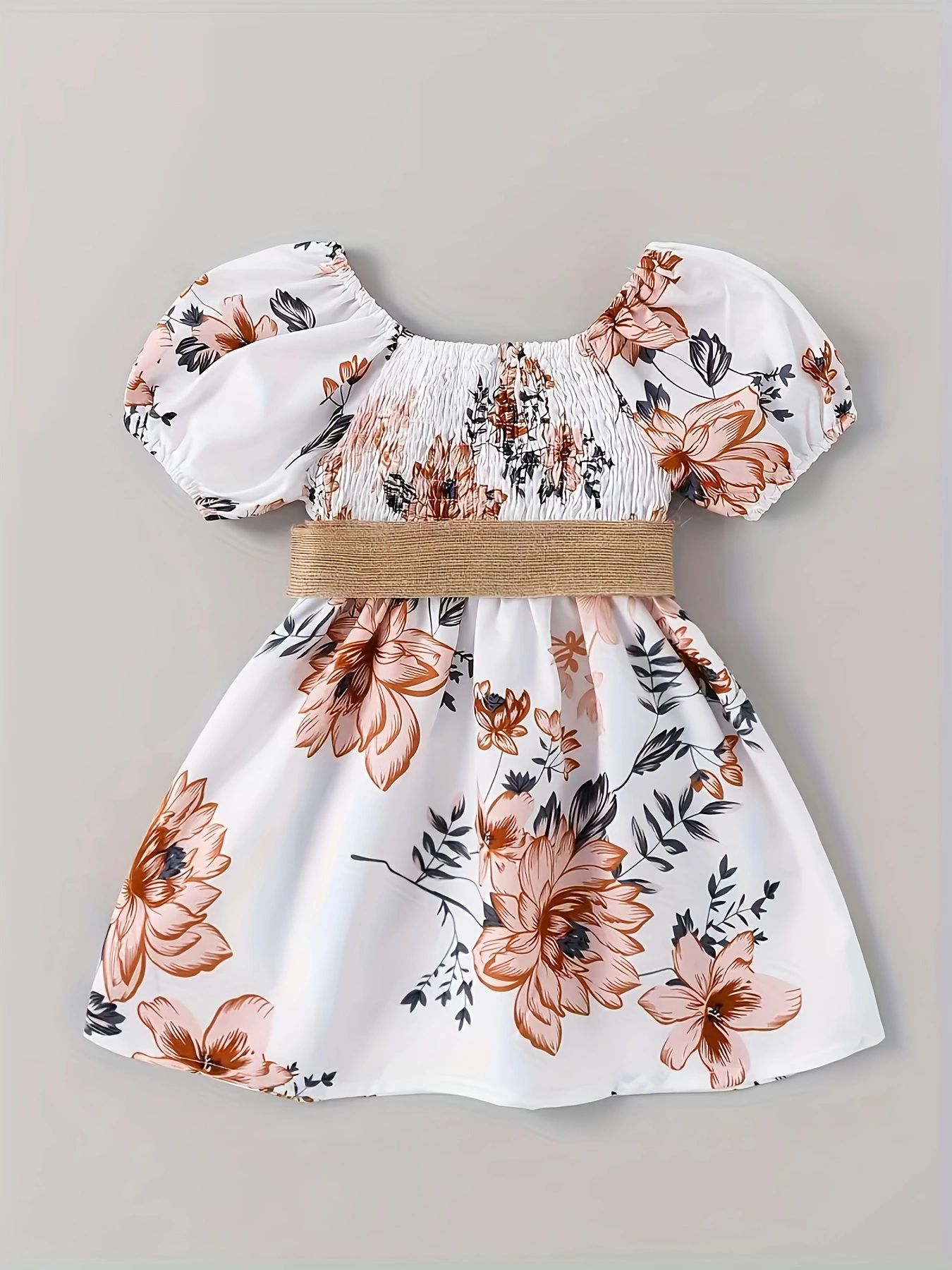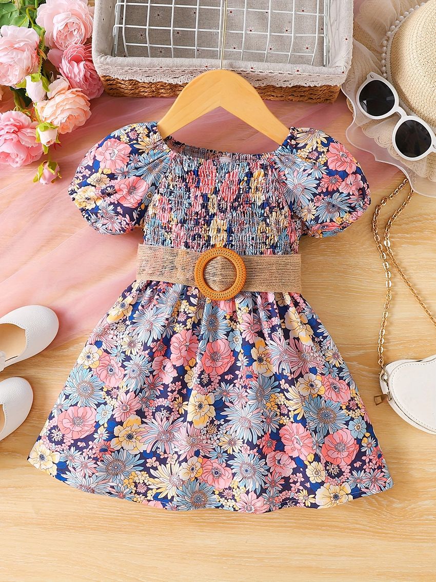 국경 간 INS 유아 및 어린 소녀 여름 스타일 퍼프 슬리브 꽃 프린트 벨트 허리 스위트 드레스