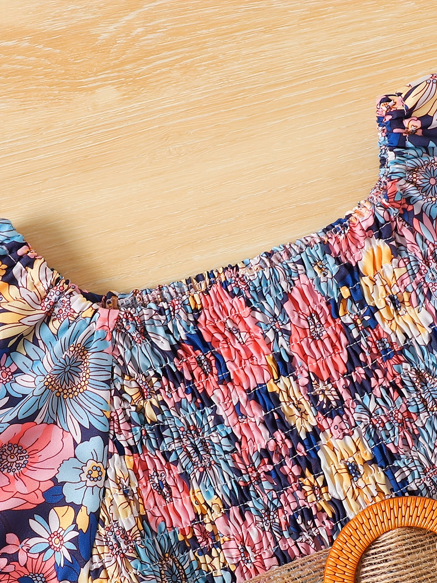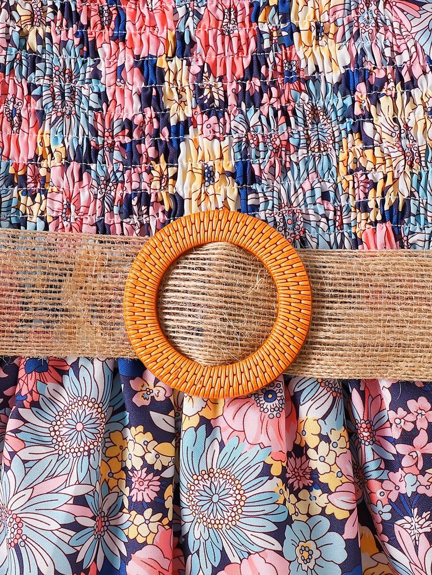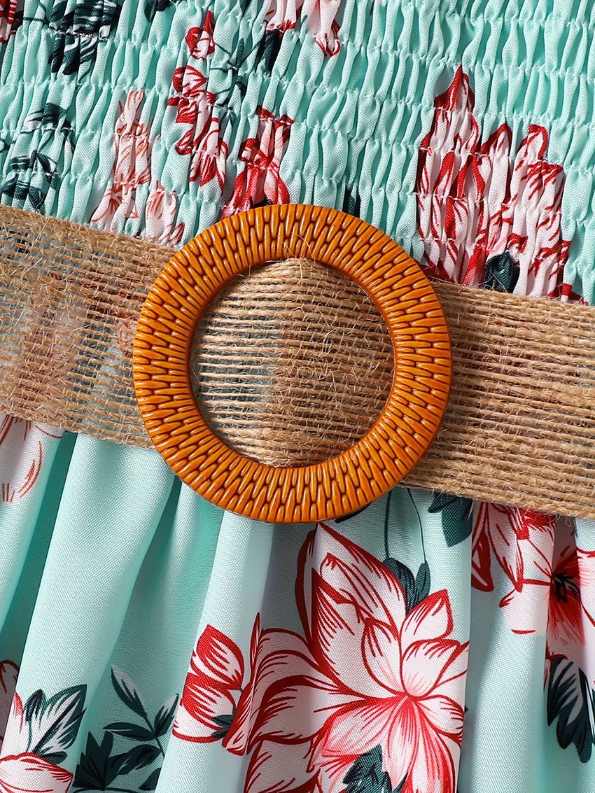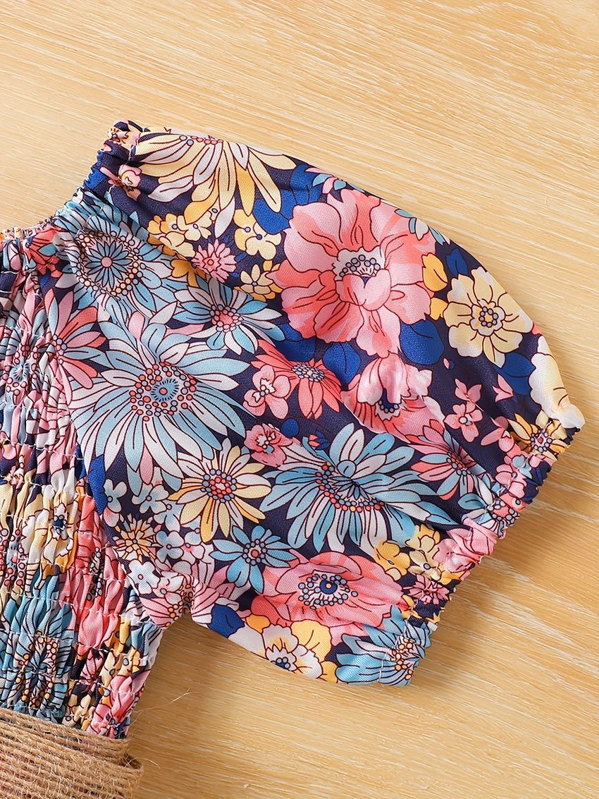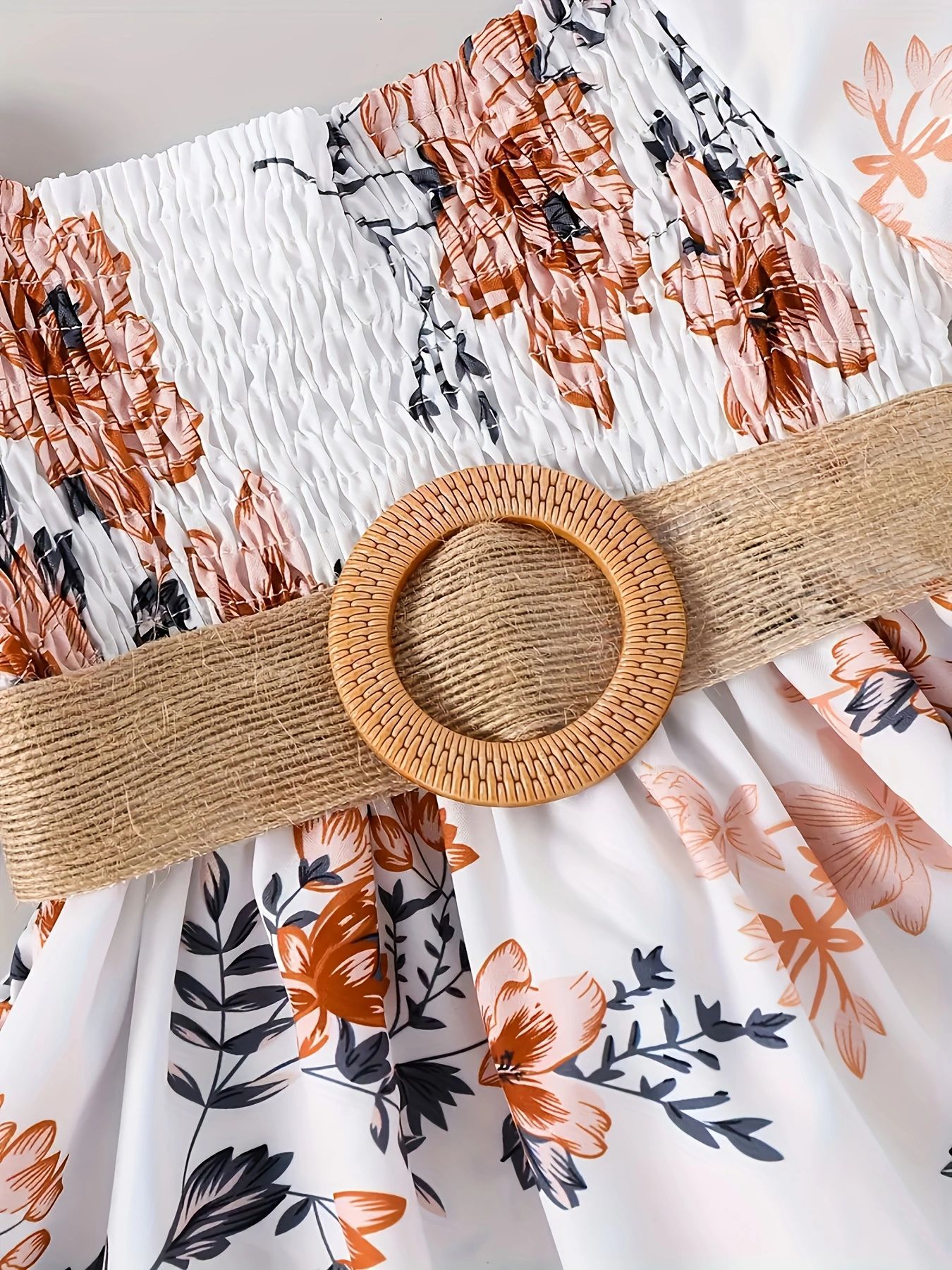 국경 간 INS 유아 및 어린 소녀 여름 스타일 퍼프 슬리브 꽃 프린트 벨트 허리 스위트 드레스