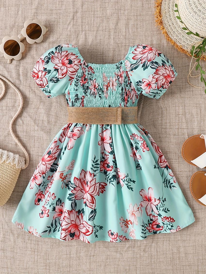 국경 간 INS 유아 및 어린 소녀 여름 스타일 퍼프 슬리브 꽃 프린트 벨트 허리 스위트 드레스스토어 가기