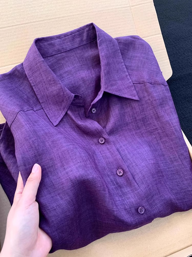 D 없이 추천합니다! 여성용 보라색 모시 폴로 칼라 셔츠 2025 봄 새로운 스타일 게으른 독특한 다용도 자외선 차단 탑스토어 가기