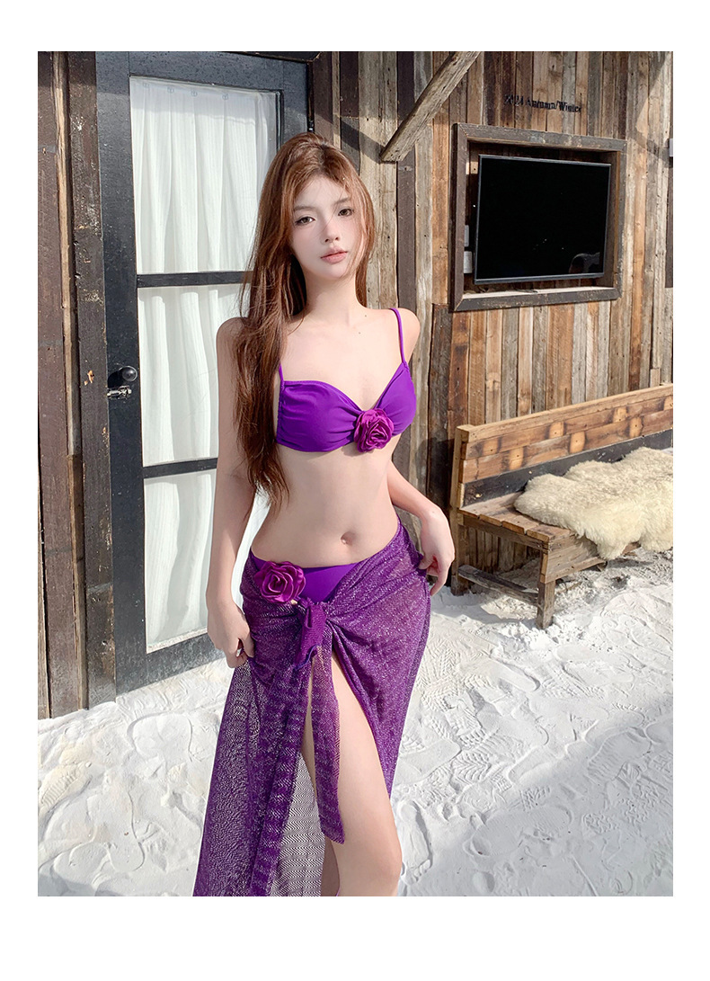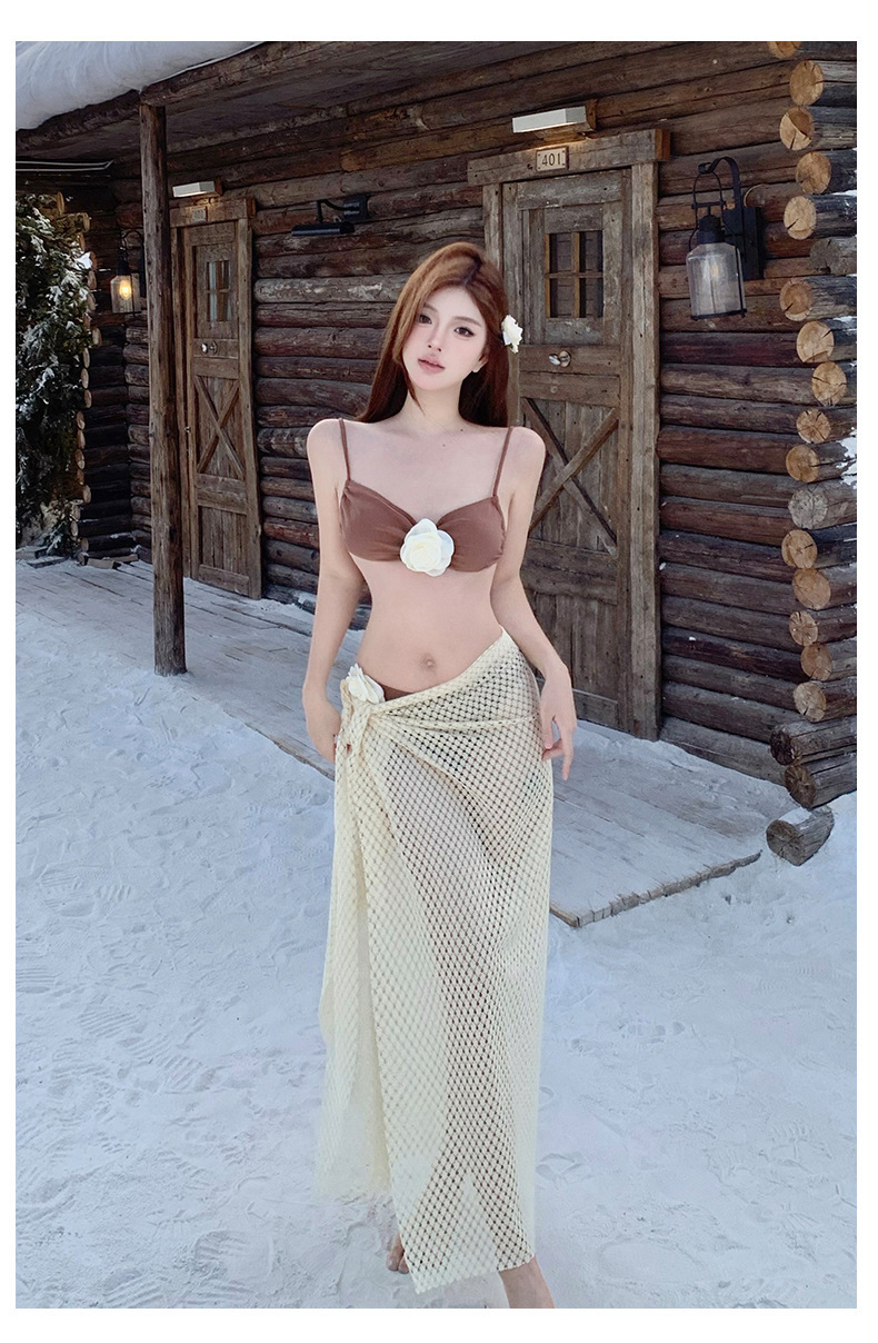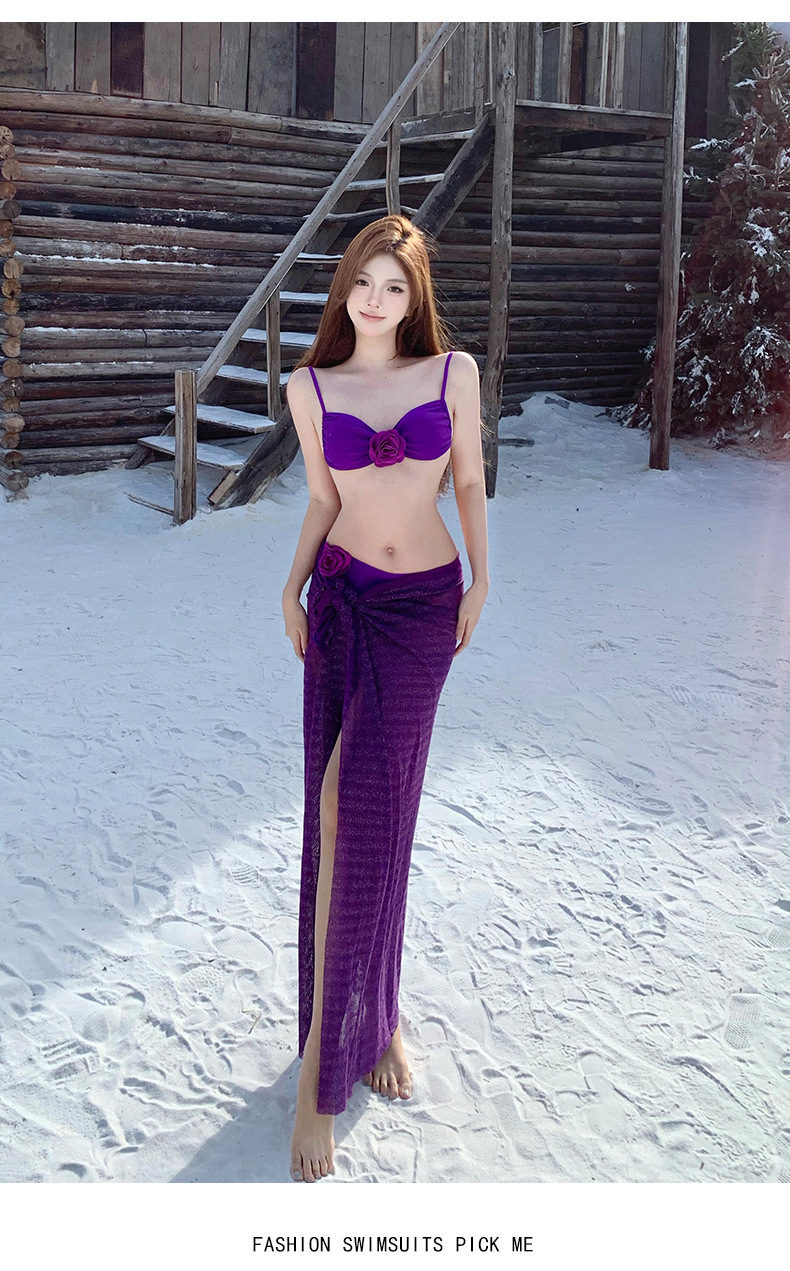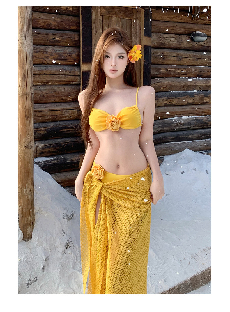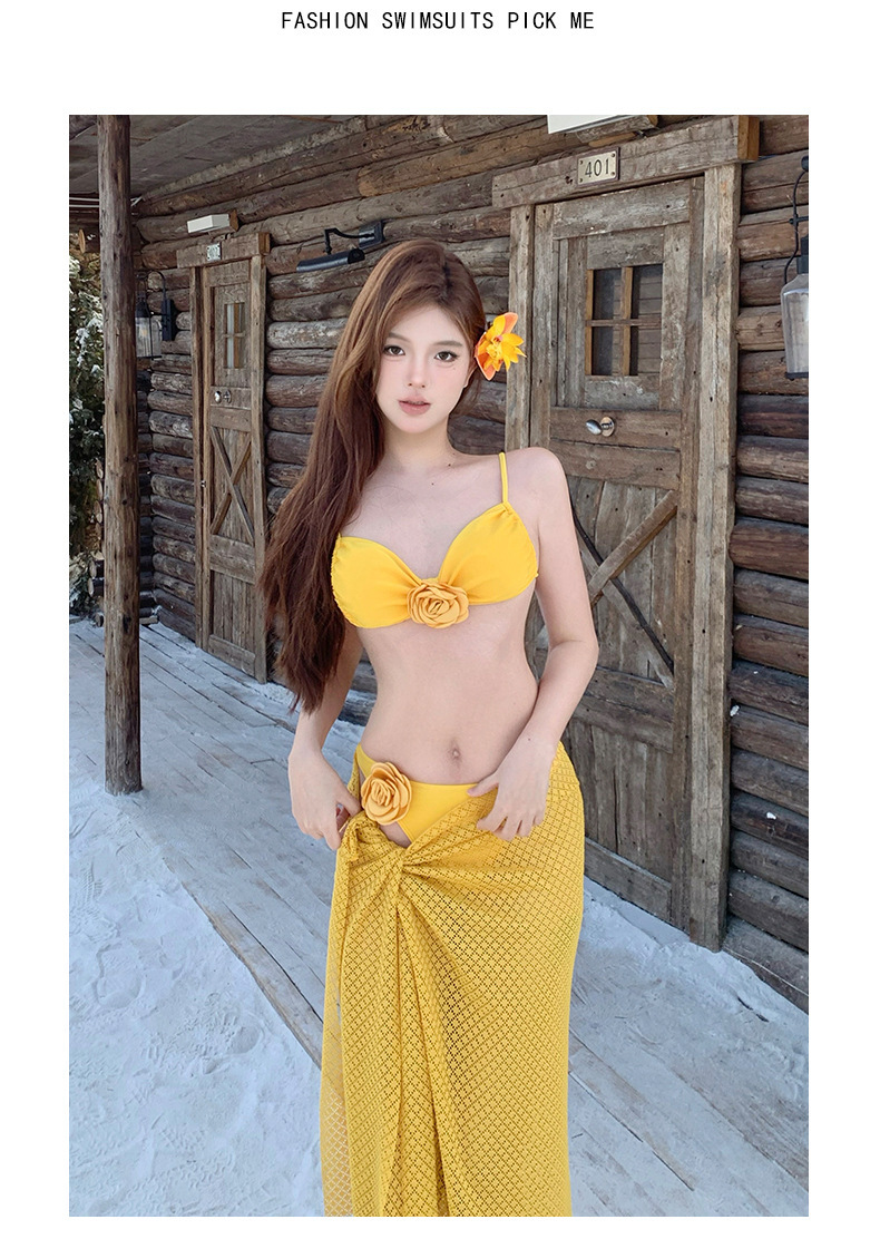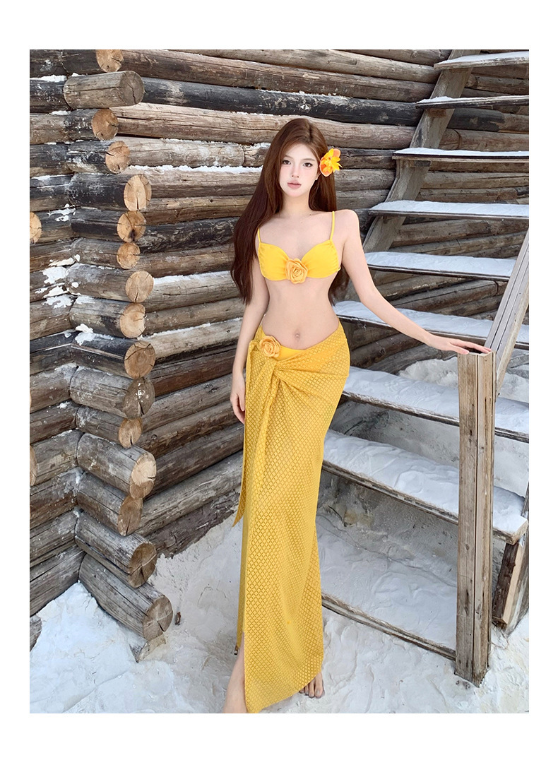 2025 새로운 노란색 긴 드레스 프랑스 꽃 순수한 욕망 섹시한 푸시 업 스플릿 수영복 여성 여름 비키니