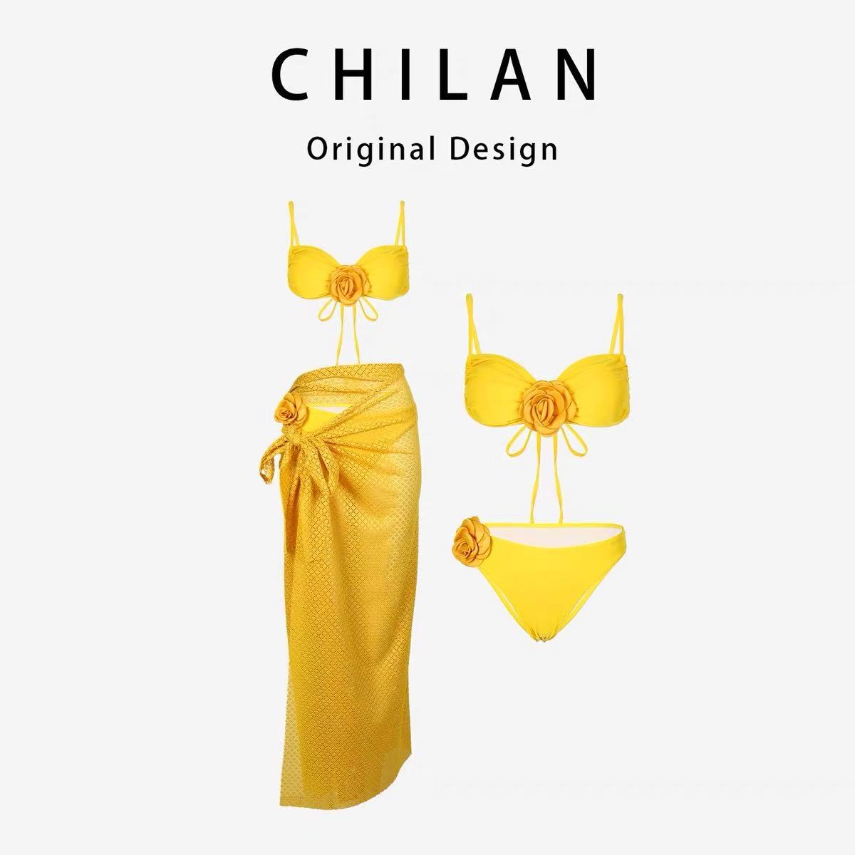 2025 새로운 노란색 긴 드레스 프랑스 꽃 순수한 욕망 섹시한 푸시 업 스플릿 수영복 여성 여름 비키니스토어 가기