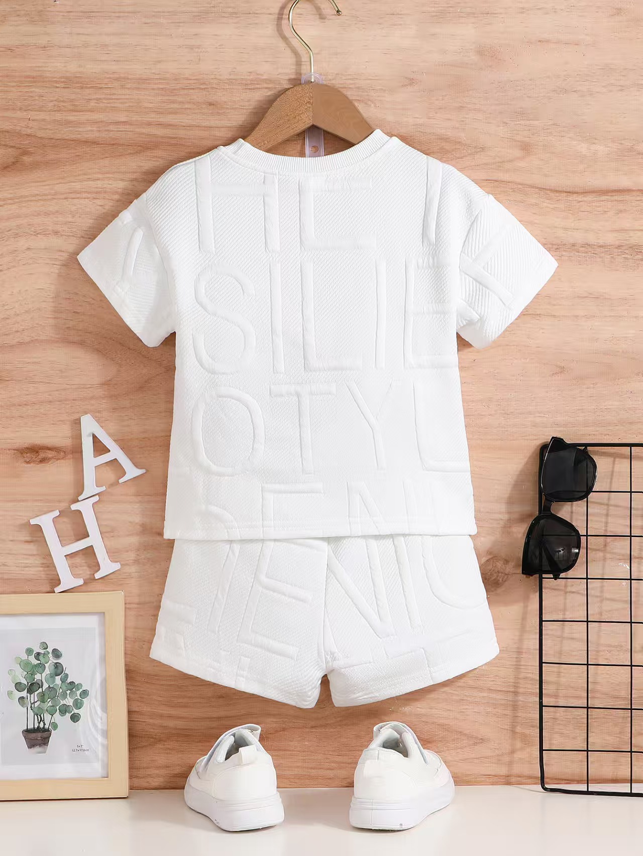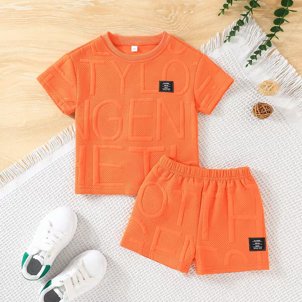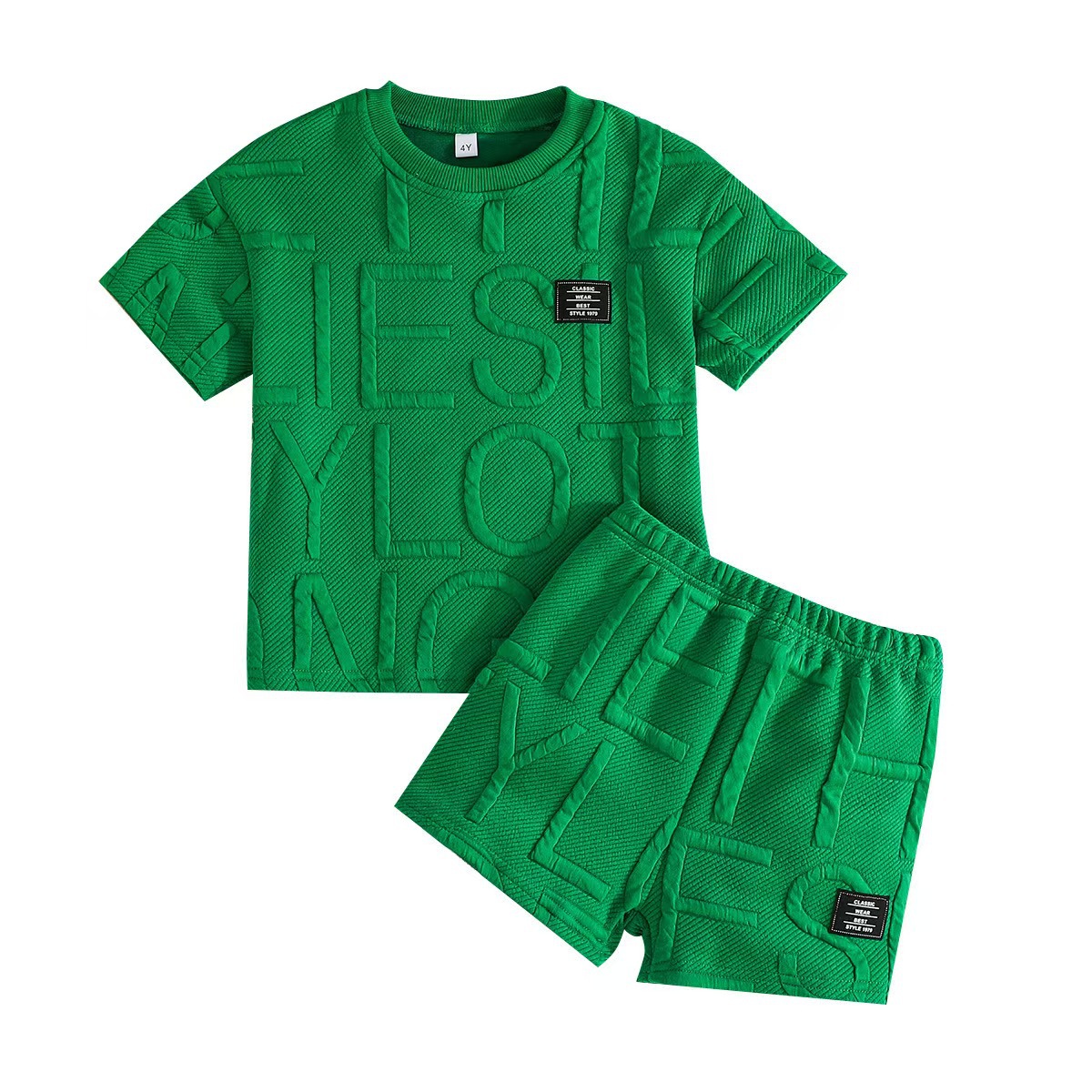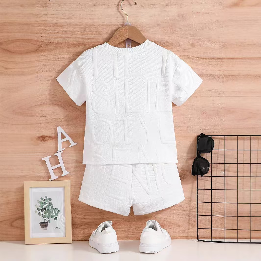 Amazon 유럽 및 미국 아동복 크로스보더 소년 여름 문자 양각 디자인 반팔 탑 + 패션 스포츠 반바지스토어 가기