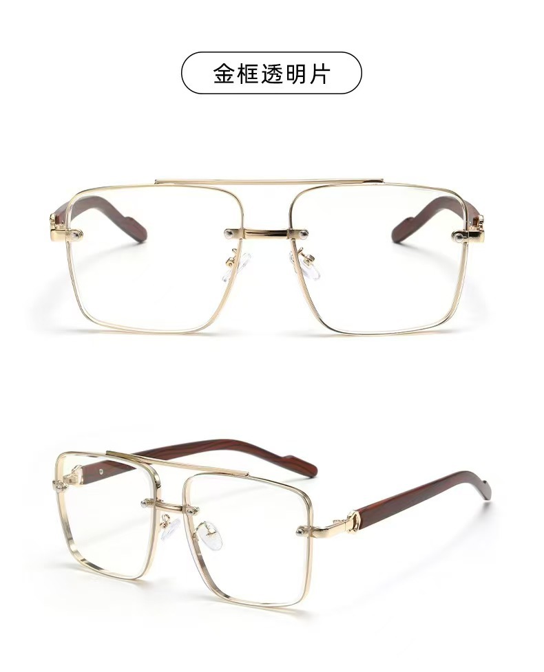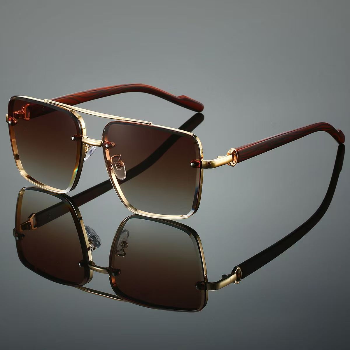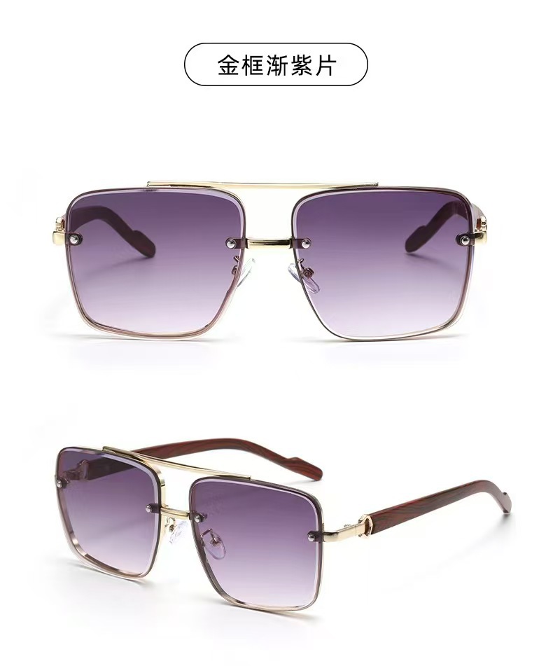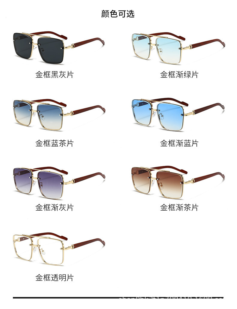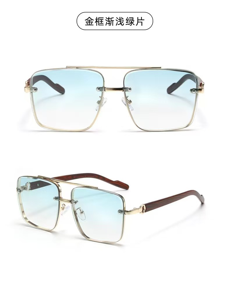 고급스러운 메탈 이중 빔 사각 프레임, 나무 무늬 다리 디자인의 선글라스, 유럽과 미국에서 유행하는 드라이빙 및 스트리트 스타일 무테 선글라스스토어 가기