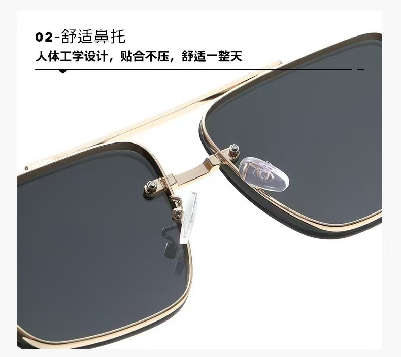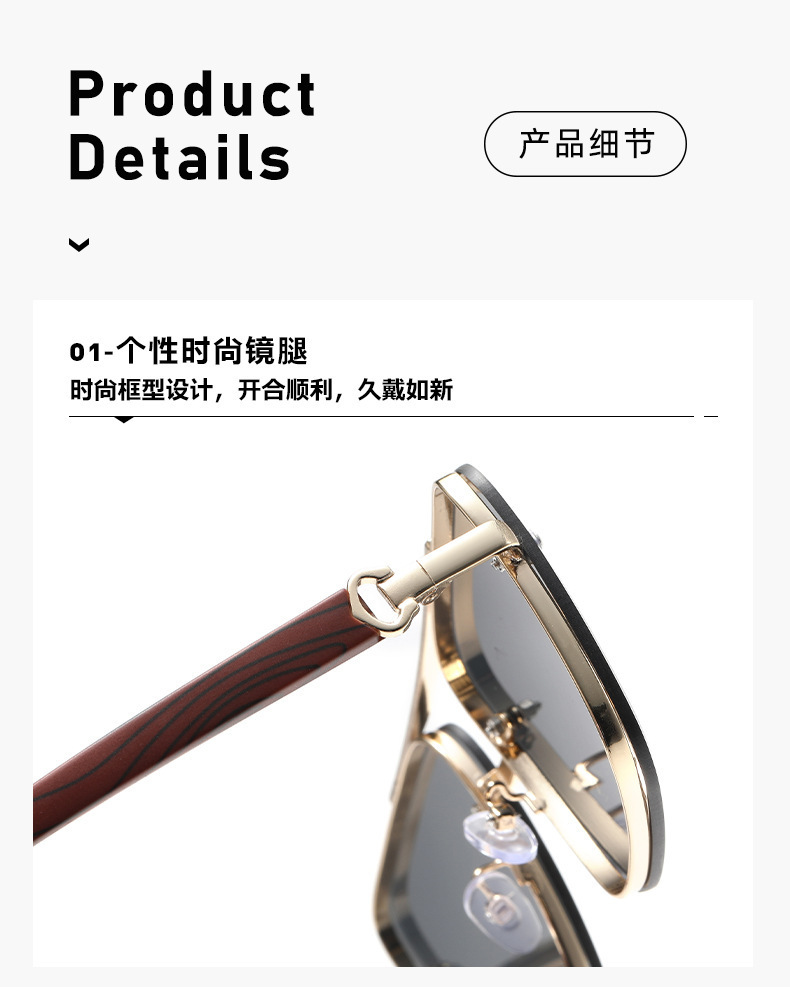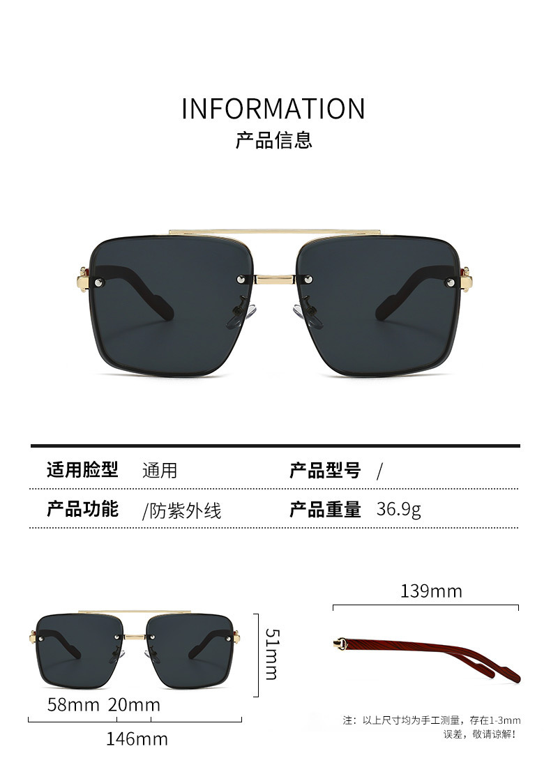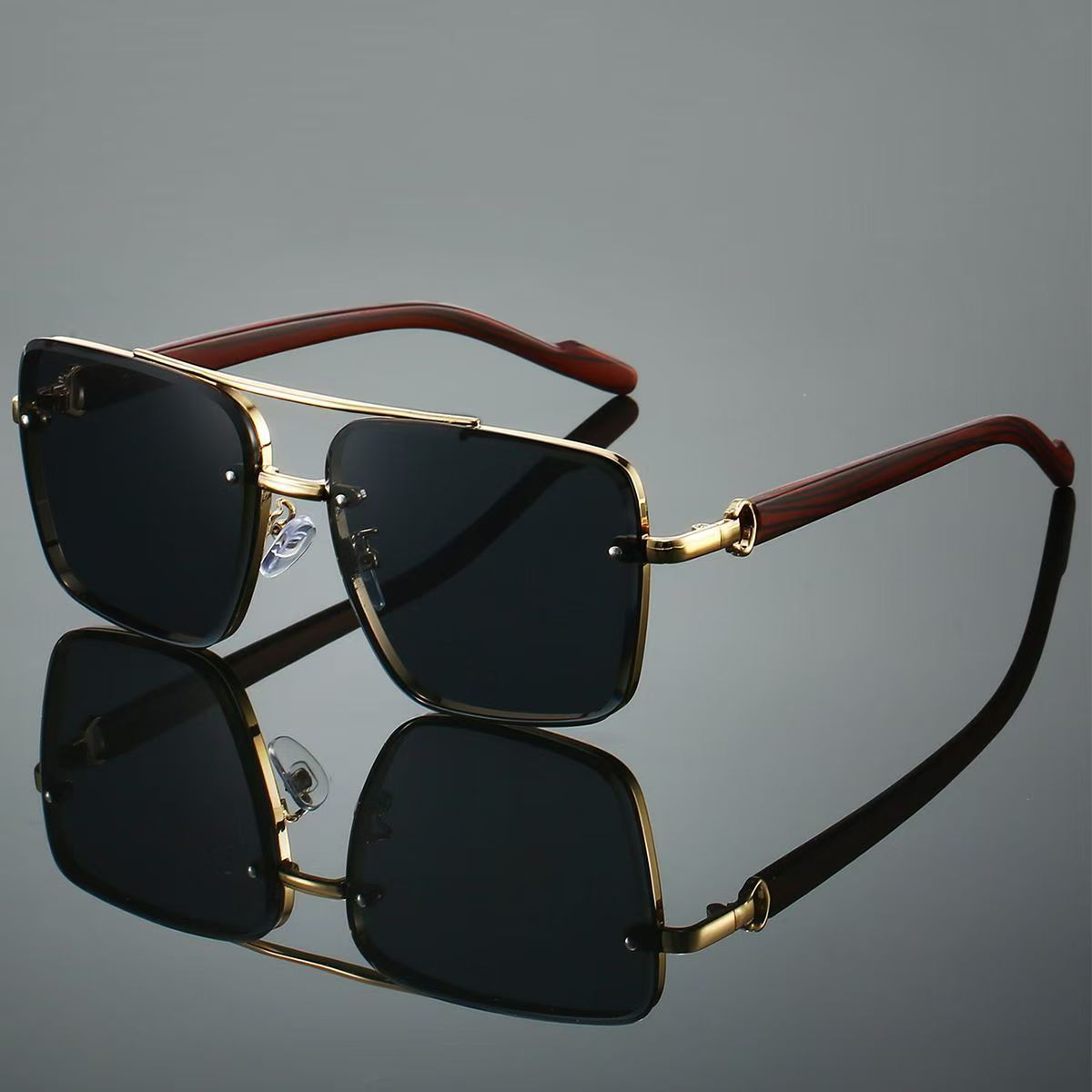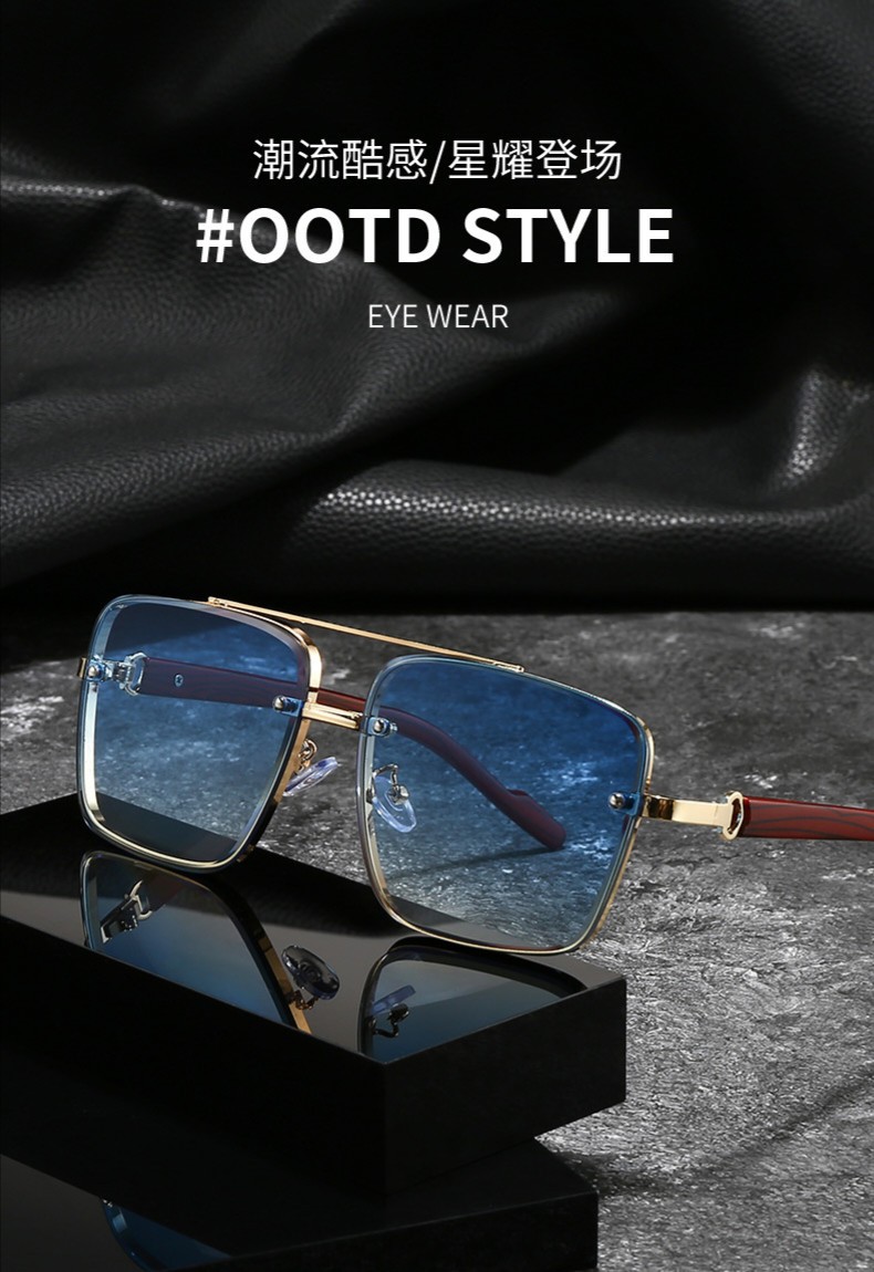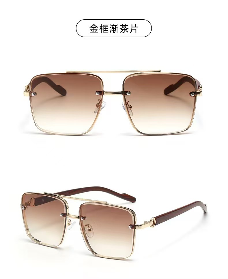 고급스러운 메탈 이중 빔 사각 프레임, 나무 무늬 다리 디자인의 선글라스, 유럽과 미국에서 유행하는 드라이빙 및 스트리트 스타일 무테 선글라스