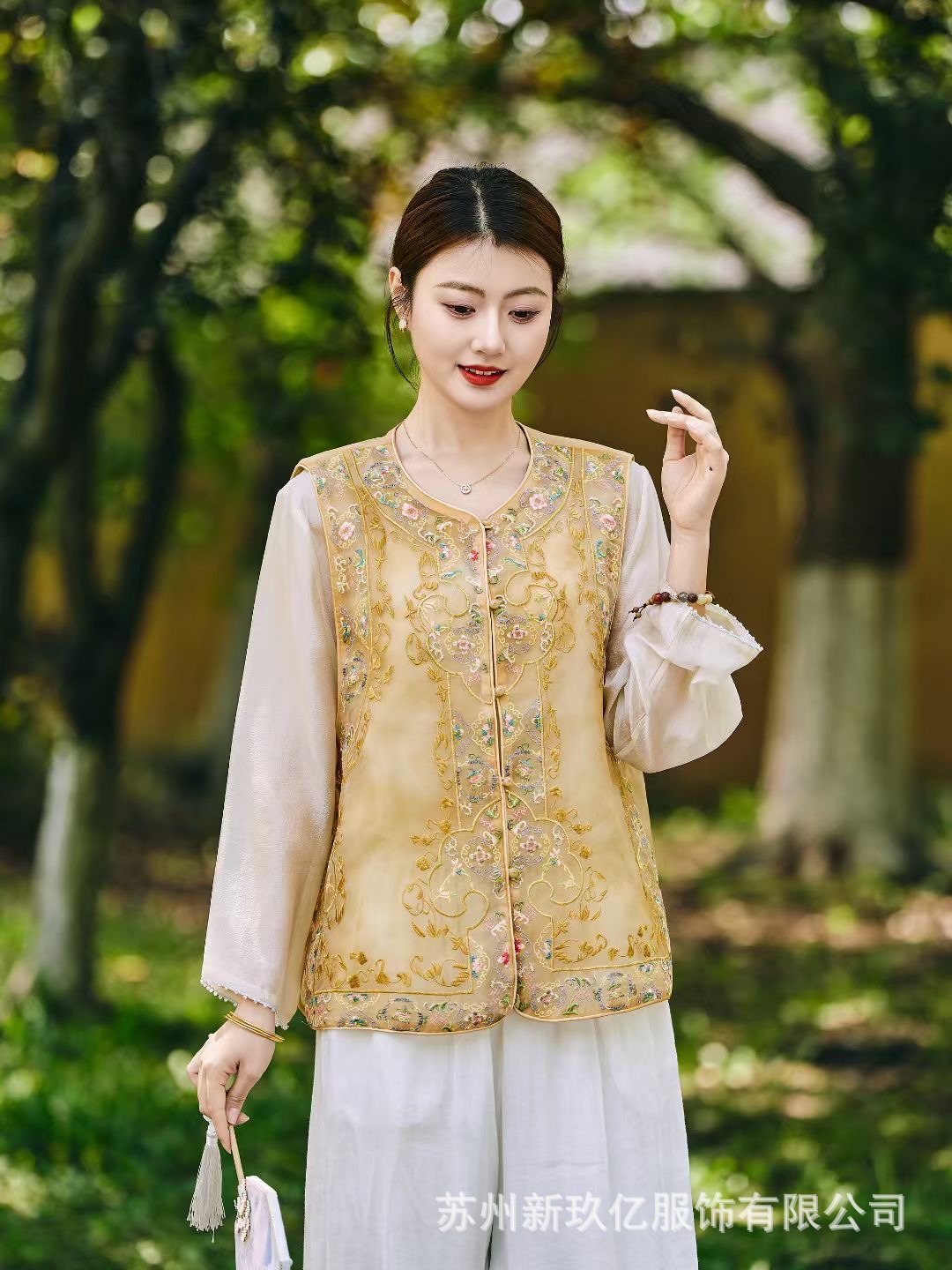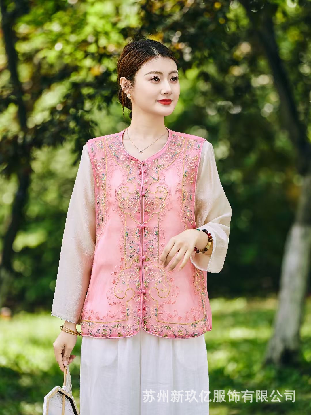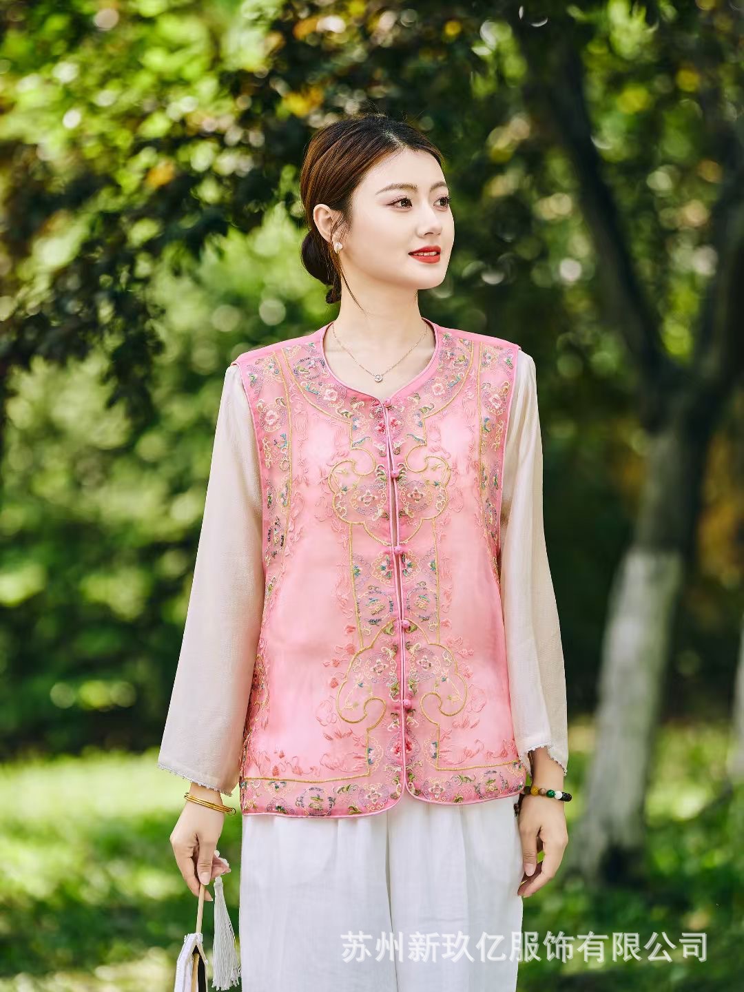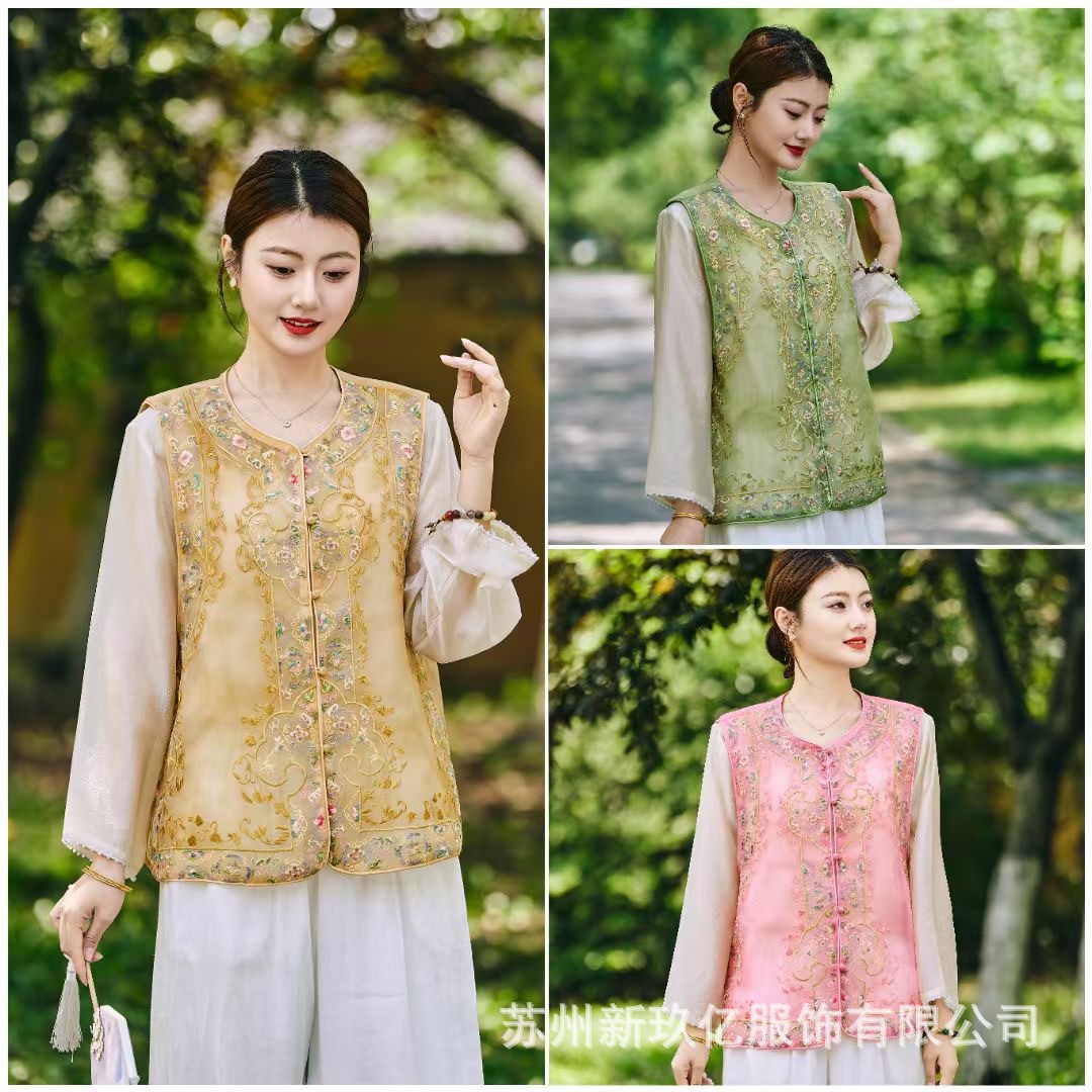 여성을위한 새로운 중국 스타일 국립 스타일 Organza 중공업 자수 라운드 넥 조끼 2025 여름 새로운 민족 스타일 복고풍 조끼