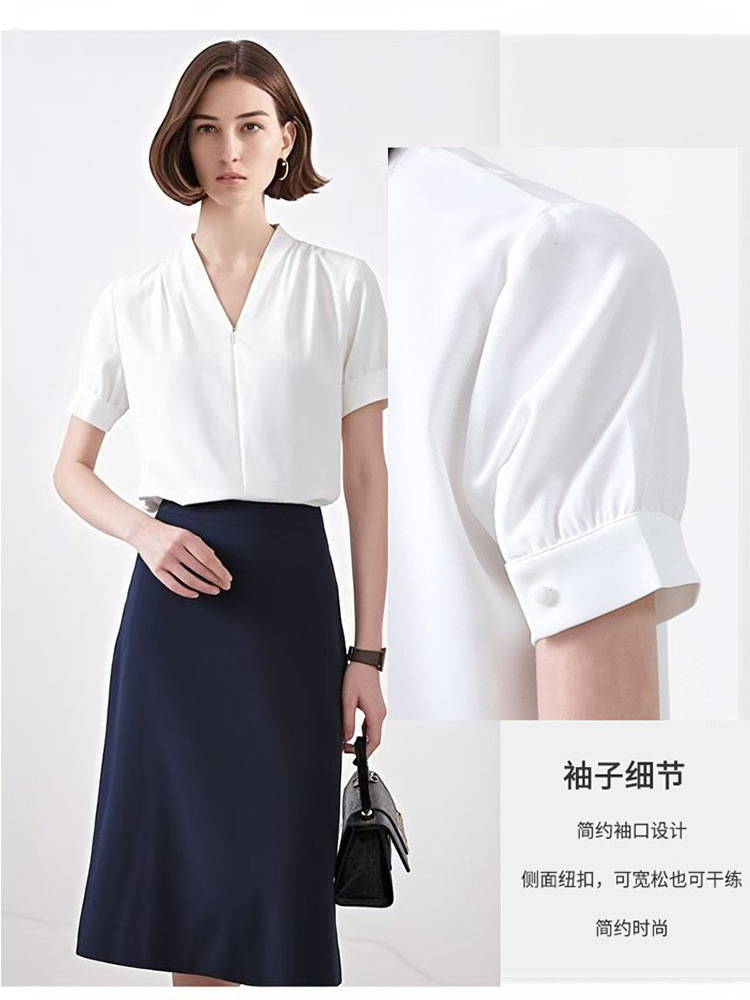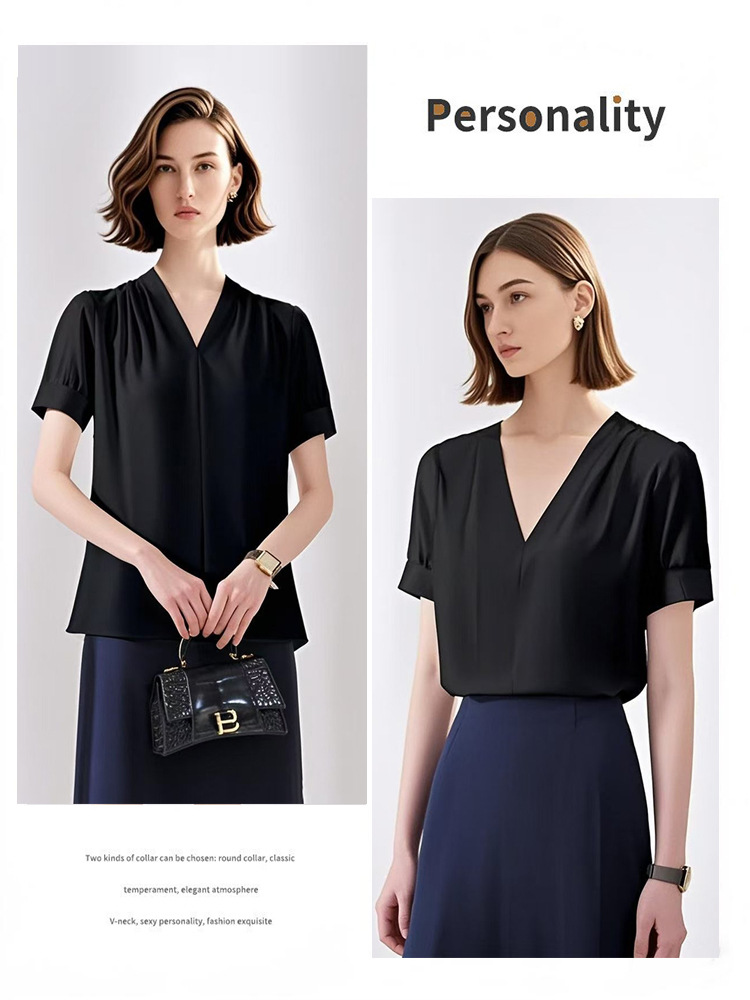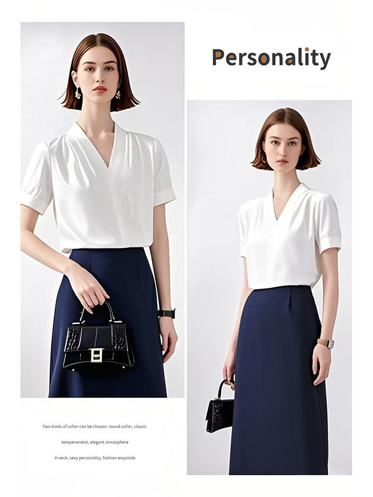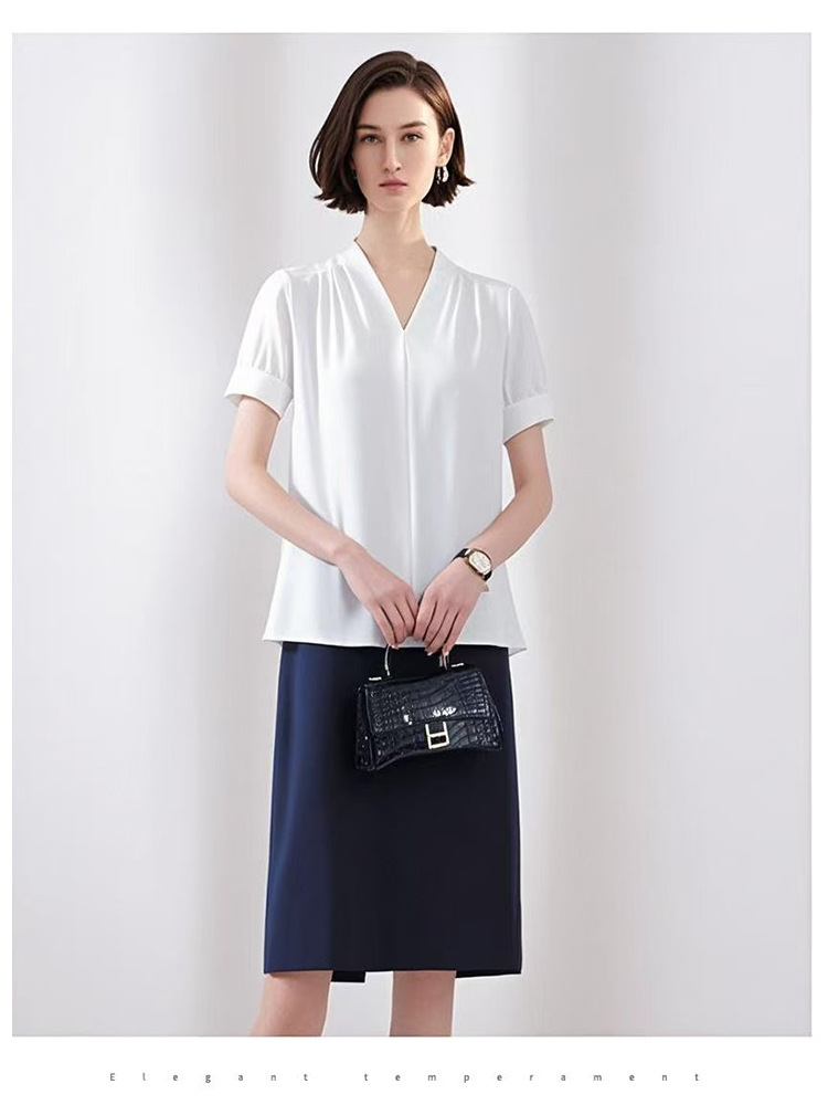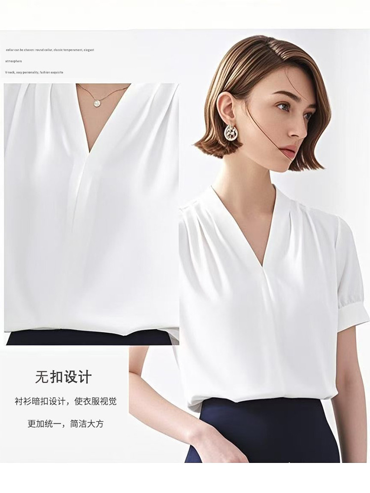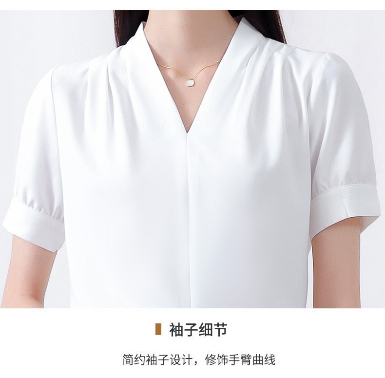 여름 여성용 화이트 쉬폰 브이넥 반팔 셔츠, 고급스럽고 전문적인 기질, 통근 드레이프, 패셔너블하고 활용도가 높은 탑