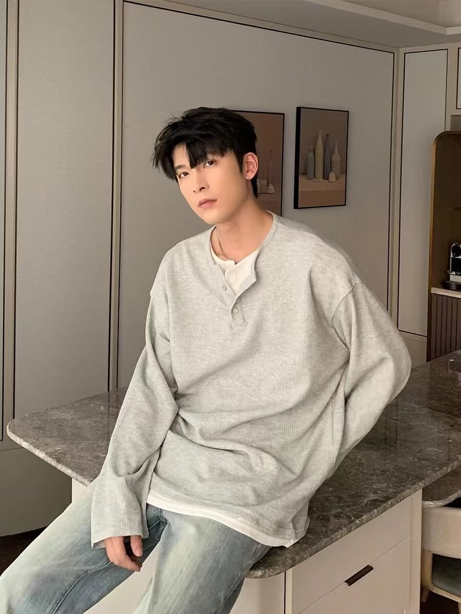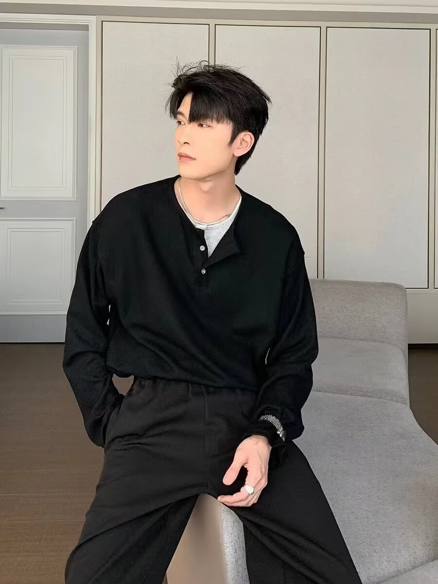 일본 헨리 칼라 긴팔 티셔츠 솔리드 컬러 남성 가을 신작 캐주얼 루즈 한국 스타일 하이 엔드 심플 패션 티셔츠