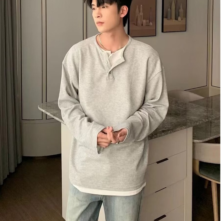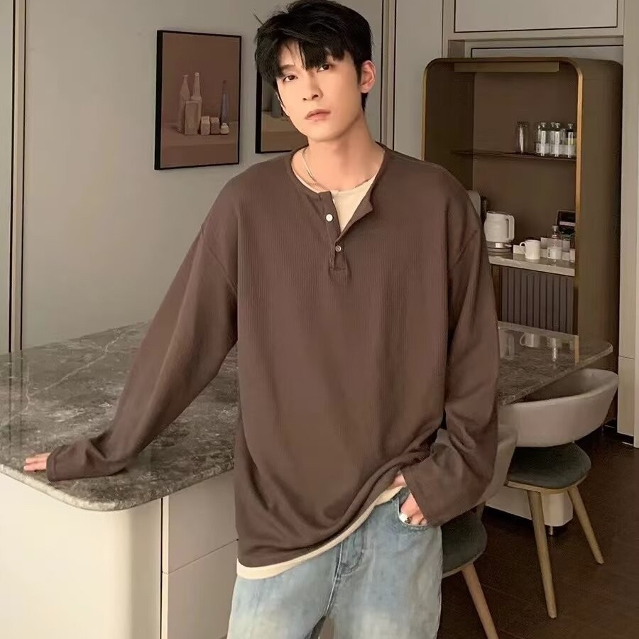 일본 헨리 칼라 긴팔 티셔츠 솔리드 컬러 남성 가을 신작 캐주얼 루즈 한국 스타일 하이 엔드 심플 패션 티셔츠스토어 가기