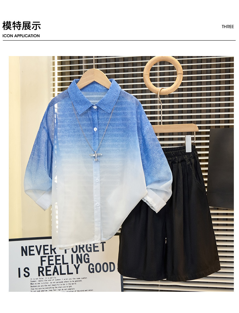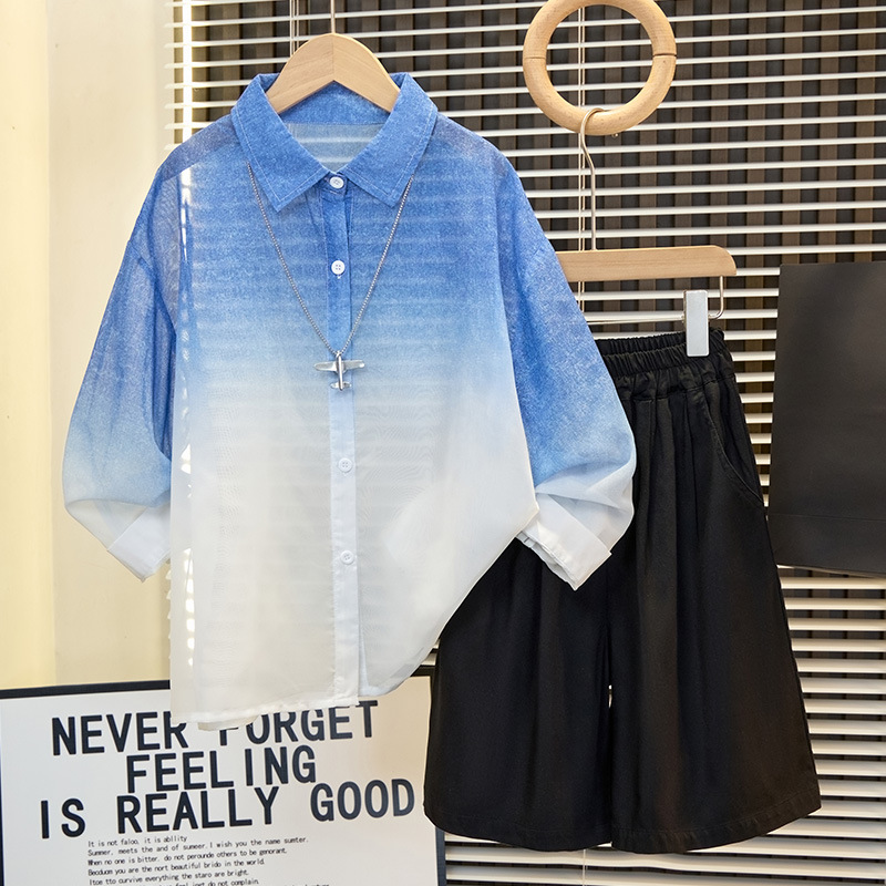 소년 그라디언트 셔츠 정장 2025 여름 새로운 스타일 중대형 어린이 느슨한 패션 파란색과 흰색 도자기 셔츠 캐주얼 반바지