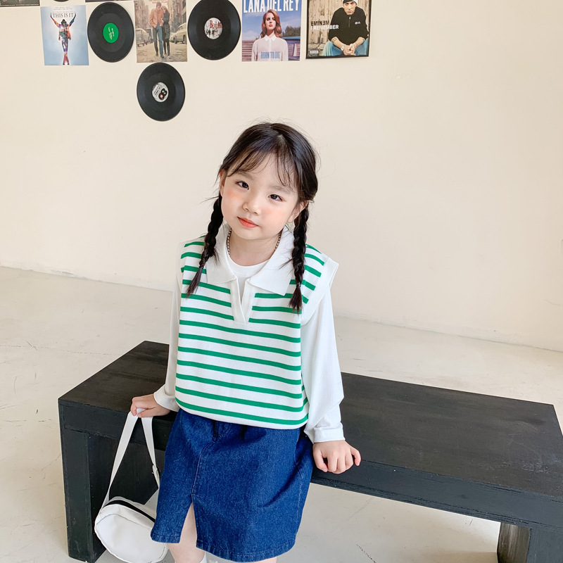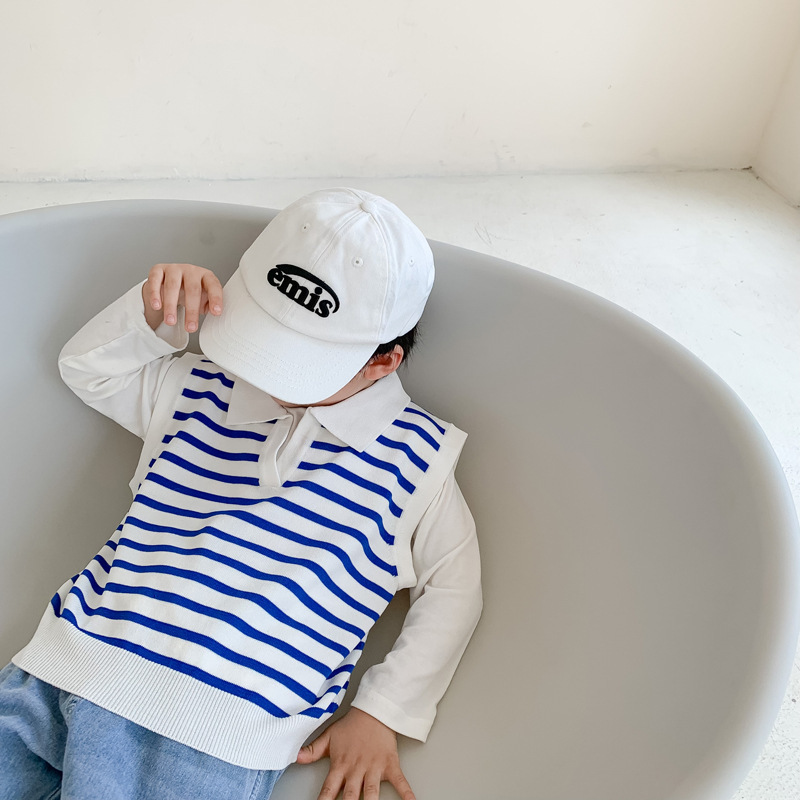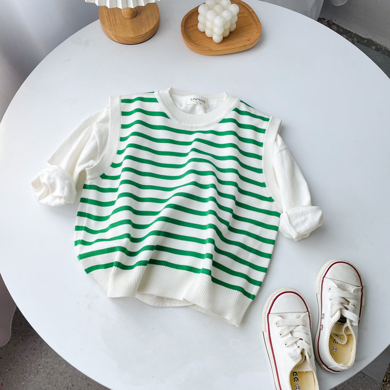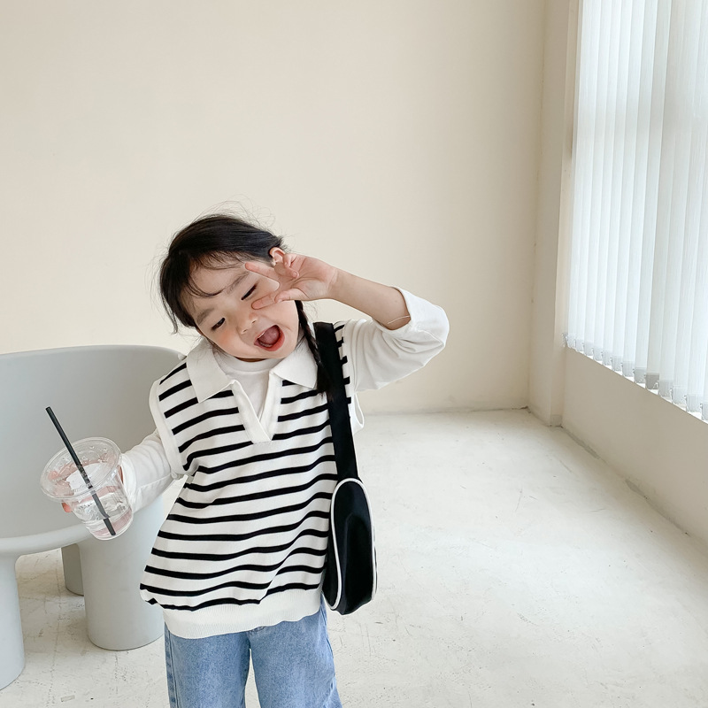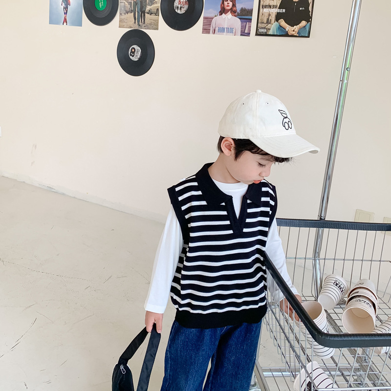 [클리어아웃 불가] 봄, 가을 아동용 니트 브이넥 조끼 소년 소녀 스웨터 스트라이프 라펠 조끼스토어 가기