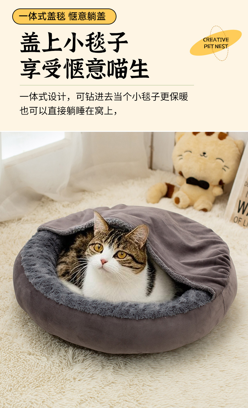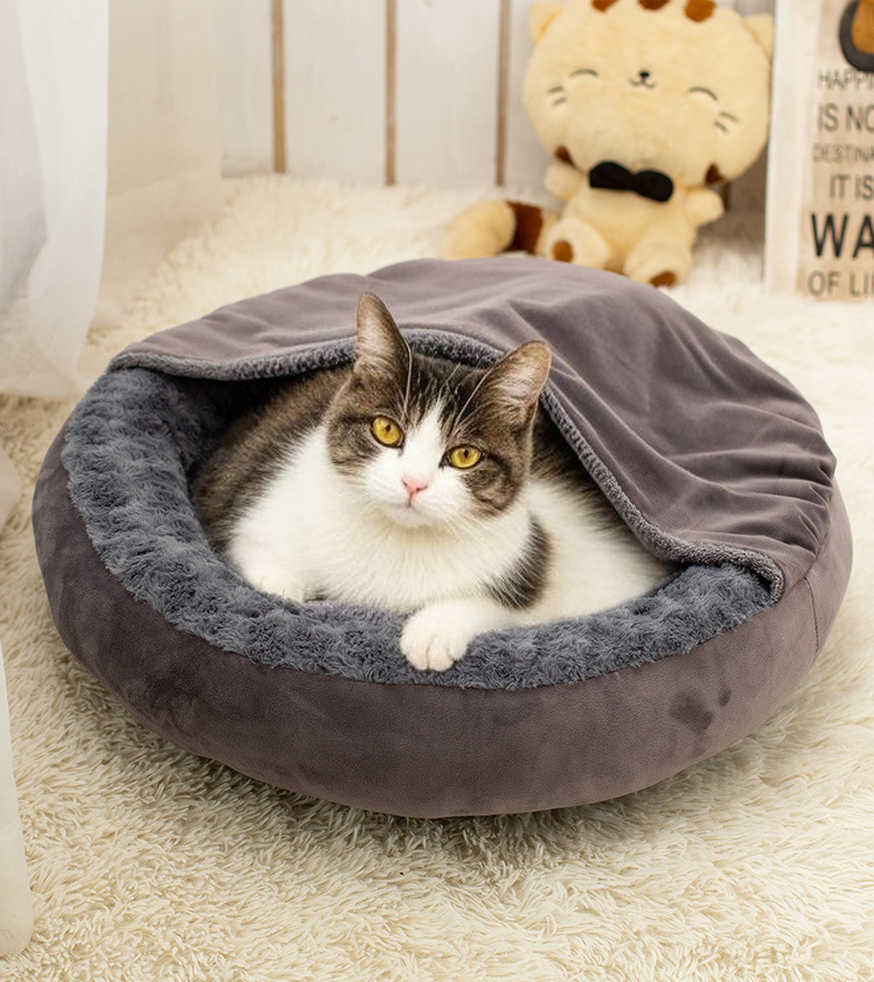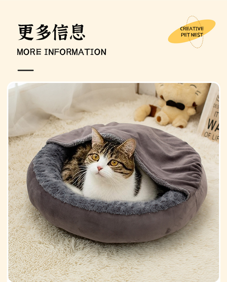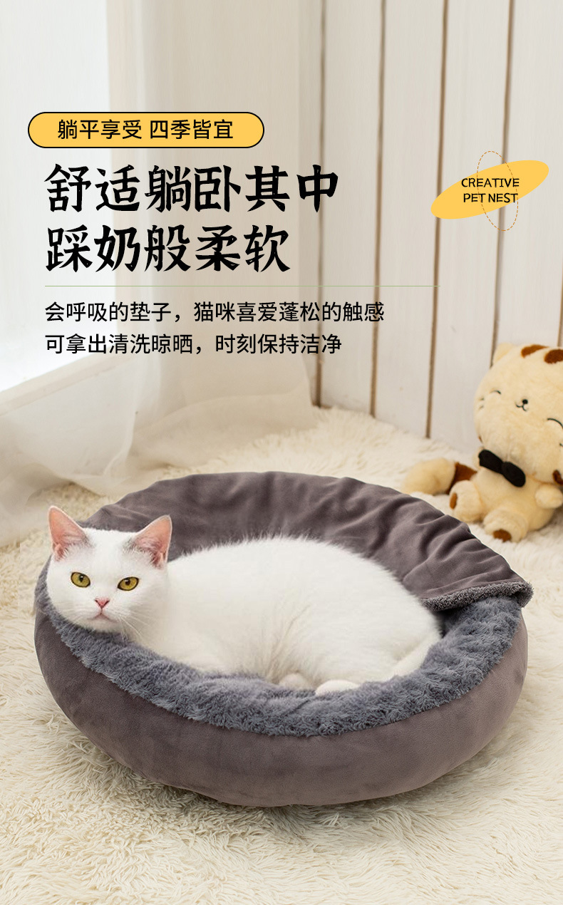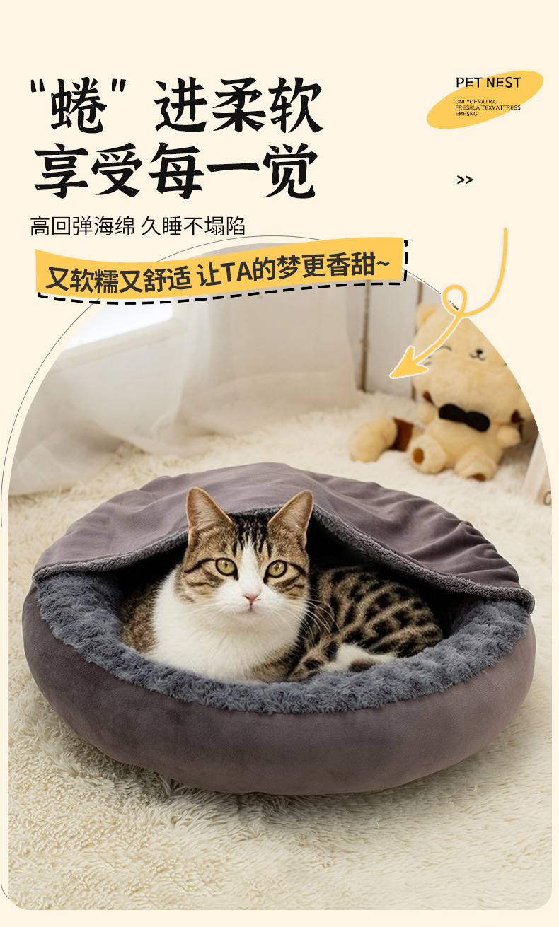 사계절용 애완동물 침대매트, 두꺼운 벨벳 원형 쉘형 침대, 대형 고양이 침대, 강아지 침대, 반밀폐형 고양이 침대
