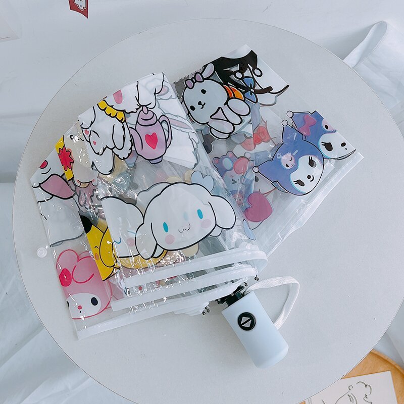 만화 산리오 투명 우산, 학생용 완전 자동 긴 손잡이 우산, 투명 접이식, 여학생, 비가 오나 눈이 오나